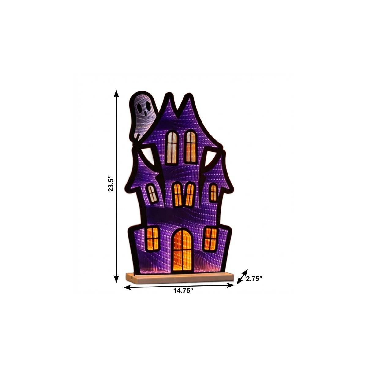 This 24-inch black orange and purple acrylic house halloween ghost tabletop sign with led is a perfect way to celebrate and decorate for the fall season. Led light provides an illuminating effect that adds to the decorative appeal of this special piece. It's a perfect addition for those who love an up-to-the-minute look and feel. 23.50-inch h x 14.75-inch w x 2.75-inch d.