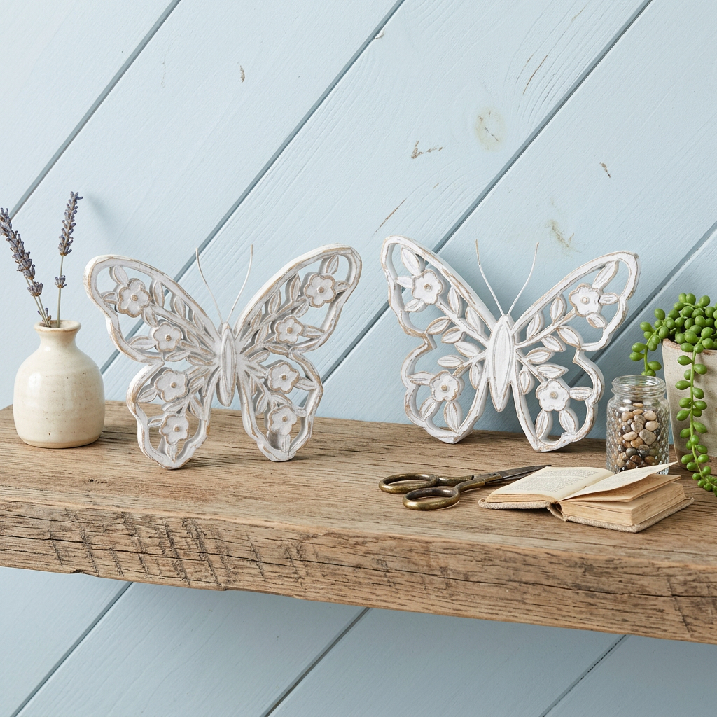 This set of two white and beige polyresin butterfly tabletop sculptures will add a beautiful decorative accent to your decor. This nature inspired butterfly sculpture pair will be a great addition to your space. Featuring carved etched textural detailing and a rustic, white washed distressed finish, these pretty shelf sitters make some fun casual decorative accents for most any space. Great to use on their own or mix with other decorations for the perfect look. This pretty butterfly brings a touch of elegance and some outdoor beauty to your space. 5.50-inch h x 7.00-inch w x 1.00-inch d.