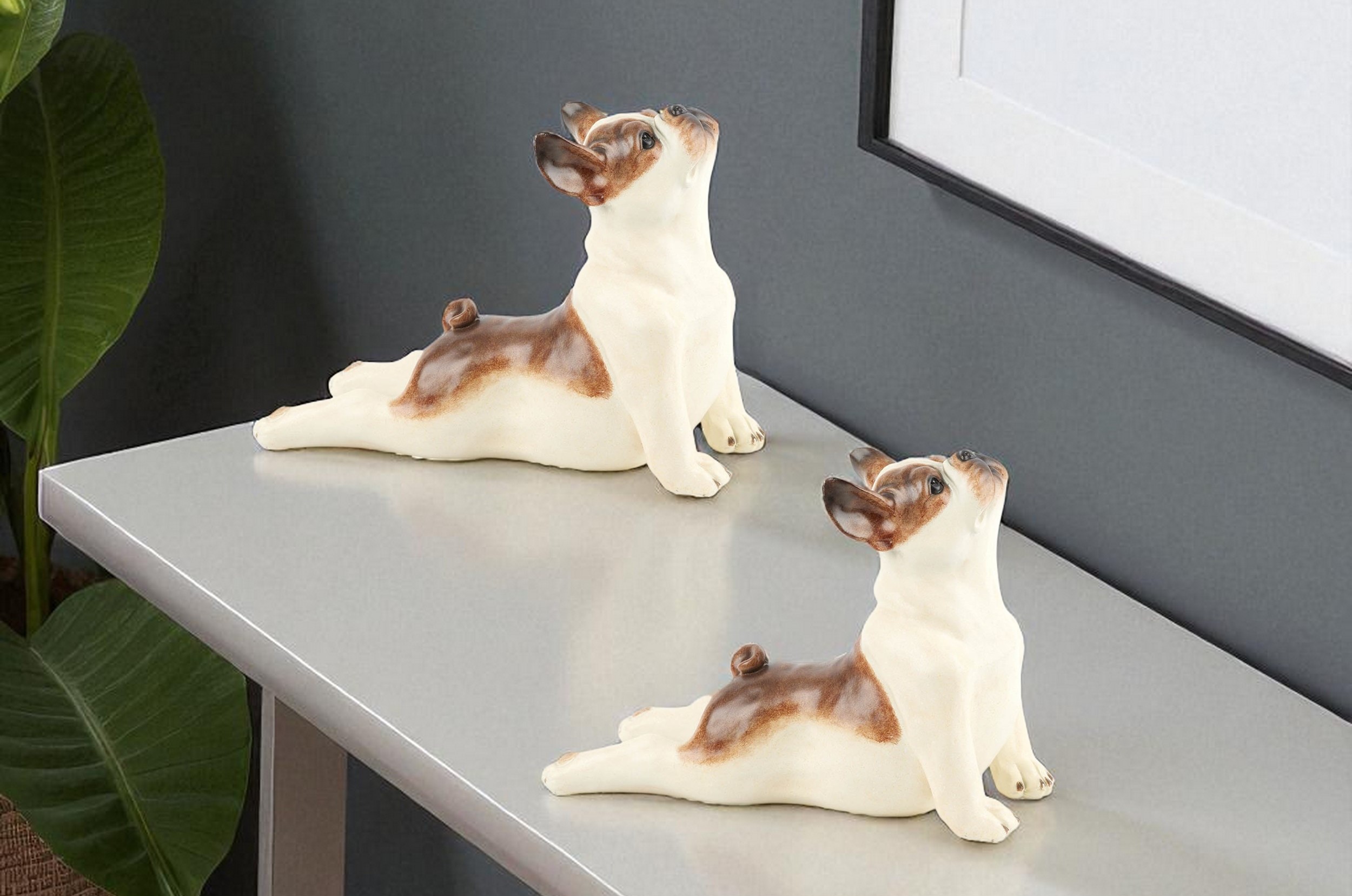 Unique and decorative, this set of two white and brown polyresin dog tabletop sculpture will leave a lasting impression. This figurine makes a great tabletop accent for your coffee table, counter, bookshelf, mantle, or even dining table. A perfect decorative addition for anyone who loves a stylish look and feel. This great dog accent is a great reminder of man's best friend. Great to use on its own or mix with other decorations for the perfect look. 10.75-inch h x 14.40-inch w x 6.40-inch d.
