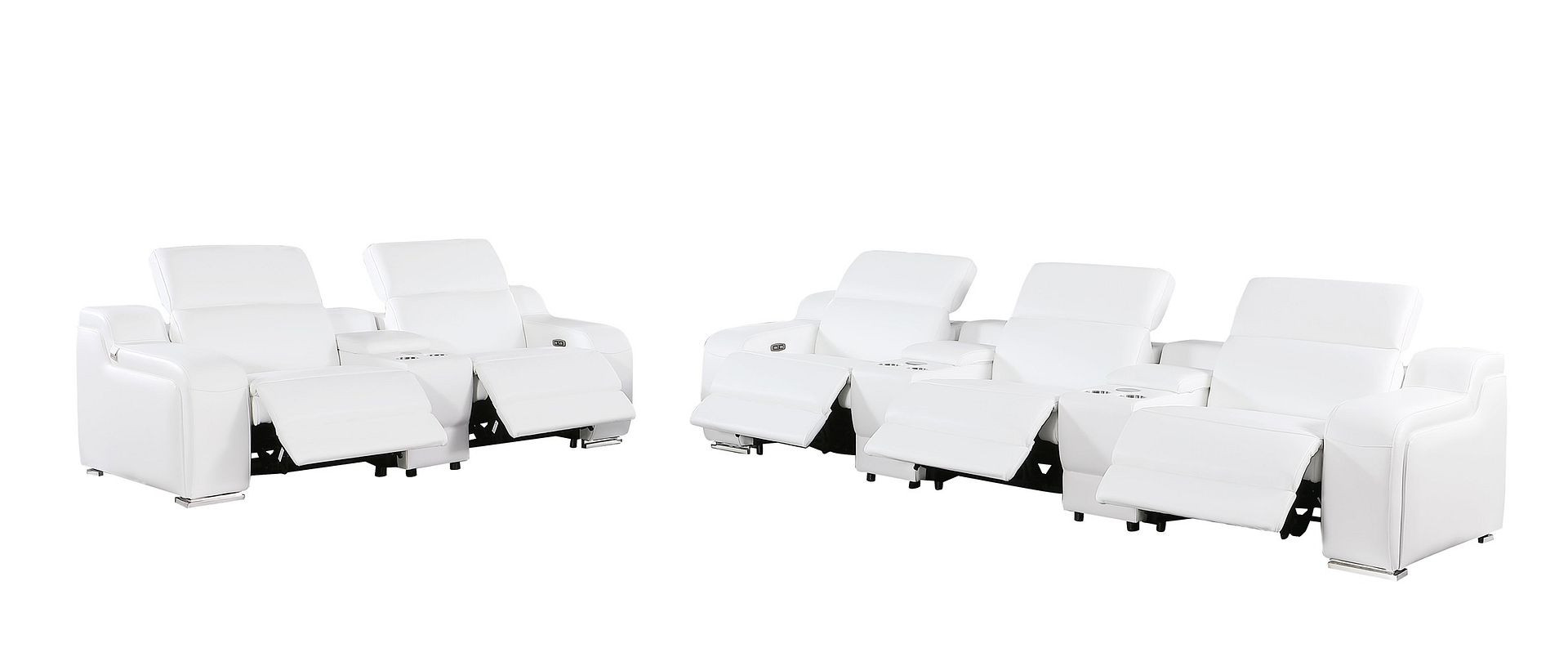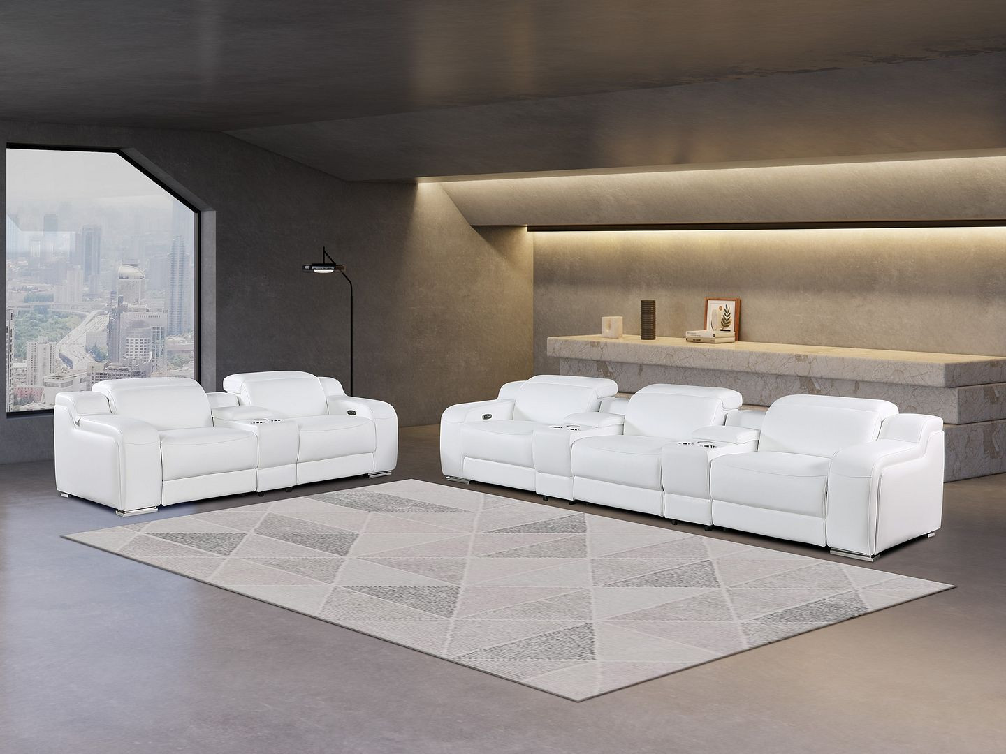 When it comes to indoor seating, this two piece white leather five person seating set has everything you need to get set and ready to relax. The reclining sofa will transform your space into a cozy haven for leisurely activities, movie nights, or even quick power naps. Upholstered in supple and luxurious leather, this set has a rich and warm appeal. Pocket spring seat construction provides excellent comfort by offering a responsive and supportive seating experience. The inclusion of a loveseat into your mix allows a fashionable seating option in a compact design. Enjoy the added convenience and security of storage, providing a space to store everyday essentials within easy reach. 39.00-inch h x 129.00-inch w x 41.00-inch d.