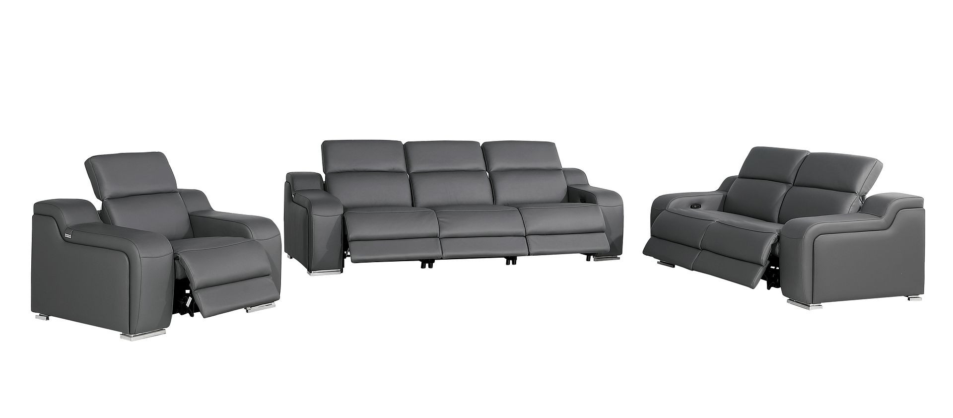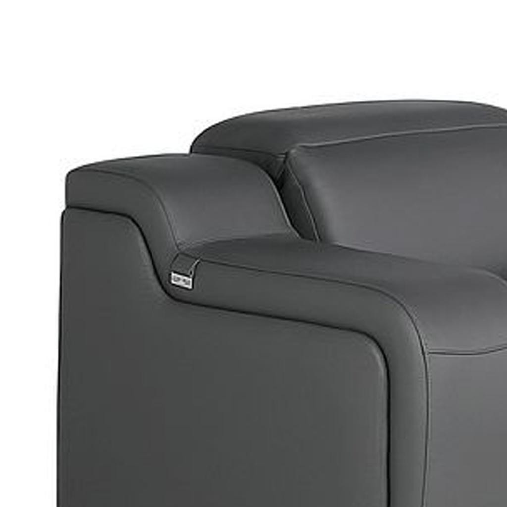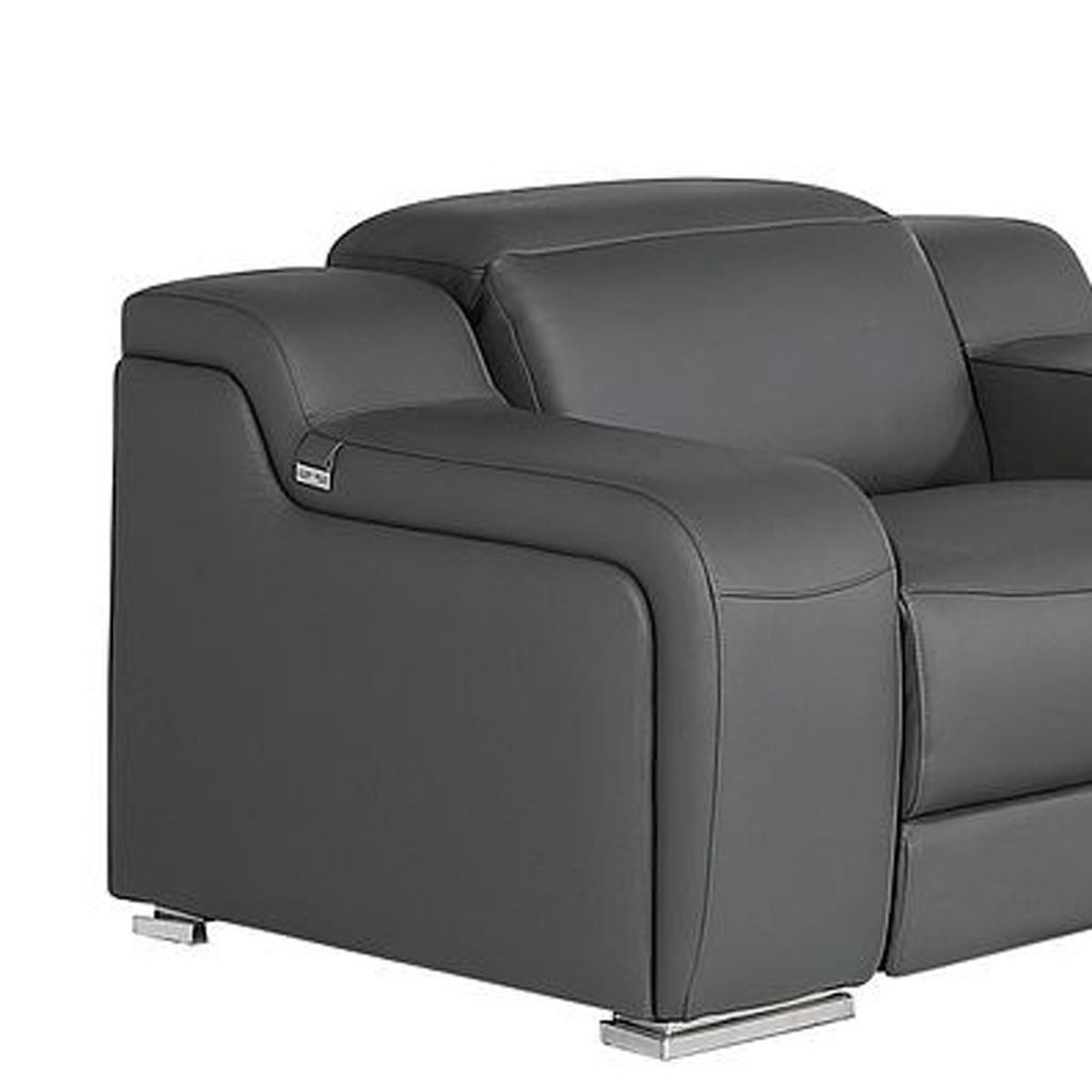 Prepare to amaze even the most discerning critics with our three piece dark gray leather six person seating set. Prepare to enter the realm of ultimate relaxation with this reclining sofa that offers unparalleled comfort and luxurious lounging. Upholstered in supple and luxurious leather, this set has a rich and warm appeal. The presence of pocket spring seat construction helps distribute weight evenly, reducing pressure points. The inclusion of a loveseat into your mix allows a fashionable seating option in a compact design. 39.00-inch h x 103.00-inch w x 41.00-inch d.