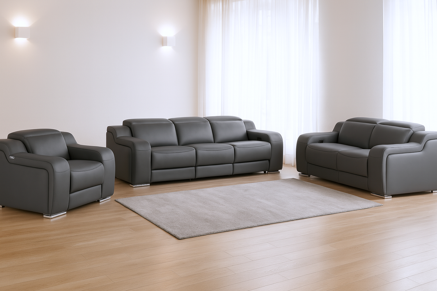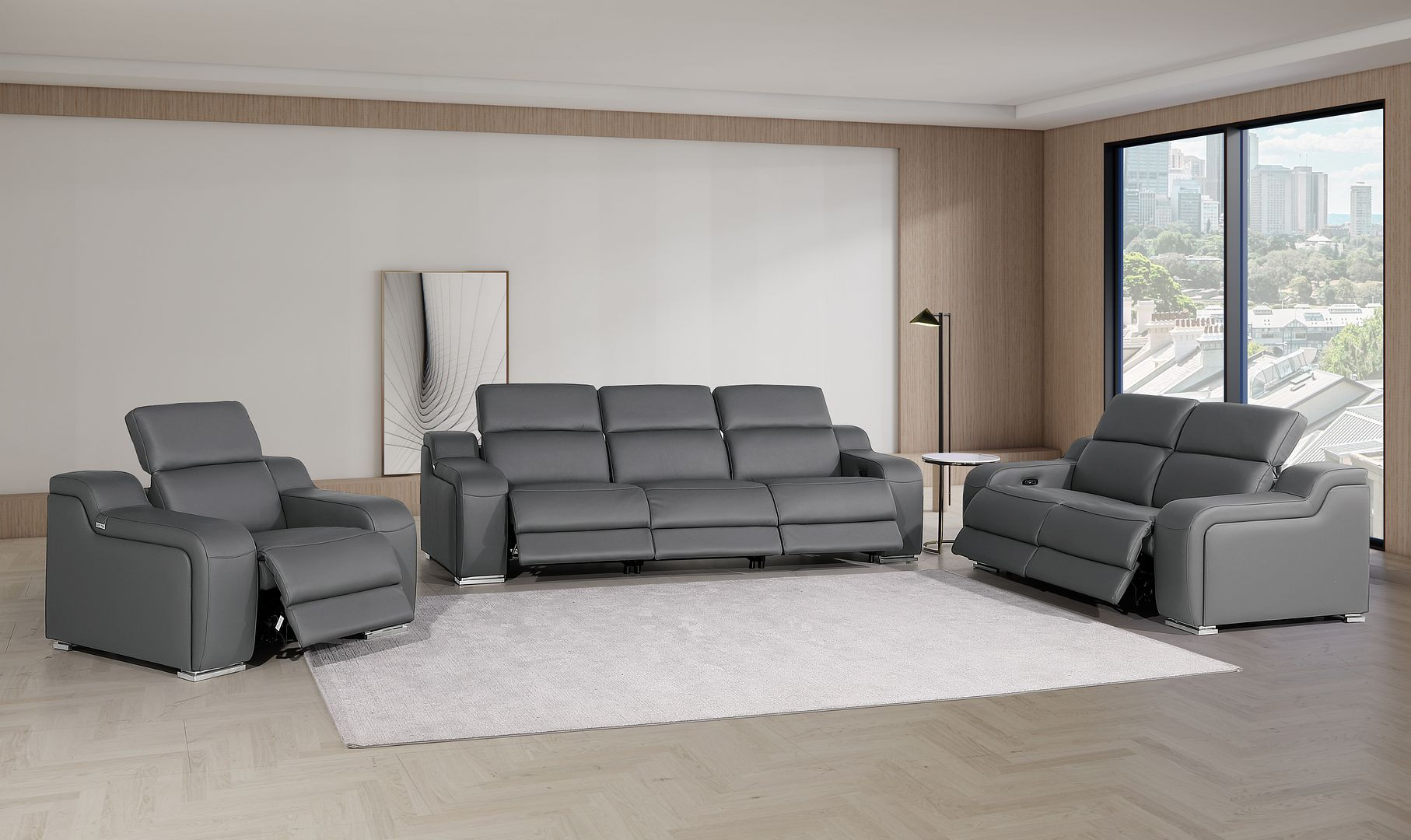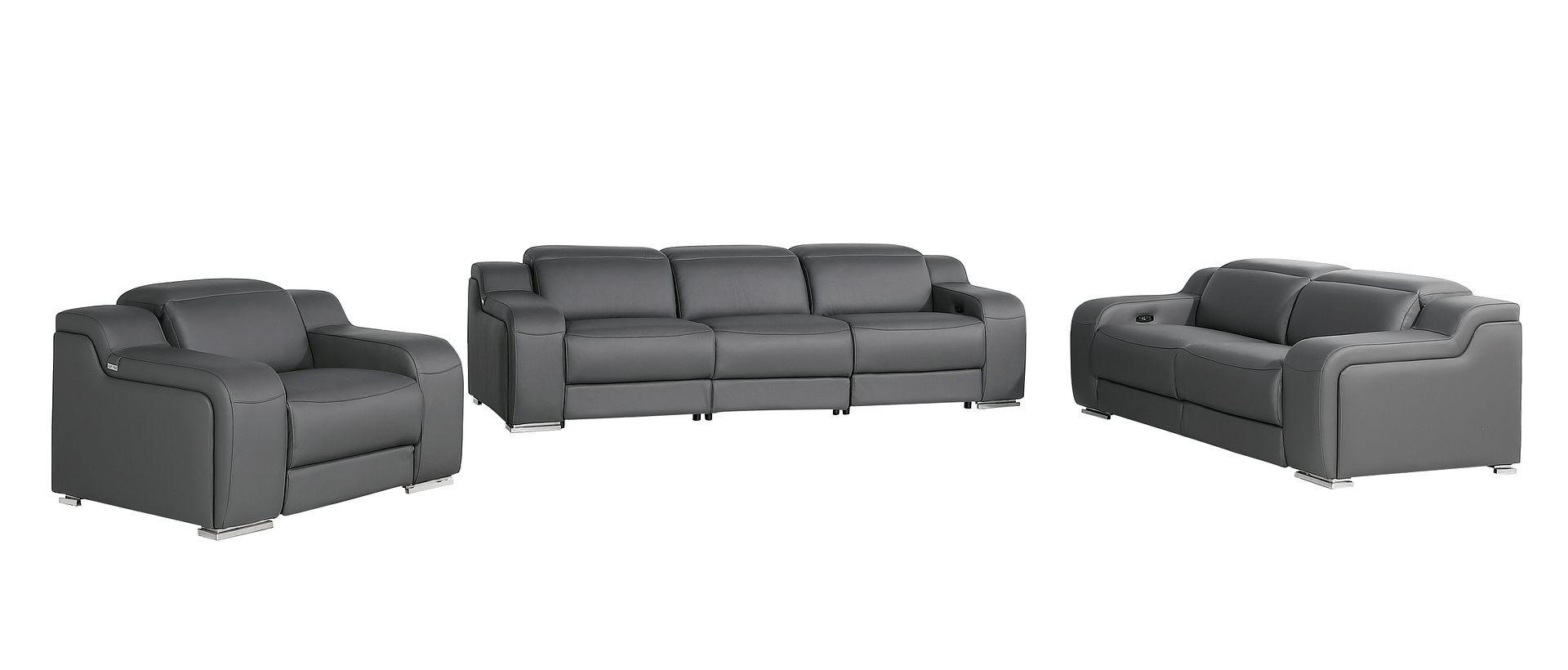 Prepare to amaze even the most discerning critics with our three piece dark gray leather six person seating set. Prepare to enter the realm of ultimate relaxation with this reclining sofa that offers unparalleled comfort and luxurious lounging. Upholstered in supple and luxurious leather, this set has a rich and warm appeal. The presence of pocket spring seat construction helps distribute weight evenly, reducing pressure points. The inclusion of a loveseat into your mix allows a fashionable seating option in a compact design. 39.00-inch h x 103.00-inch w x 41.00-inch d.