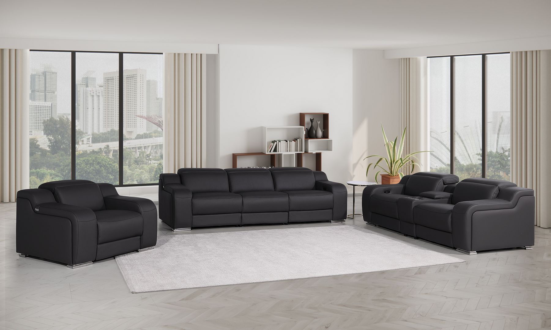 Step into a world of unparalleled seating comfort with our remarkable three piece black leather six person seating set. Prepare to enter the realm of ultimate relaxation with this reclining sofa that offers unparalleled comfort and luxurious lounging. Upholstered in supple and luxurious leather, this set has a rich and warm appeal. The presence of pocket spring seat construction helps distribute weight evenly, reducing pressure points. The inclusion of a loveseat into your mix allows a fashionable seating option in a compact design. Enjoy the added convenience and security of storage, providing a space to store everyday essentials within easy reach. 39.00-inch h x 103.00-inch w x 41.00-inch d.