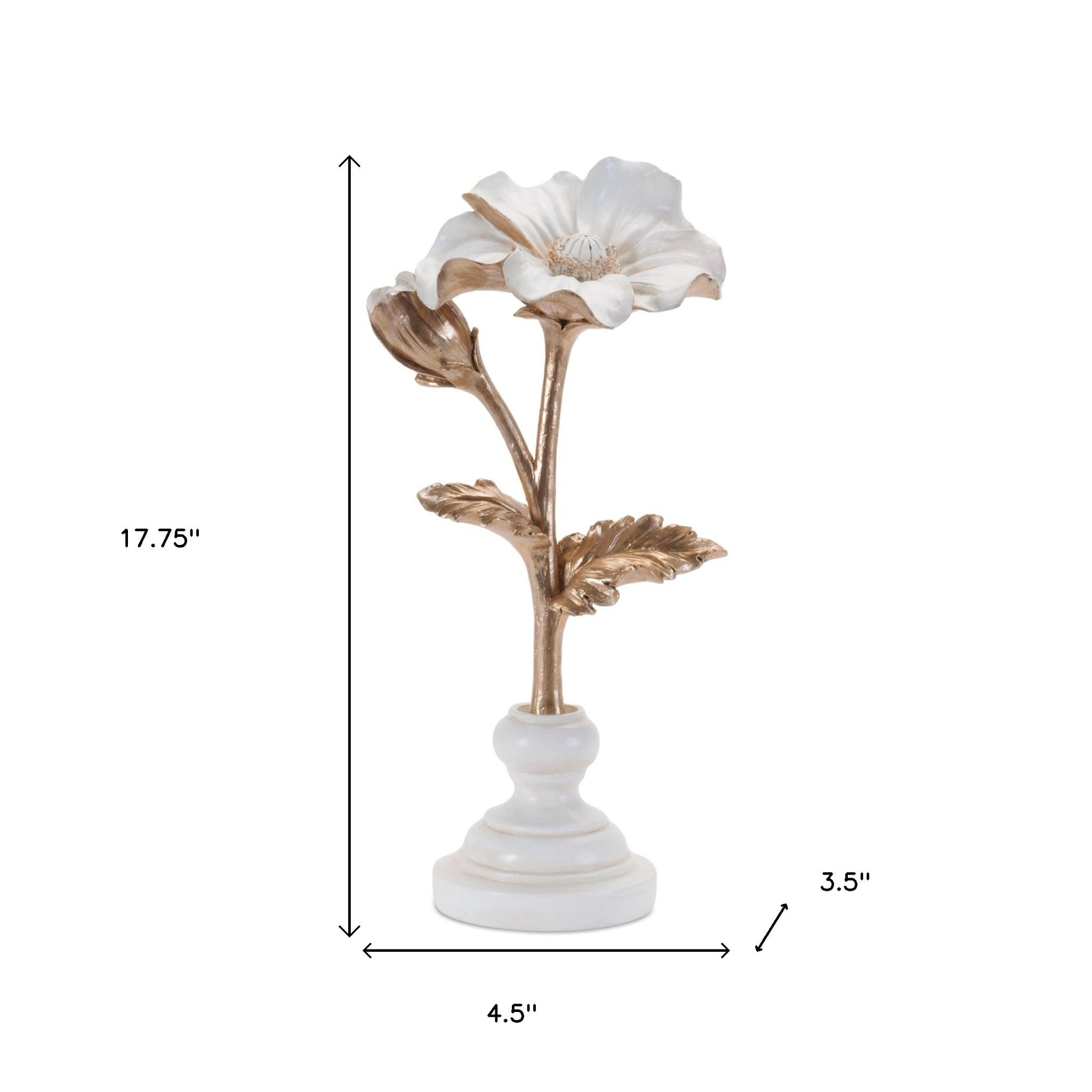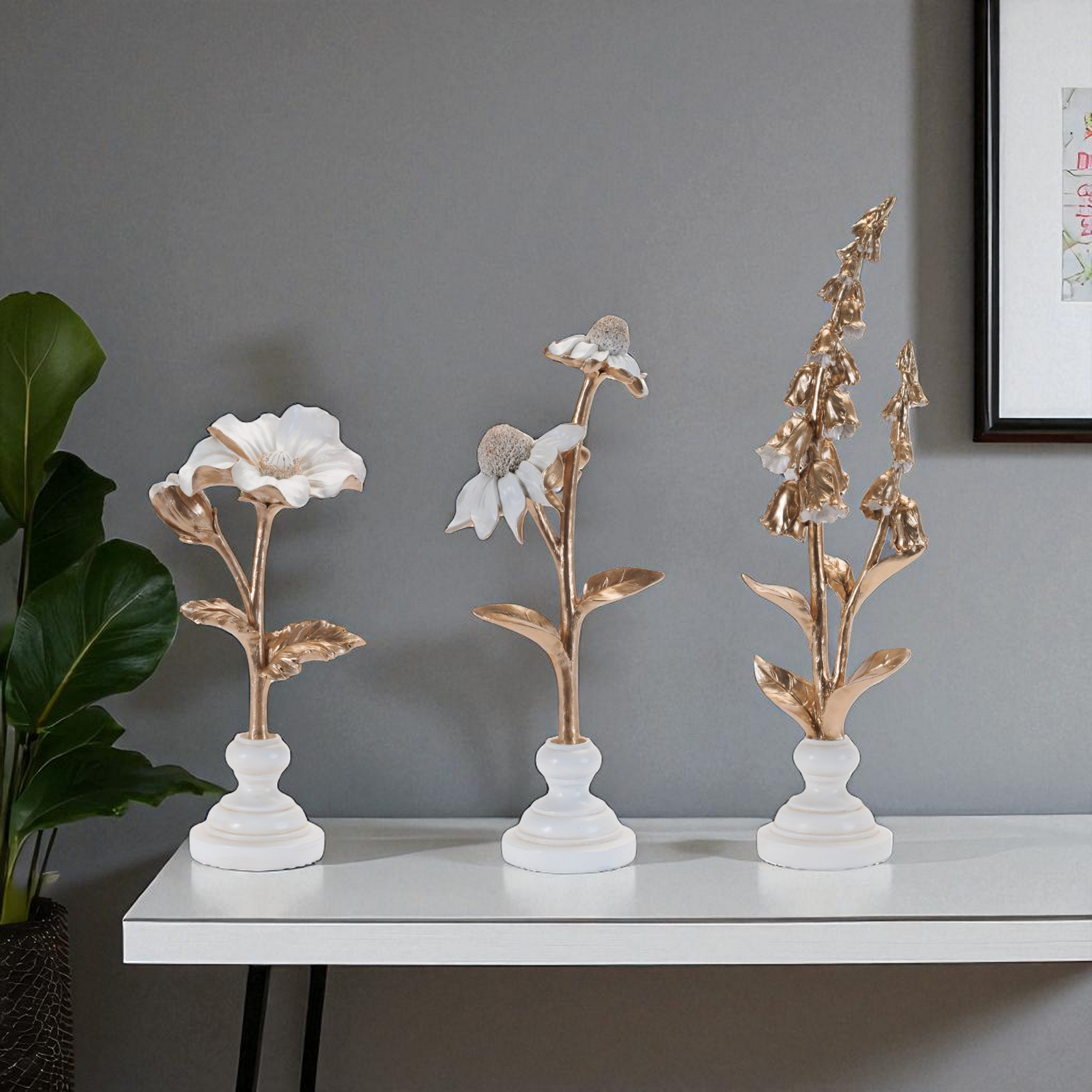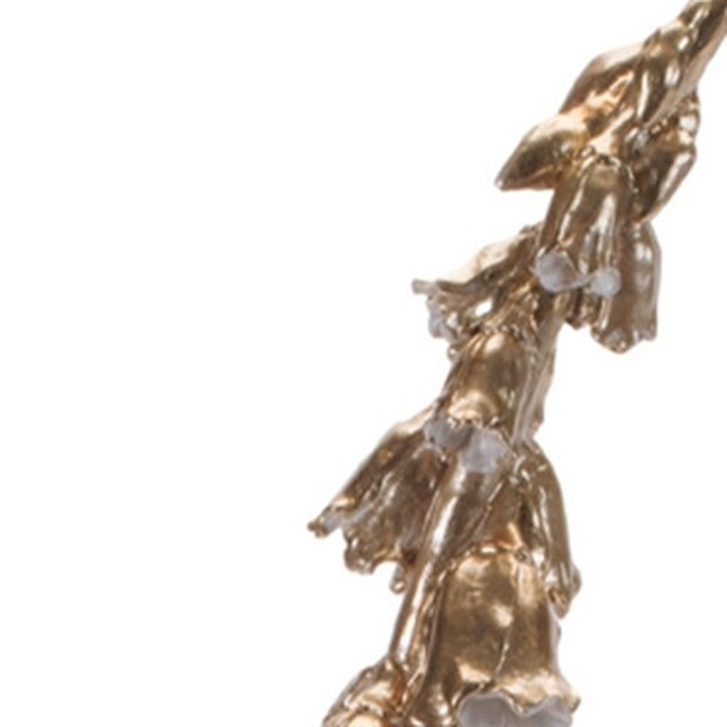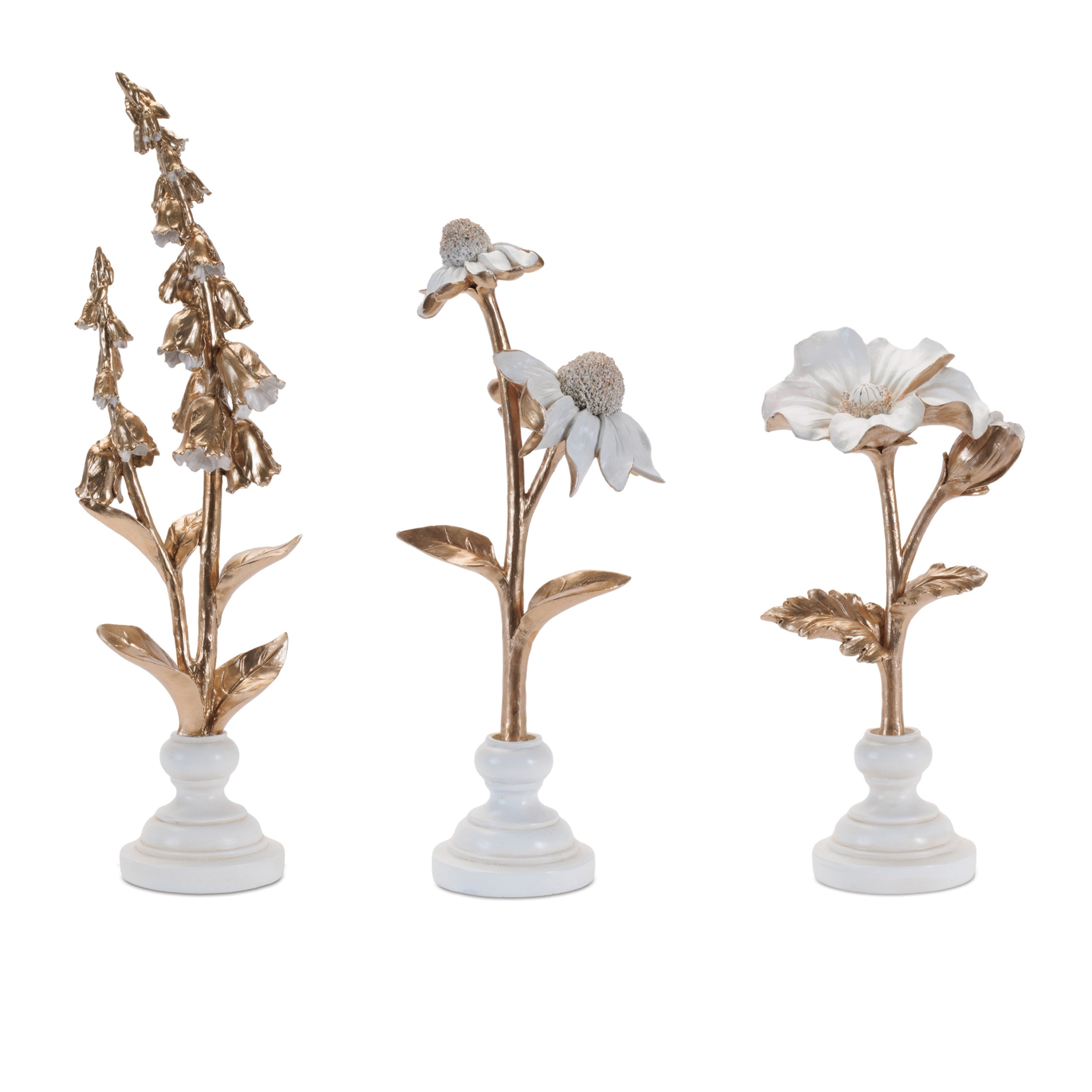Unique and decorative, this set of three gold and white ceramic tabletop sculpture will leave a lasting impression. Each piece showcases exquisite craftsmanship, adding a modern touch to any space. The elegant combination of gold and white hues enhances its visual appeal, making it a versatile addition to various decor styles. Perfect for enhancing your interior, these sculptures can be displayed together for a cohesive look or separately to create interesting focal points throughout your home. The durable ceramic material ensures longevity while maintaining its stunning appearance. 17.75-inch h x 4.50-inch w x 3.50-inch d.