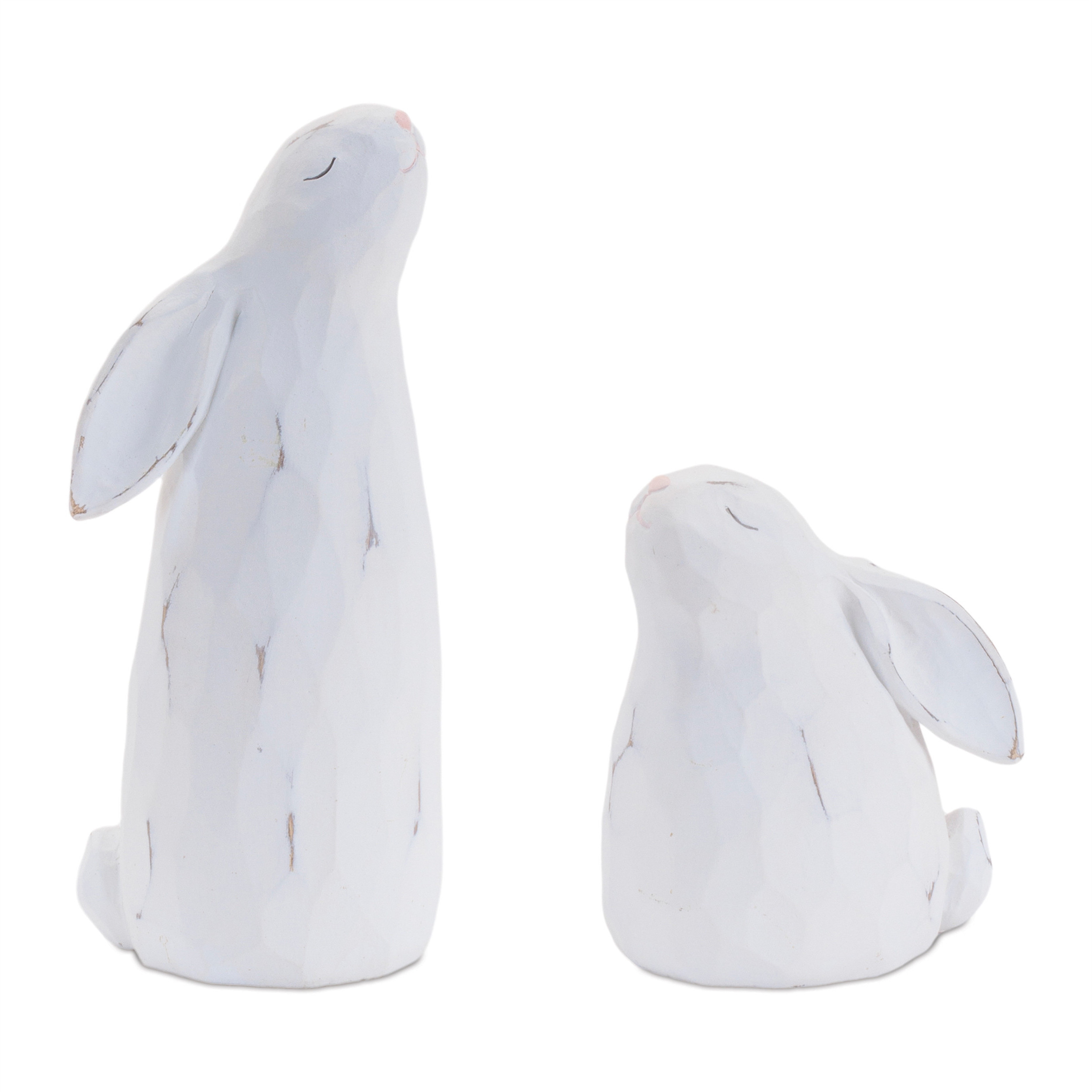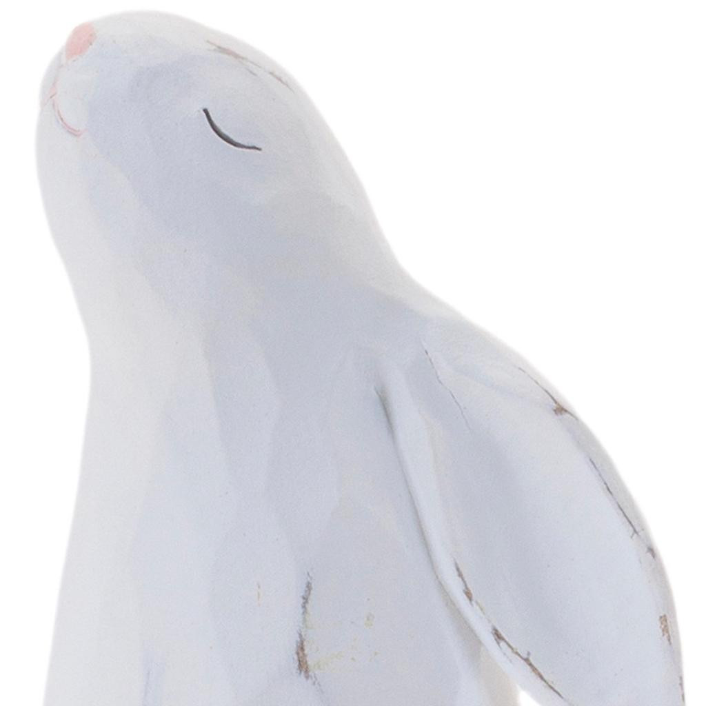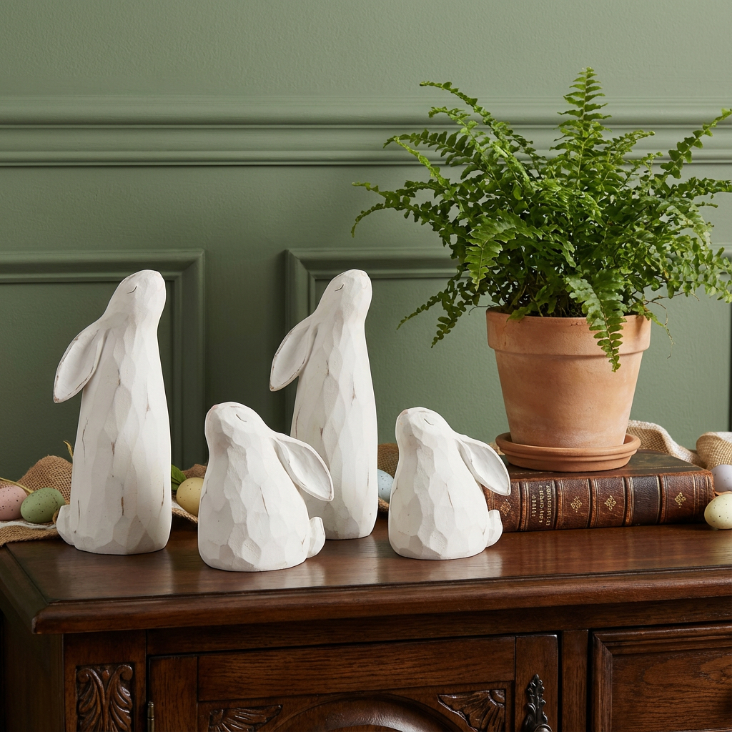 Unique and decorative, this set of four white resin bunny rabbit figurine will leave a lasting impression. Update your room with this set of carved bunnies that bring some whimsey and woodland nature to your decor. Each bunny features facets and carved details and a cute pink nose. Use them to decorate for Easter or add a cute outdoorsy vibe all year long. 8-inch h x 3.5-inch w x 2.75-inch d.