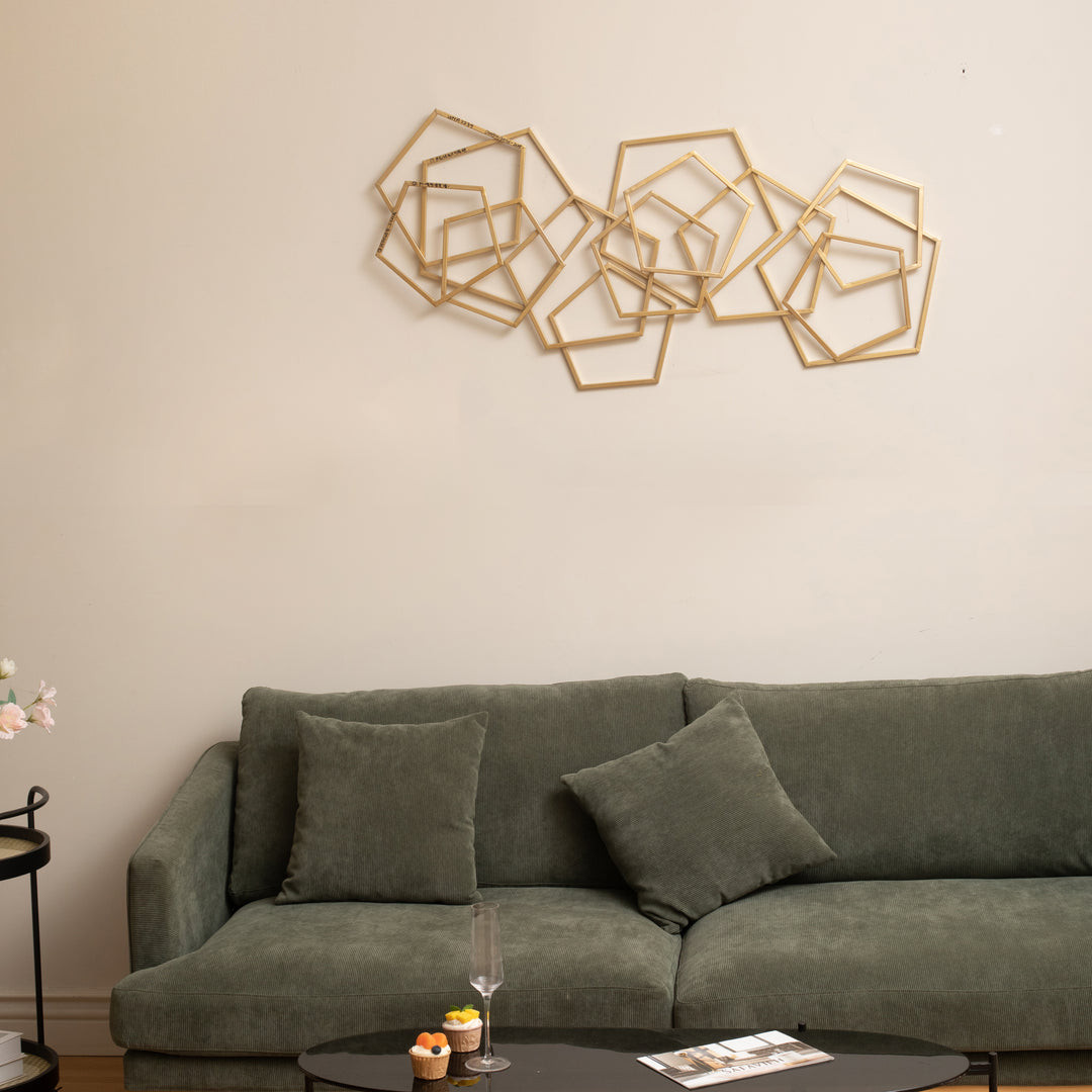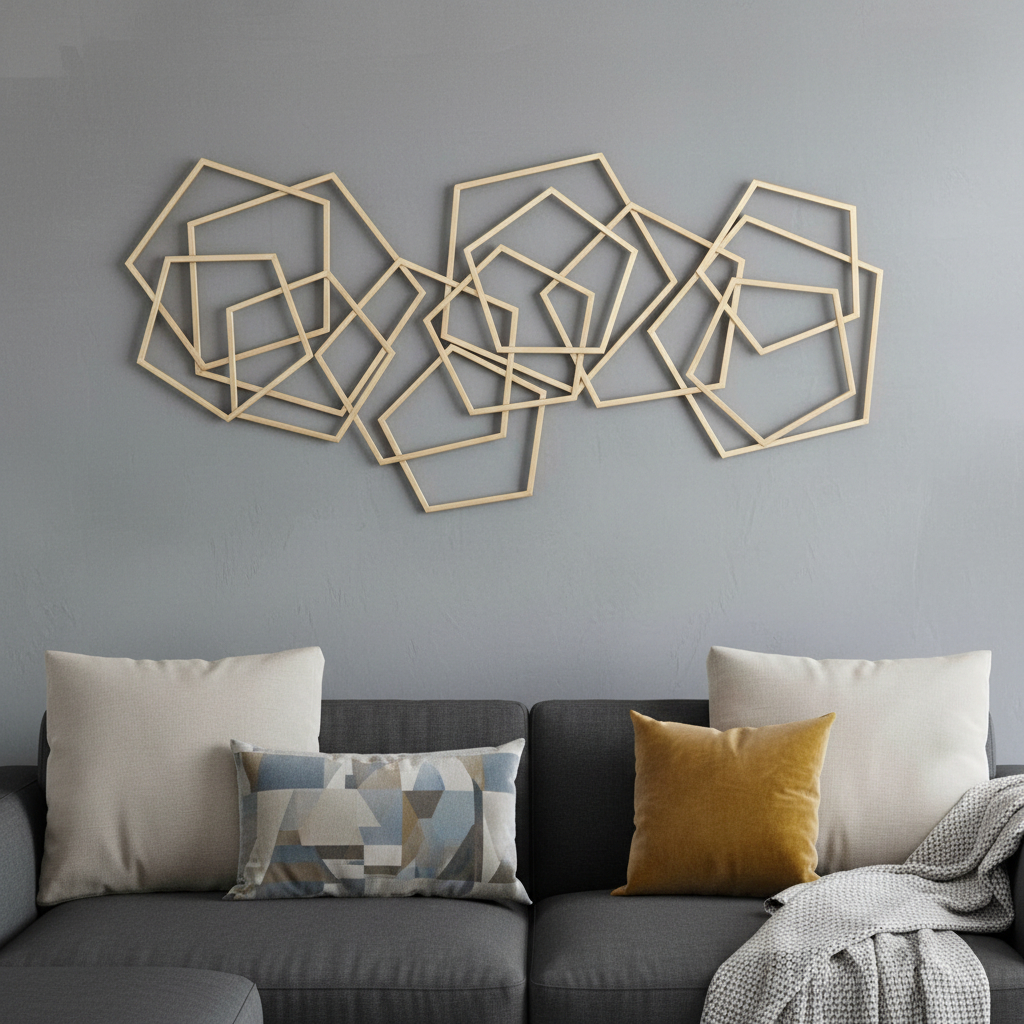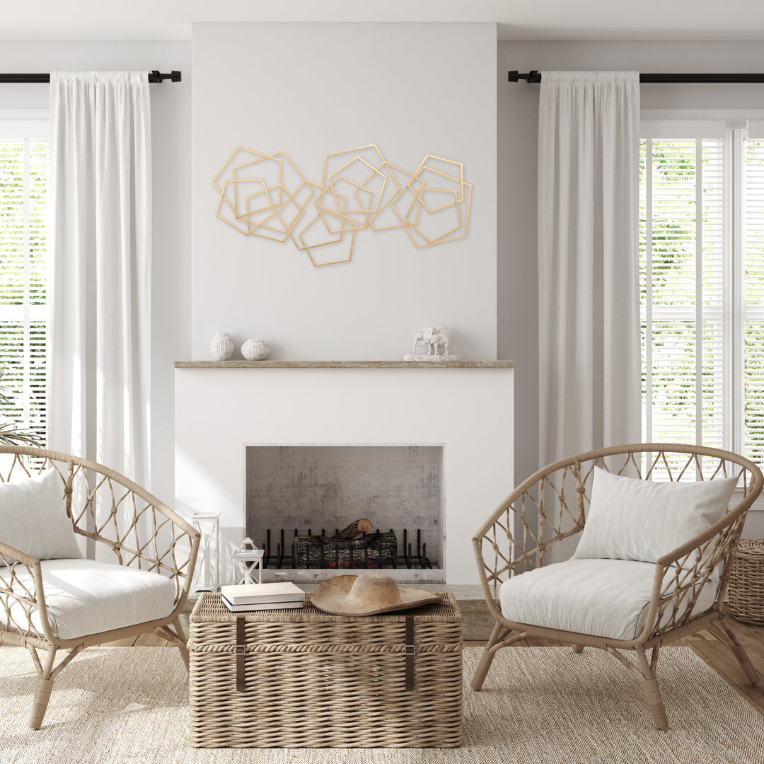 Handmade with care, this piece brings some authenticity to your space. Crafted from durable metal, this modern hanging dimensional sculpture adds a unique touch to your decor. This hand crafted piece features a modern and intricate overlapping geometric design that showcases the artisan's skill and attention to detail, ensuring that each piece is truly one-of-a-kind. Its horizontal orientation allows for versatile placement on any wall, making it an eye-catching focal point for your living area or office. Elevate your home with this stunning artwork that transforms any wall from a blank canvas into a statement of creativity. 24.00-inch h x 47.75-inch w x 1.50-inch d.