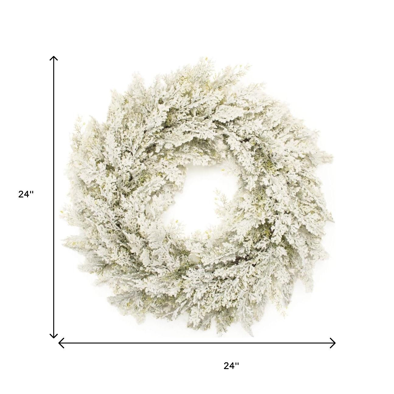 Add a touch of winter wonderland with this heavily snow dusted artificial wreath. This stunning circle-shaped wreath features a classic pine design with lots of white faux snow flocking that adds a touch of elegance to any indoor space. Crafted from durable plastic, it promises long-lasting beauty without the fuss of maintenance. The versatile look allows it to complement a variety of decor styles, enhancing your living area or entryway. 24-inch h x 24-inch w x 6.5-inch d.