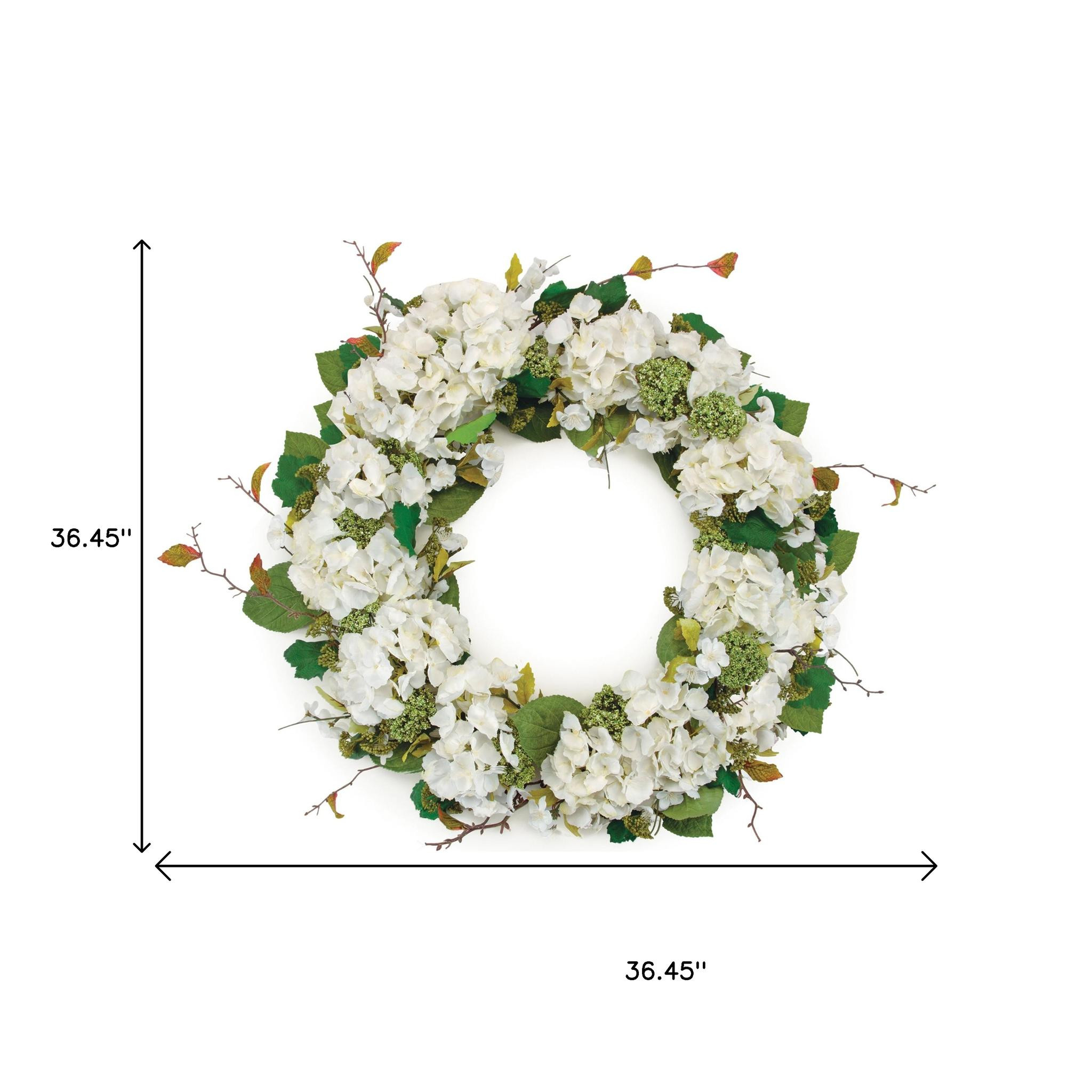 This gorgeous wreath is loaded with artificial florals that ensure it will last for multiple seasons. This lovely wreath makes a wonderful gift and is sure to brighten someone's day. Crafted in a traditional style, this circular wreath features realistic hydrangea accented by sedum with twig elements that add a touch of nature to your decor. Perfect for indoor spaces, it enhances the ambiance of any room. With its durable plastic construction, this wreath promises longevity and charm. The 7-inch hole diameter allows for easy hanging on various hooks or fixtures throughout your home. 36.45-inch h x 36.45-inch w x 7.45-inch d.