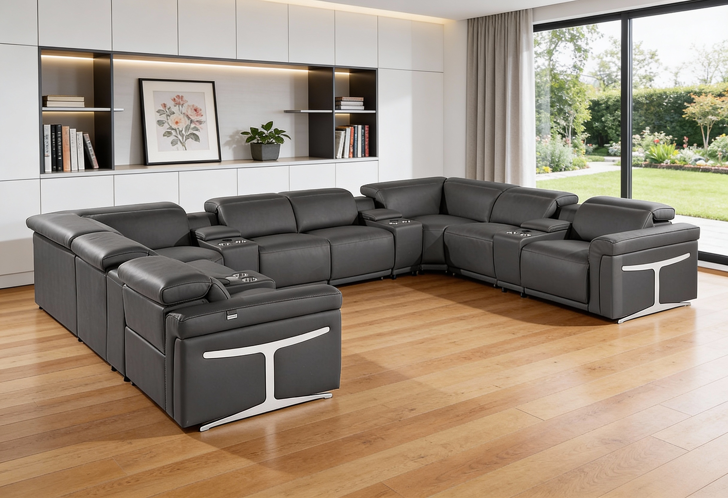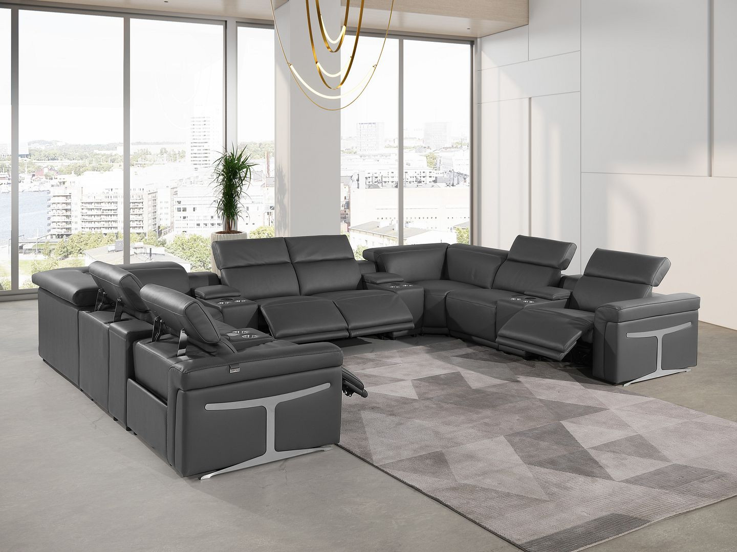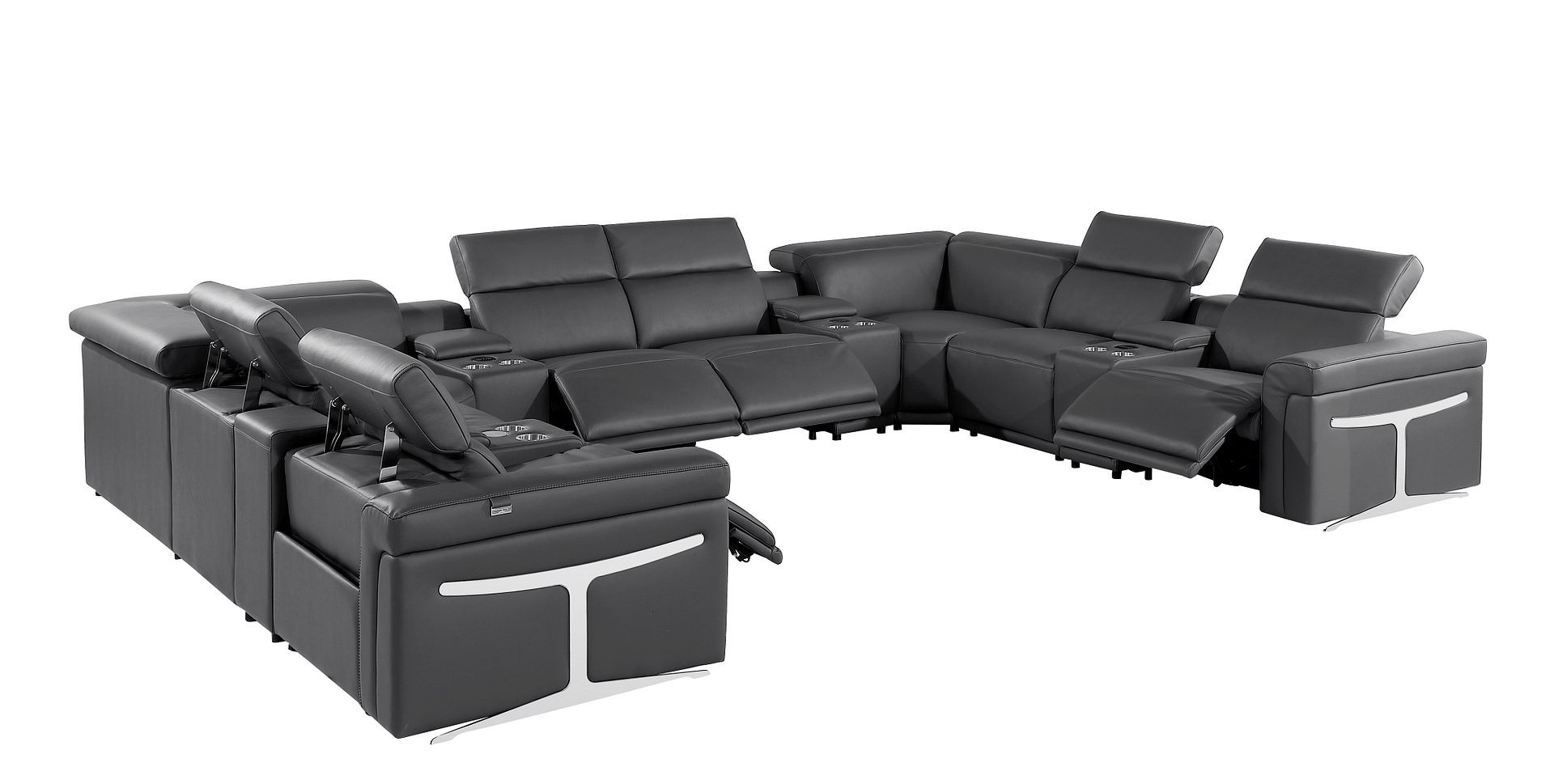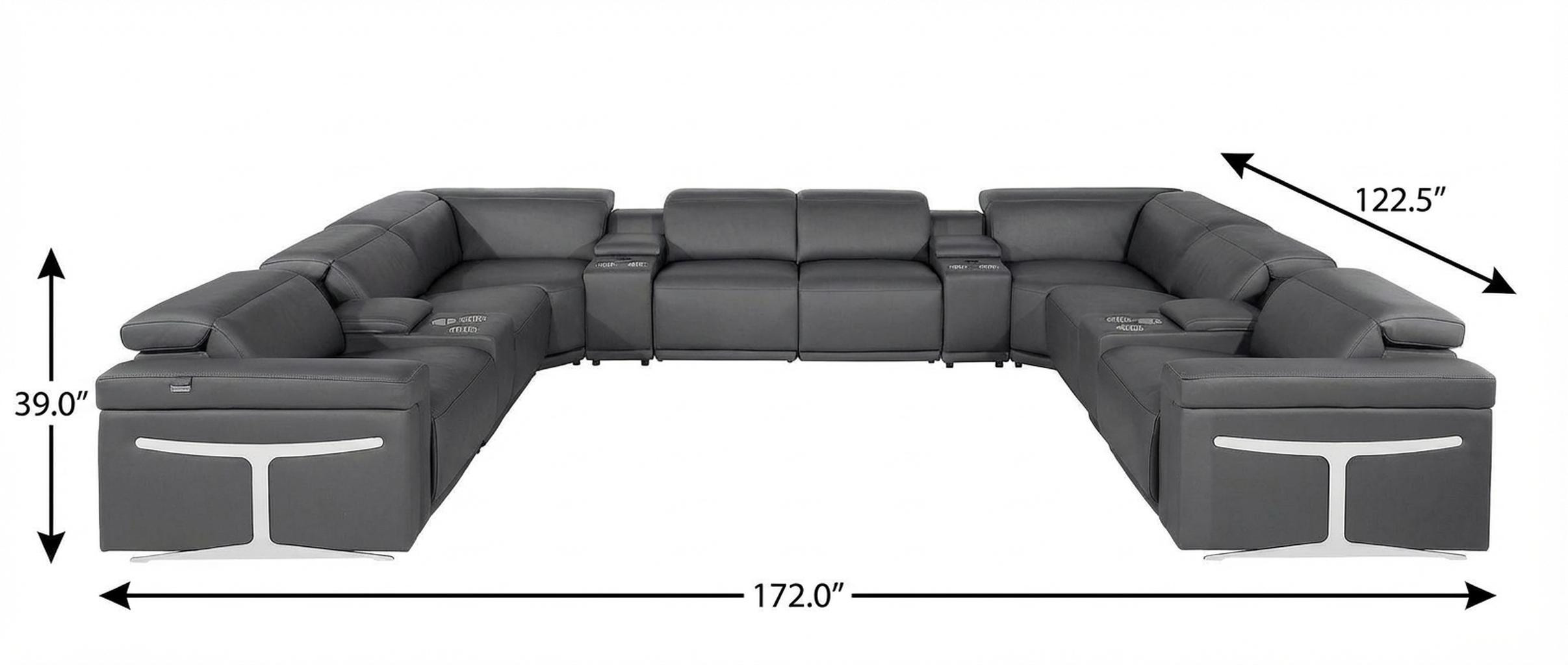 Superior construction from fabulously soft and high-grade leather gives this dark gray Italian leather power reclining u shaped twelve piece with console a leg up on the competition. The premium leather used makes your lounging luxuriously comfortable and adds an elegant appeal to your space. This sectional includes four power recliners and lots convenient amenities. Square arms offer a comfy place to rest. For the ultimate in relaxation, this sectional includes power - push button recline that turns it into a comfy lounge for sleeping or resting. Silver metal legs effortlessly elevate the room and add a touch of contemporary design. Great for everyday lounging and for entertaining, sectionals are an ideal way to seat multiple people. 39.00-inch h x 172.00-inch w x 122.50-inch d.