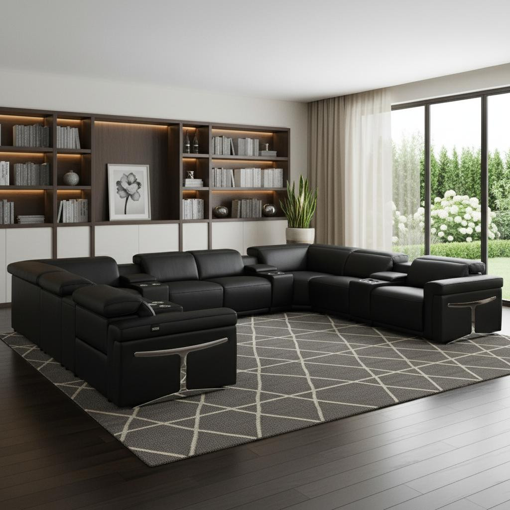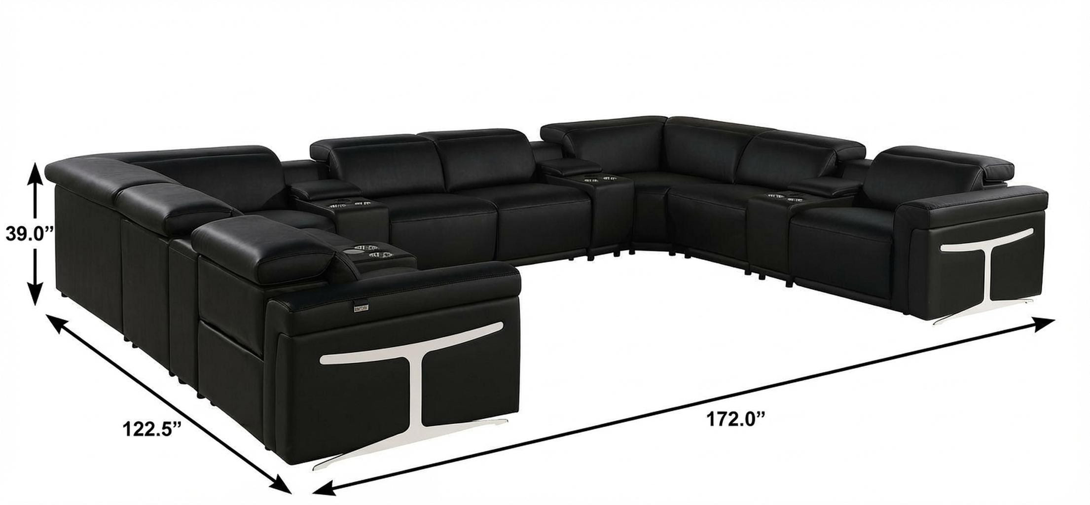 An interior designer's dream, this buttery soft high-grade leather black Italian leather power reclining u shaped twelve piece sectional with console will bring just the right touch to your space. The premium leather used makes your lounging luxuriously comfortable and adds an elegant appeal to your space. This sectional includes four power recliners and lots convenient amenities. Square arms offer a comfy place to rest. For the ultimate in relaxation, this sectional includes power - push button recline that turns it into a comfy lounge for sleeping or resting. Silver metal legs effortlessly elevate the room and add a touch of contemporary design. A great showpiece for your room, this sectional is a must have. 39.00-inch h x 172.00-inch w x 122.50-inch d.