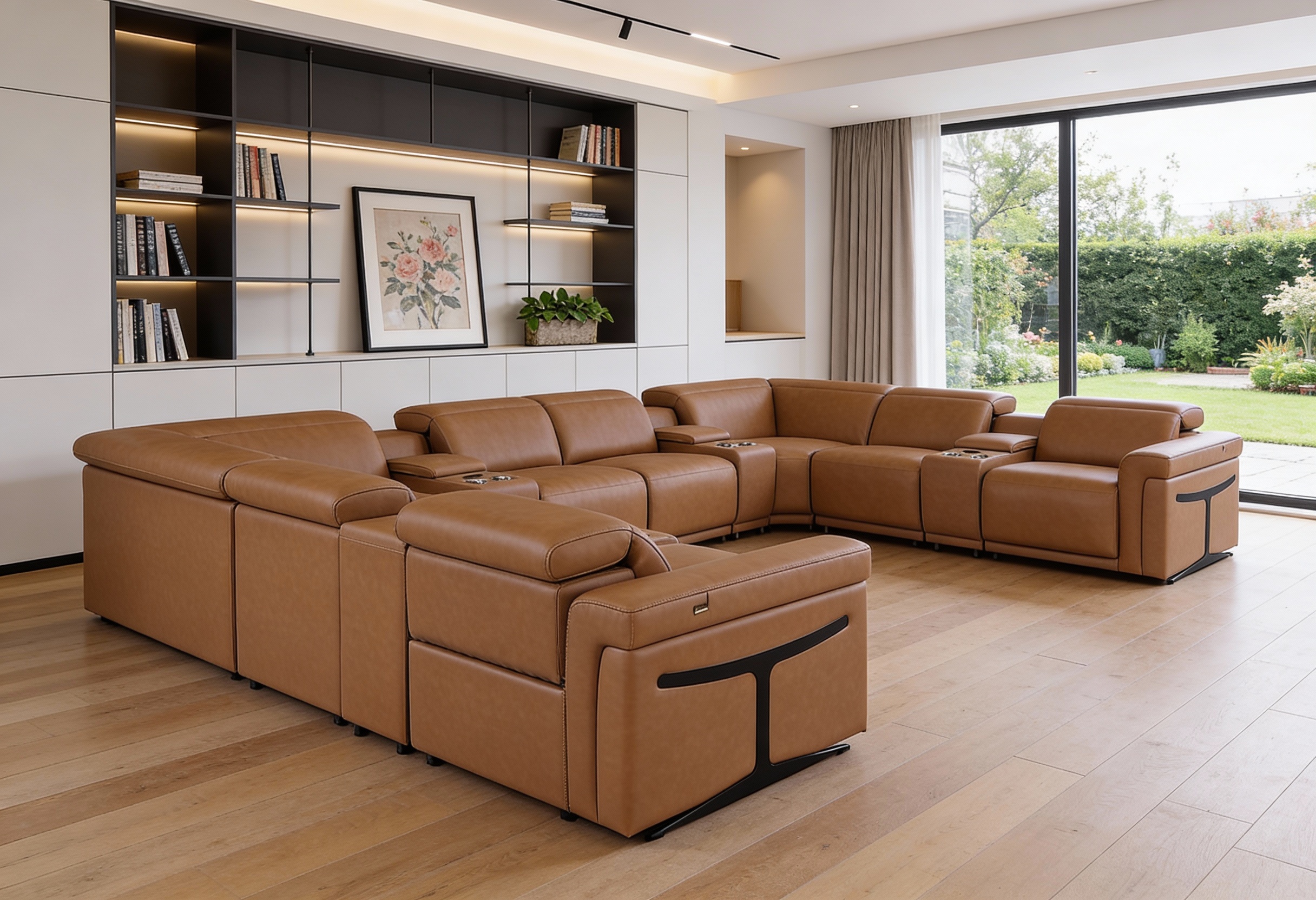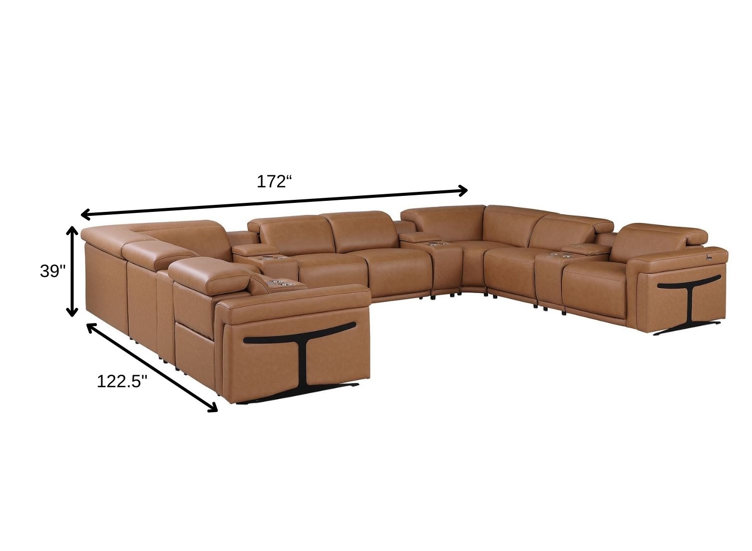 Superior construction from fabulously soft and high-grade leather gives this chestnut Italian leather power reclining u shaped twelve piece corner sectional with console a leg up on the competition. The premium leather used makes your lounging luxuriously comfortable and adds an elegant appeal to your space. This sectional includes four power recliners and lots convenient amenities. Square arms offer a comfy place to rest. For the ultimate in relaxation, this sectional includes power - push button recline that turns it into a comfy lounge for sleeping or resting. Silver metal legs effortlessly elevate the room and add a touch of contemporary design. Great for everyday lounging and for entertaining, sectionals are an ideal way to seat multiple people. 39.00-inch h x 172.00-inch w x 122.50-inch d.
