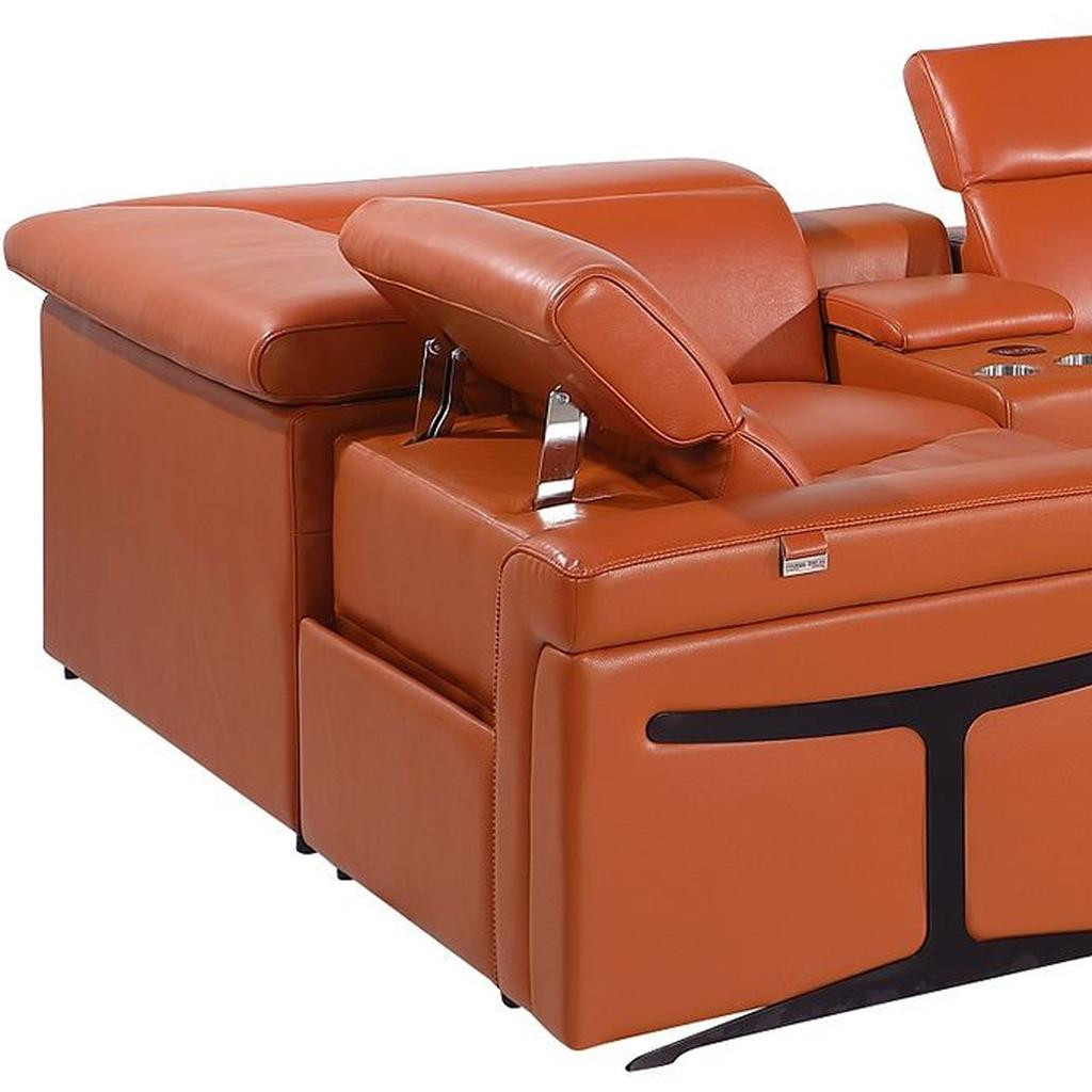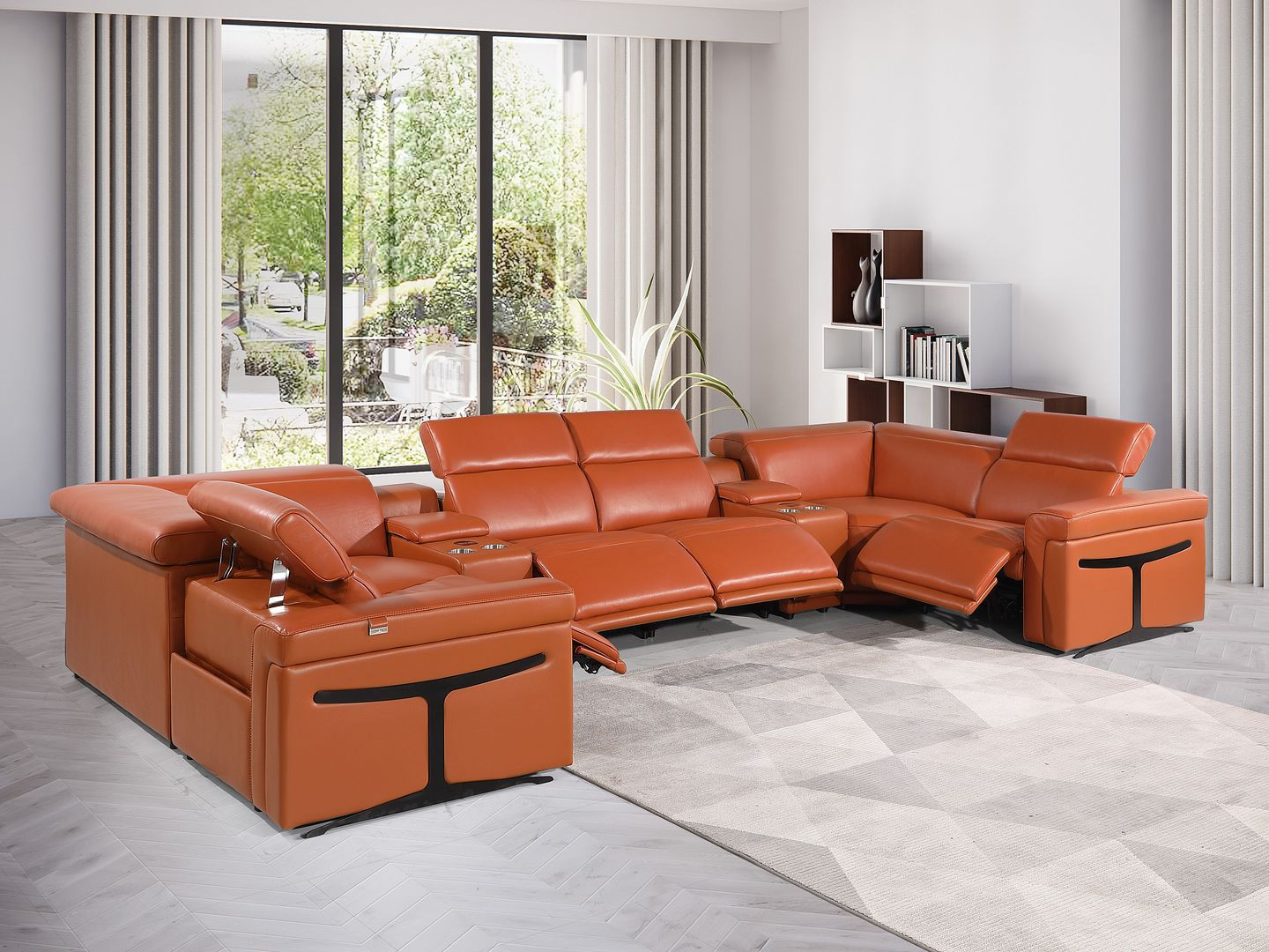 Made of the highest quality, supple leather, this camel Italian leather power reclining u shaped eight piece sectional with console will be the star of your space. The high-grade premium leather used makes your lounging luxuriously comfortable and adds an elegant appeal to your space. This sectional includes four power recliners and lots convenient amenities. Square arms offer a comfy place to rest. Power - push button recline allows you to truly rest, lounge and even sleep comfortably. Black metal legs effortlessly elevate the room and add a touch of contemporary design. Great for everyday lounging and for entertaining, sectionals are an ideal way to seat multiple people. 39.00-inch h x 172.00-inch w x 82.50-inch d.