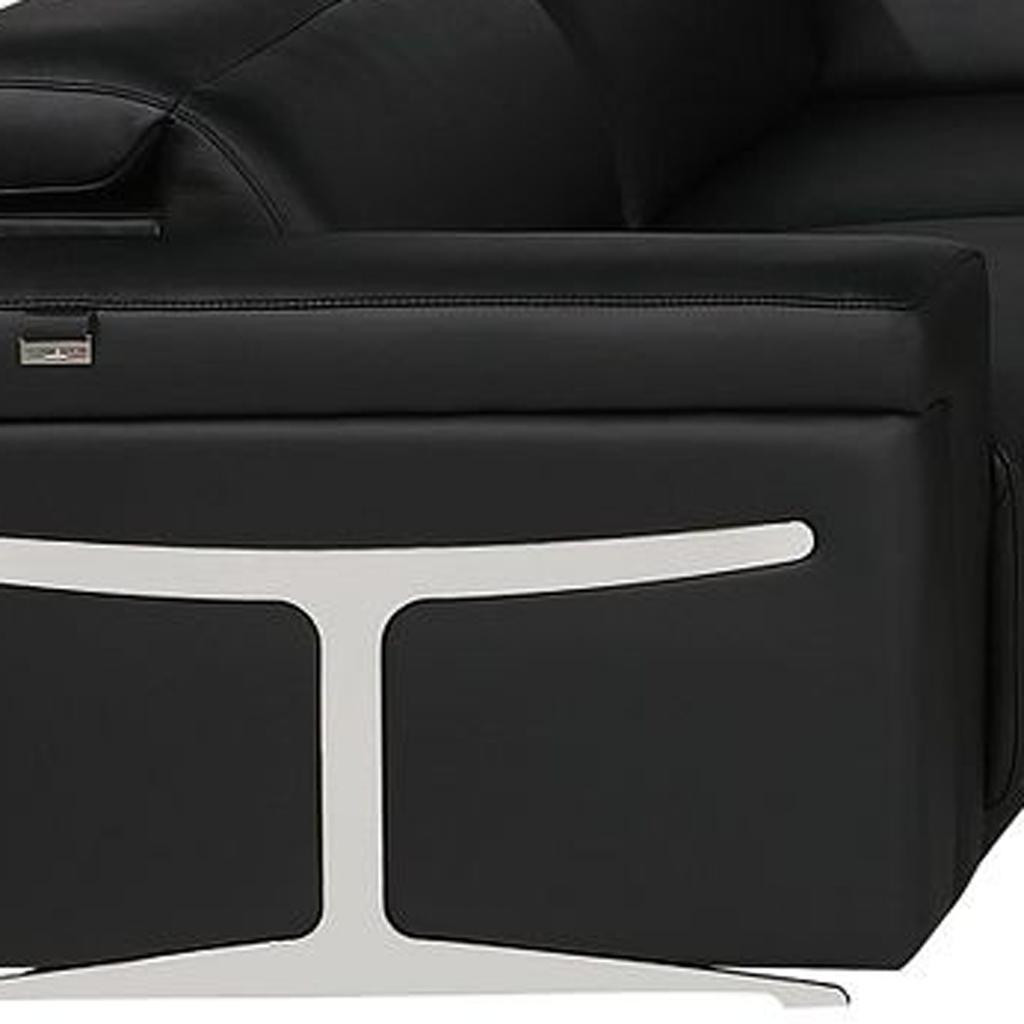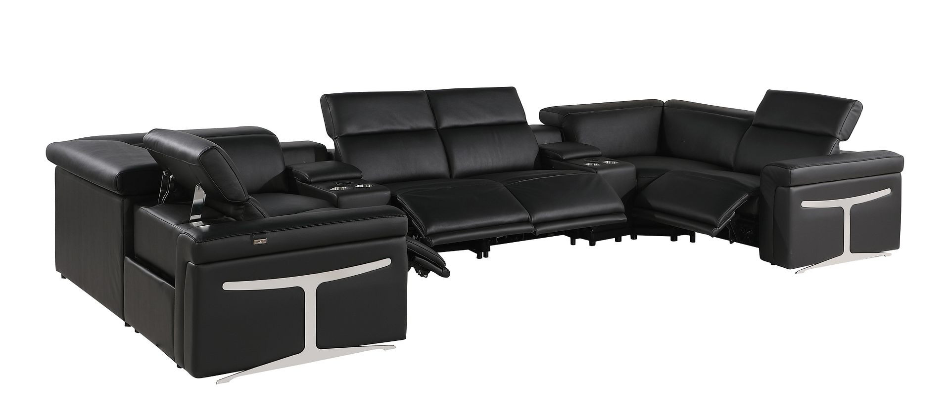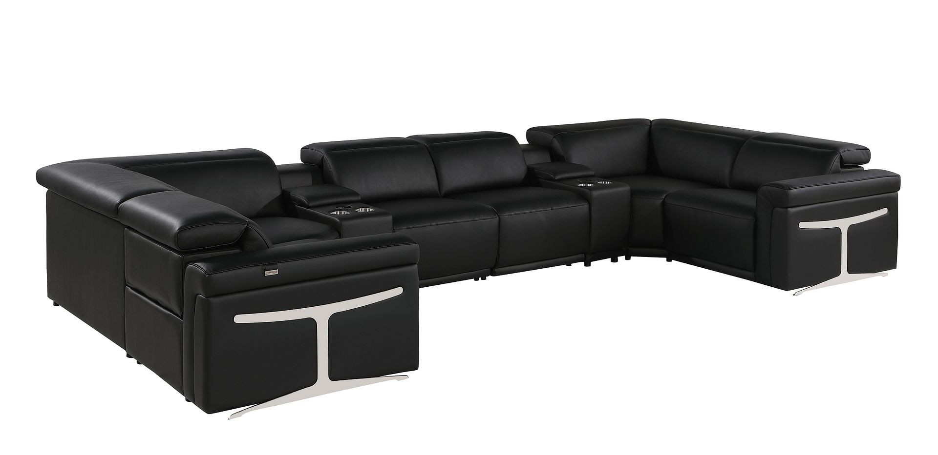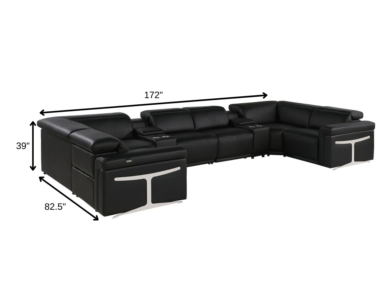 Superior construction from fabulously soft and high-grade leather gives this black Italian leather power reclining u shaped eight piece sectional with console a leg up on the competition. The premium leather used makes your lounging luxuriously comfortable and adds an elegant appeal to your space. This sectional includes four power recliners and lots convenient amenities. Square arms offer a comfy place to rest. Power - push button recline allows you to truly rest, lounge and even sleep comfortably. Silver metal legs effortlessly elevate the room and add a touch of contemporary design. A great showpiece for your room, this sectional is a must have. 39.00-inch h x 172.00-inch w x 82.50-inch d.