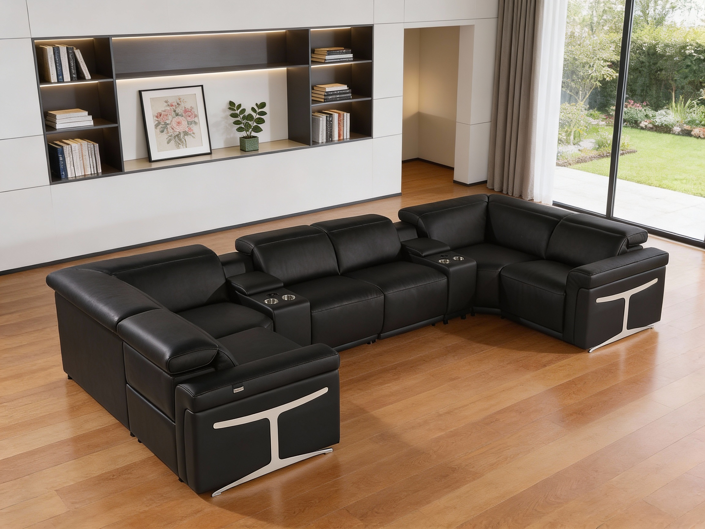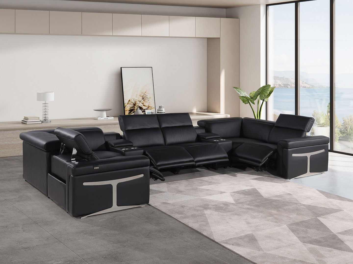 black italian leather power reclining, italian leather power reclining shaped, leather power reclining shaped piece, shaped piece corner sectional console, reclining shaped piece corner sectional |