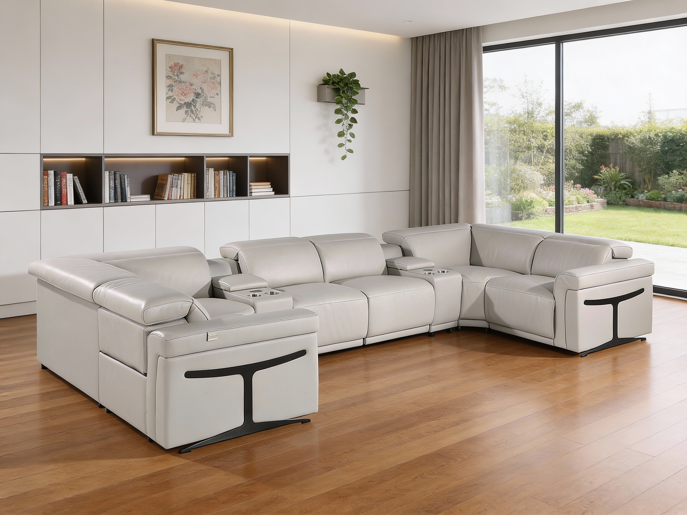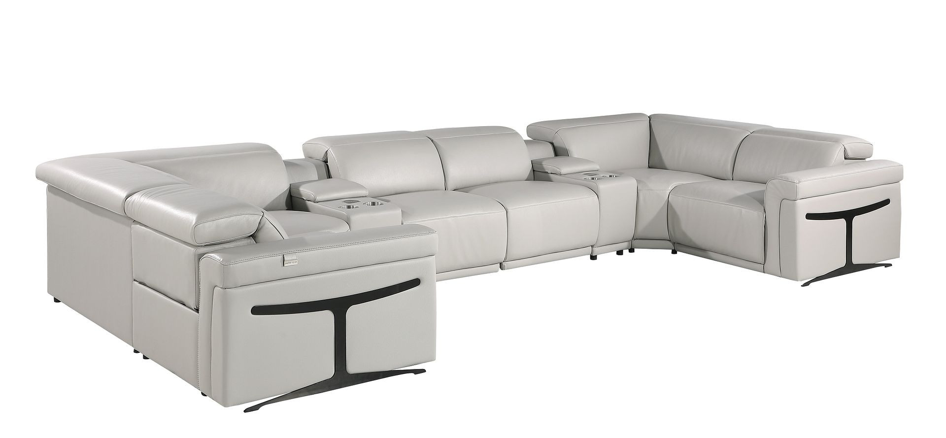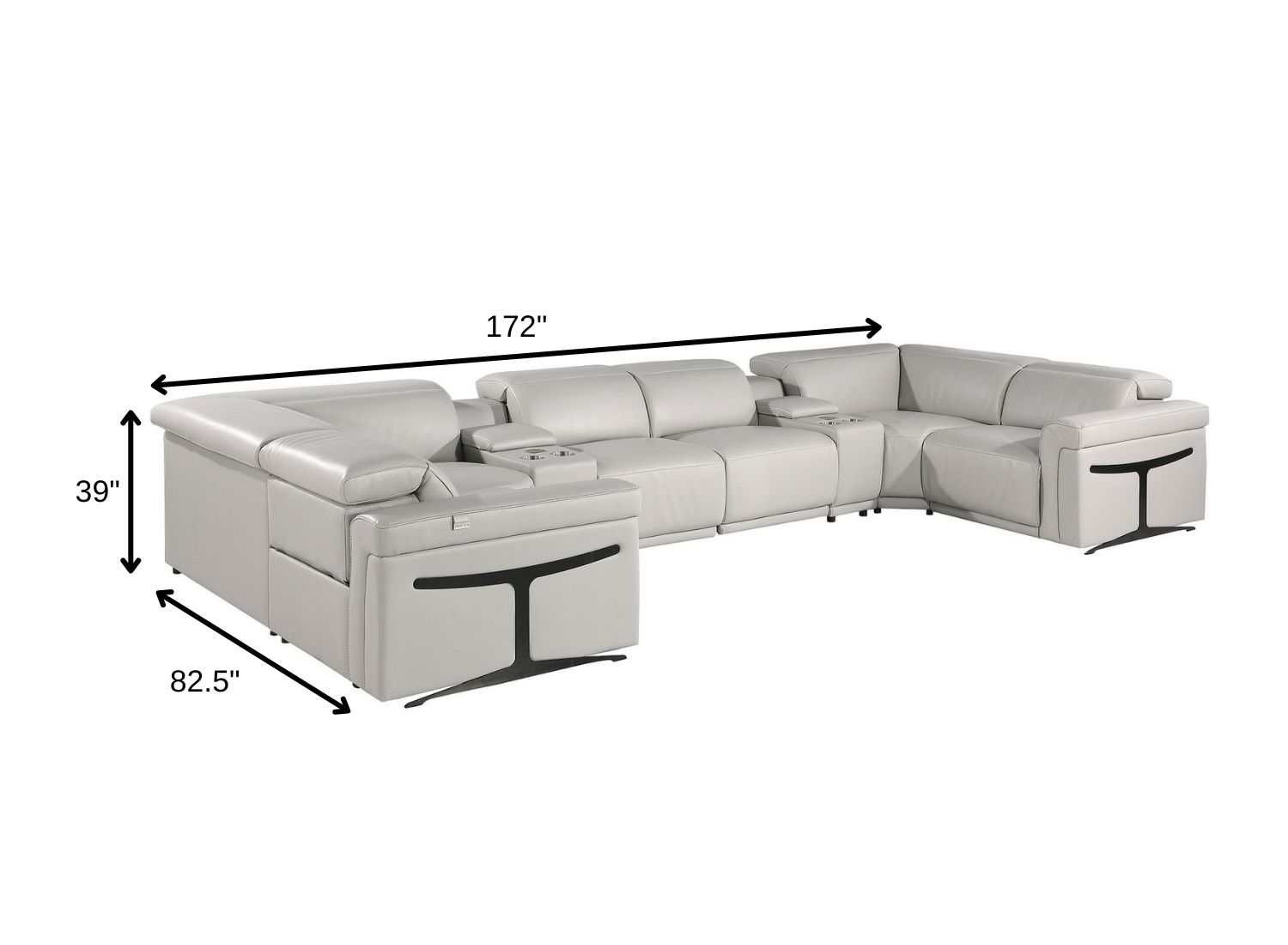 Superior construction from fabulously soft and high-grade leather gives this light gray Italian leather power reclining u shaped eight piece corner sectional with console a leg up on the competition. The premium leather used makes your lounging luxuriously comfortable and adds an elegant appeal to your space. This sectional includes two power recliners and lots convenient amenities. Square arms offer a comfy place to rest. For the ultimate in relaxation, this sectional includes power - push button recline that turns it into a comfy lounge for sleeping or resting. Black metal legs effortlessly elevate the room and add a touch of contemporary design. Great for everyday lounging and for entertaining, sectionals are an ideal way to seat multiple people. 39.00-inch h x 172.00-inch w x 82.50-inch d.