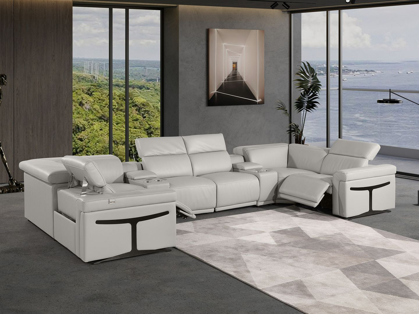 gray italian leather power reclining, italian leather power reclining shaped, leather power reclining shaped piece, shaped piece corner sectional console, reclining shaped piece corner sectional |