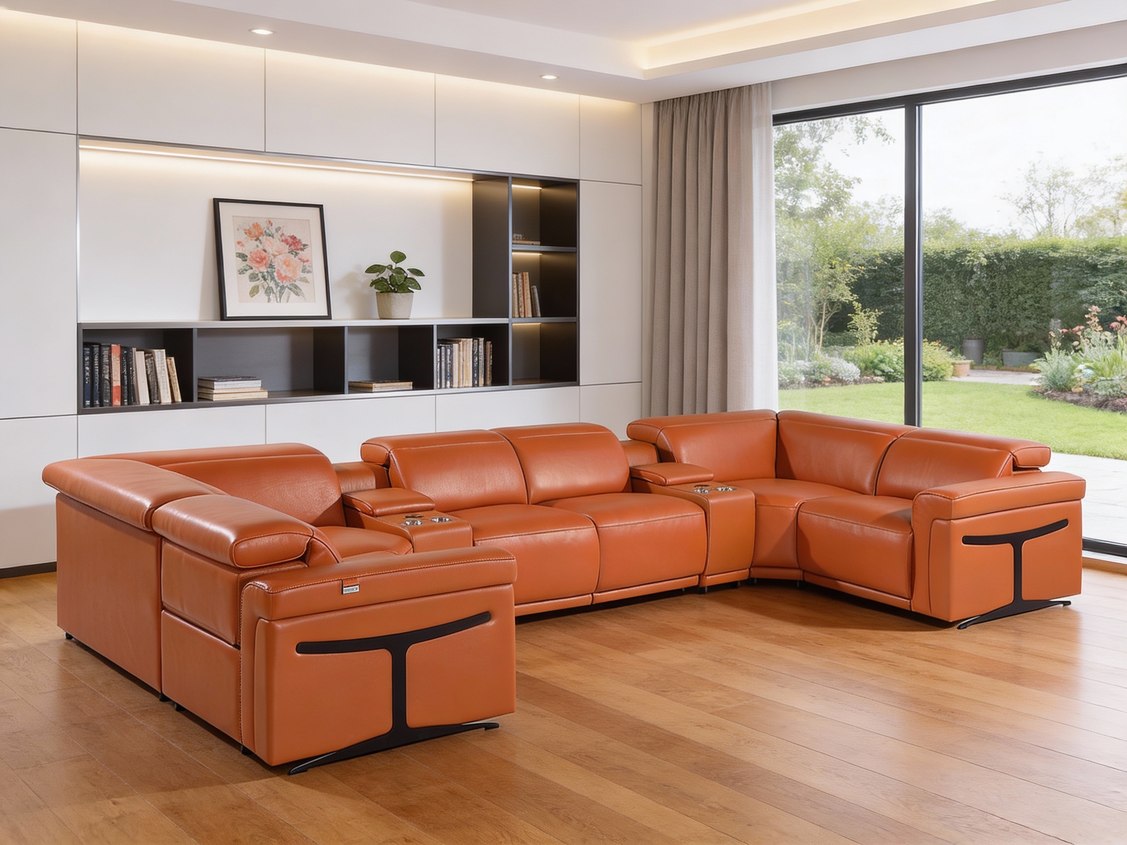 Made of the highest quality, supple leather, this camel italian leather power reclining u shaped eight piece corner sectional with console will be the star of your space. The high-grade premium leather used makes your lounging luxuriously comfortable and adds an elegant appeal to your space. This sectional includes two power recliners and lots convenient amenities. Square arms offer a comfy place to rest. Power - push button recline allows you to truly rest, lounge and even sleep comfortably. Black metal legs effortlessly elevate the room and add a touch of contemporary design. A great showpiece for your room, this sectional is a must have. 39.00-inch h x 172.00-inch w x 82.50-inch d.