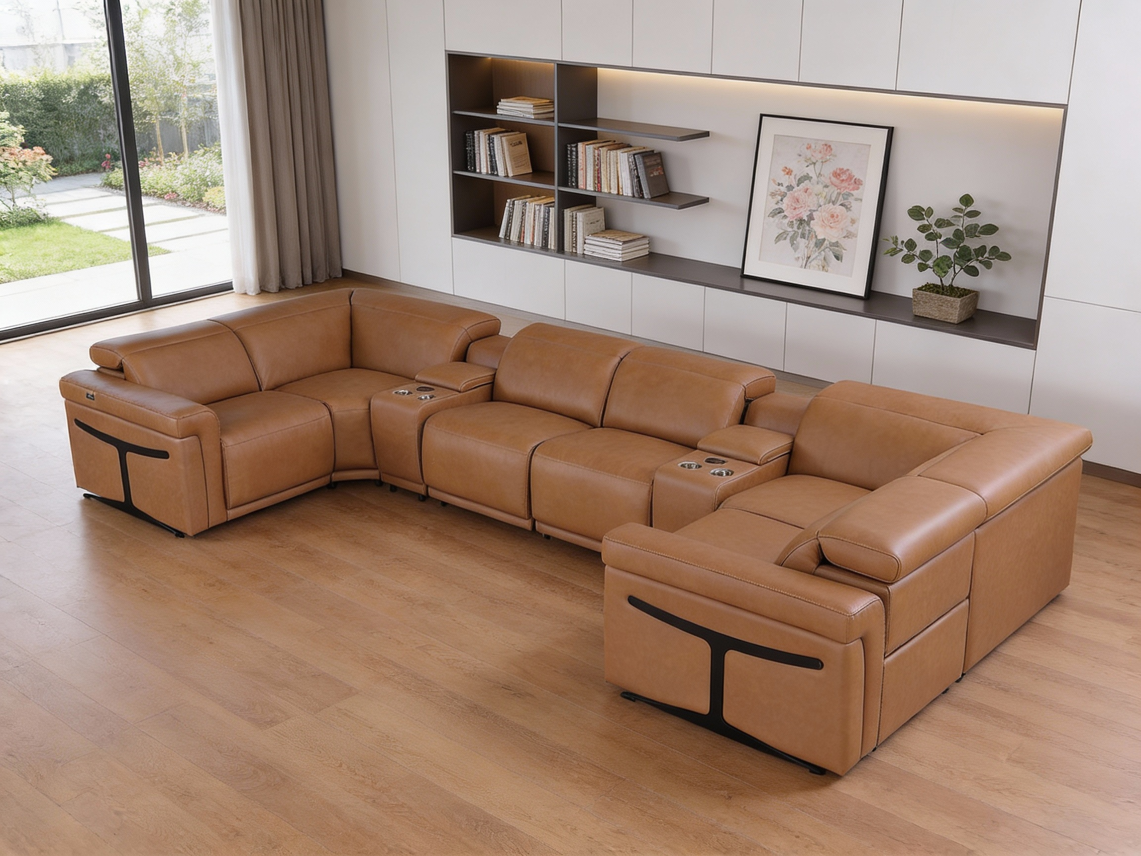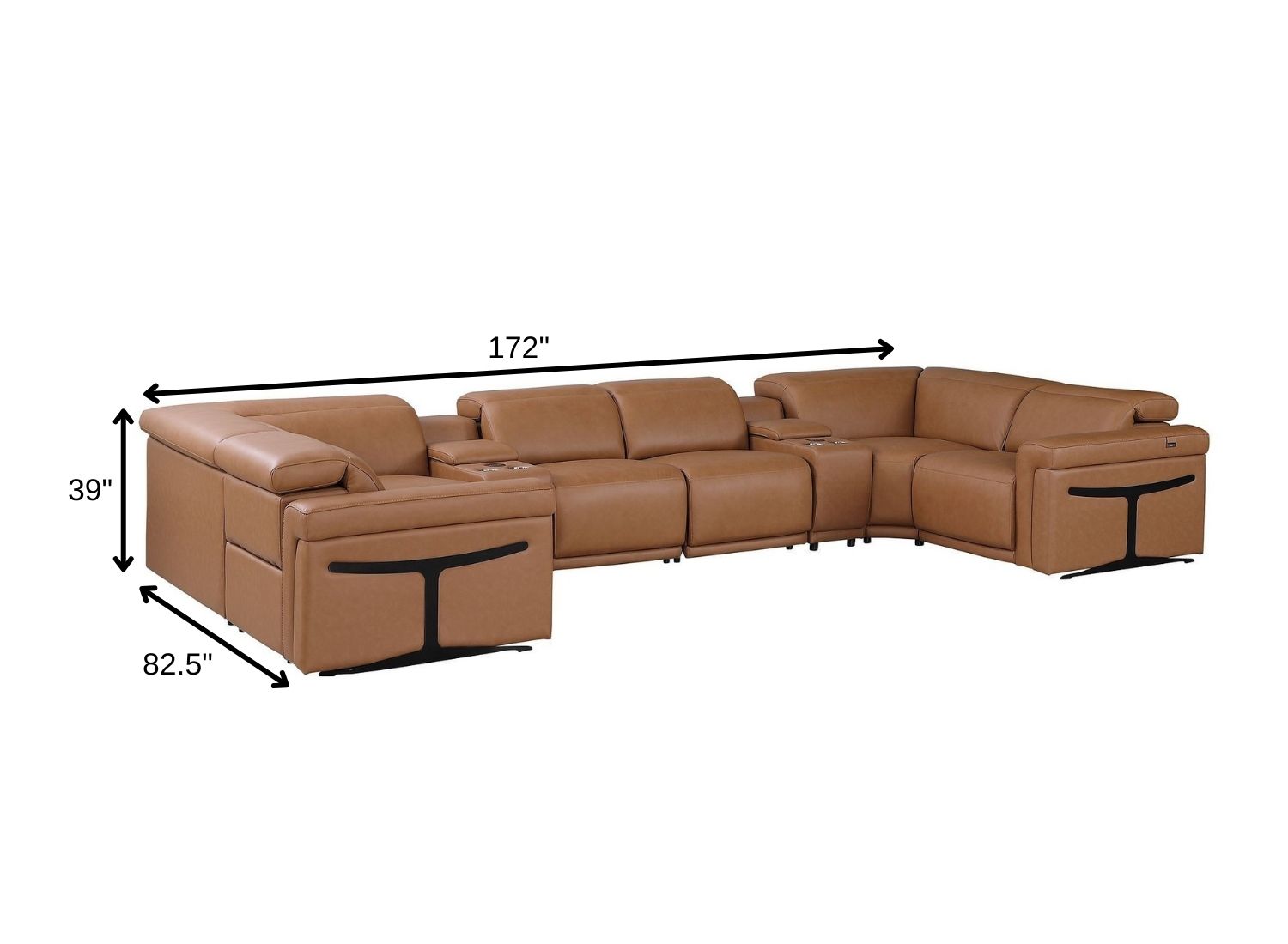 Superior construction from fabulously soft and high-grade leather gives this chestnut Italian leather power reclining u shaped eight piece corner sectional with console a leg up on the competition. The premium leather used makes your lounging luxuriously comfortable and adds an elegant appeal to your space. This sectional includes two power recliners and lots convenient amenities. Square arms offer a comfy place to rest. Power - push button recline allows you to truly rest, lounge and even sleep comfortably. Silver metal legs effortlessly elevate the room and add a touch of contemporary design. A great showpiece for your room, this sectional is a must have. 39.00-inch h x 172.00-inch w x 82.50-inch d.