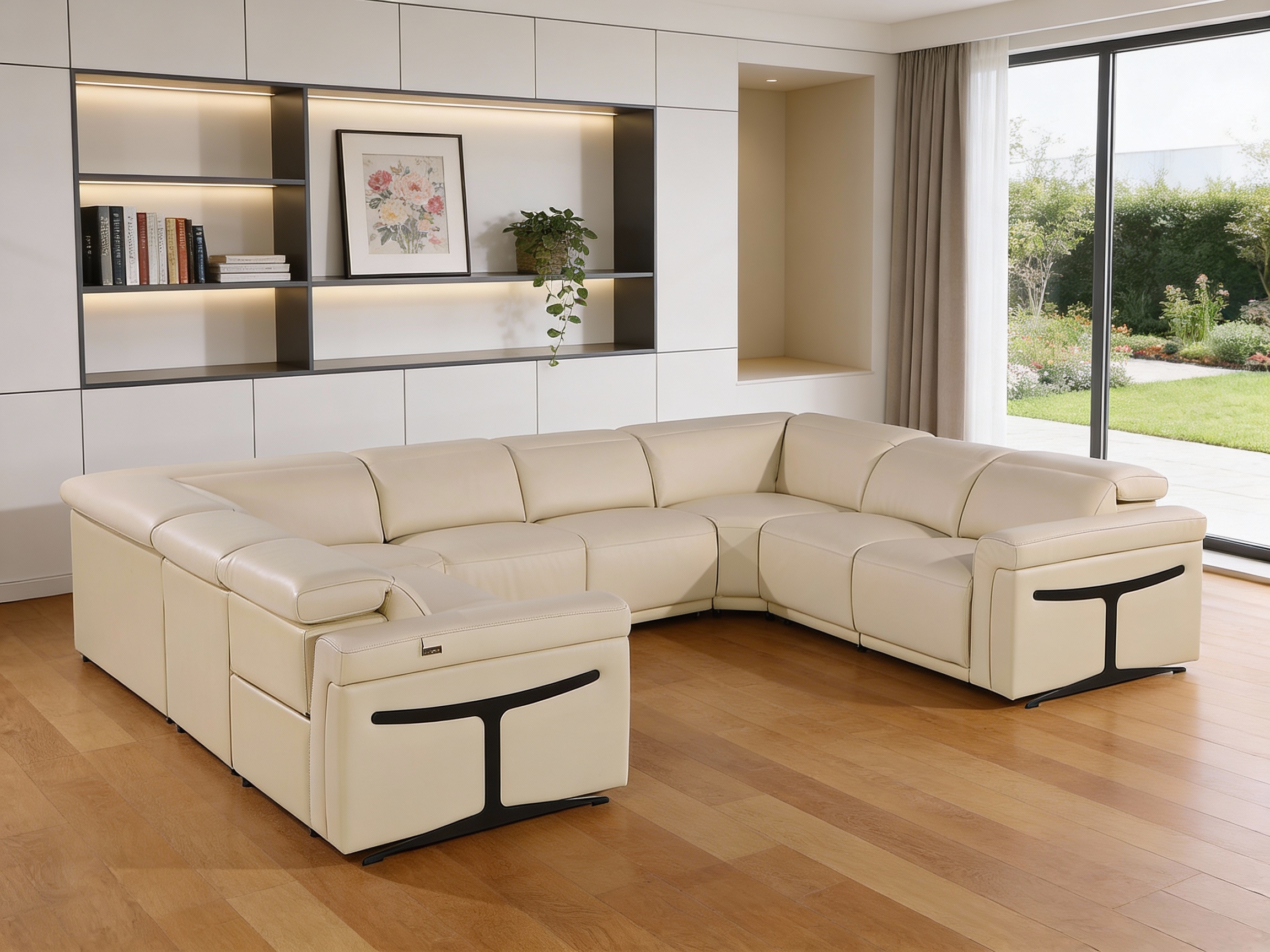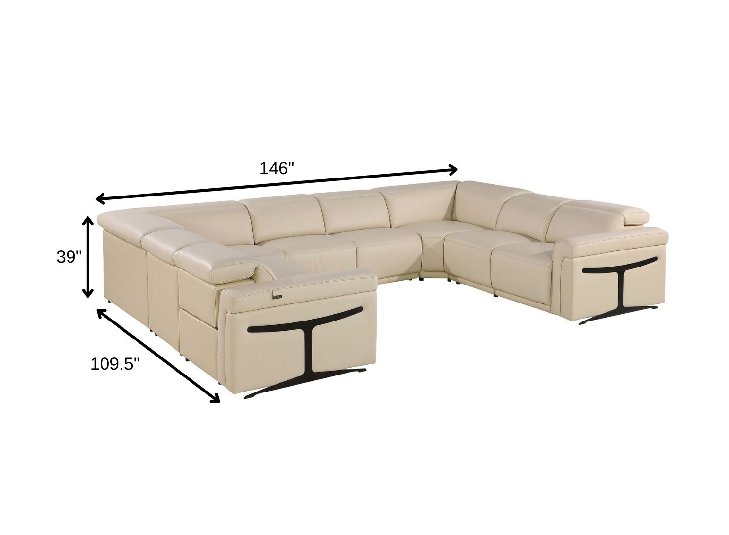 Superior construction from fabulously soft and high-grade leather gives this beige Italian leather power reclining u shaped eight piece corner sectional with console a leg up on the competition. The premium leather used makes your lounging luxuriously comfortable and adds an elegant appeal to your space. Square arms offer a comfy place to rest. For the ultimate in relaxation, this sectional includes four push button power recliners that turn it into a comfy lounge for sleeping or resting. Black metal legs effortlessly elevate the room and add a touch of contemporary design. Great for everyday lounging and for entertaining, sectionals are an ideal way to seat multiple people. 39.00-inch h x 146.00-inch w x 109.50-inch d.