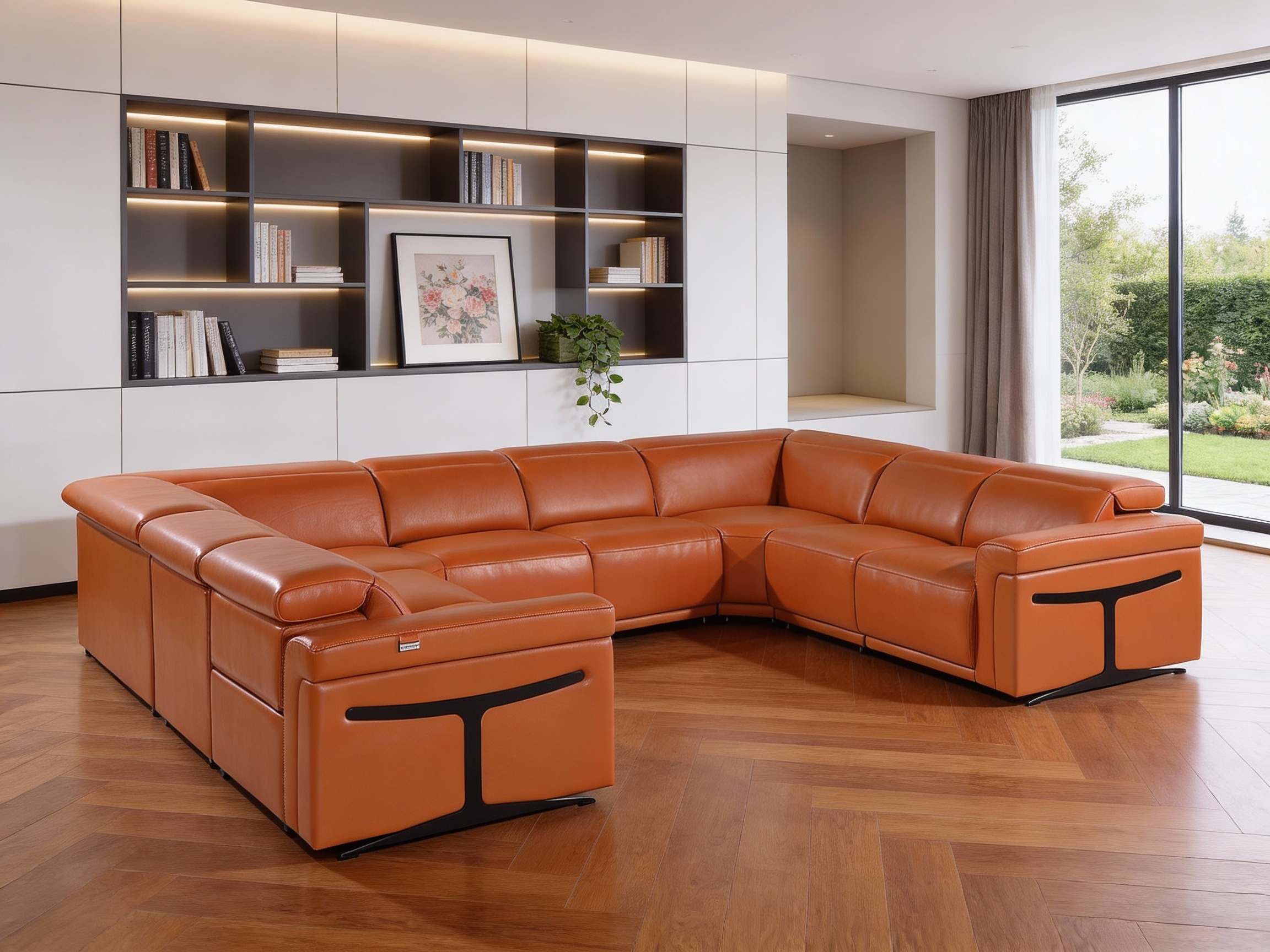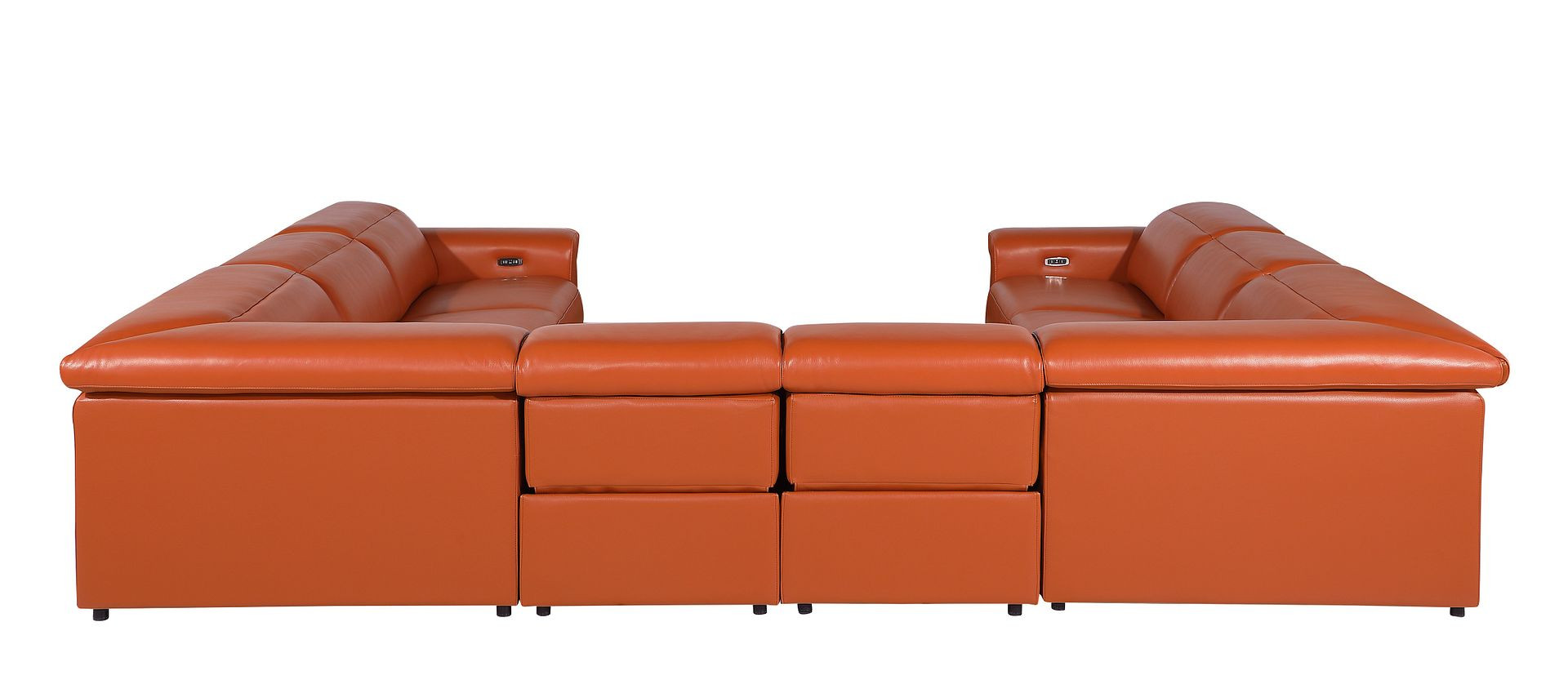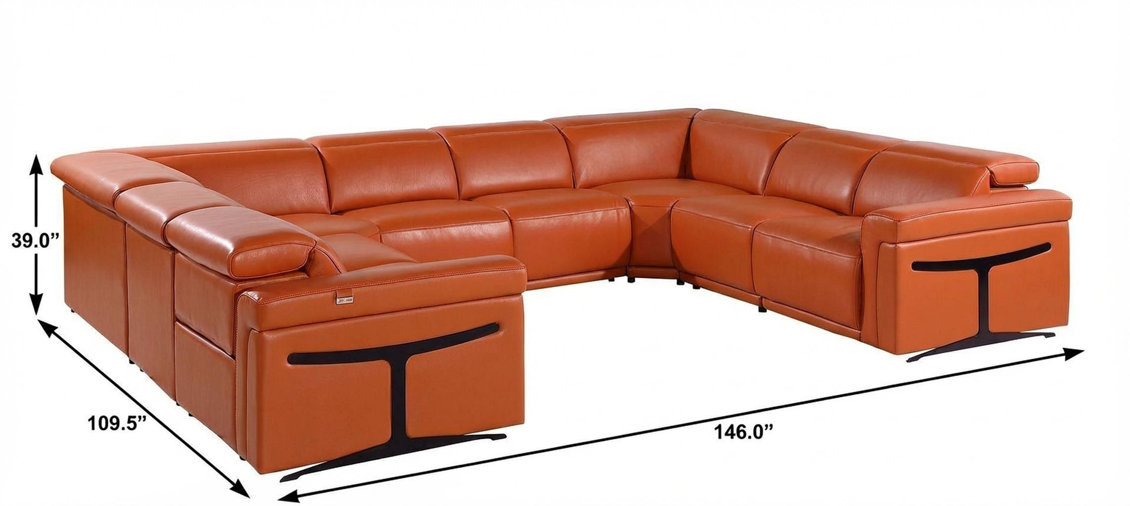 An interior designer's dream, this buttery soft high-grade leather camel Italian leather power reclining u shaped eight piece corner sectional with console will bring just the right touch to your space. The premium leather used makes your lounging luxuriously comfortable and adds an elegant appeal to your space. Square arms offer a comfy place to rest. For the ultimate in relaxation, this sectional includes four push button power recliners that turn it into a comfy lounge for sleeping or resting. Black metal legs effortlessly elevate the room and add a touch of contemporary design. A great showpiece for your room, this sectional is a must have. 39.00-inch h x 146.00-inch w x 109.50-inch d.