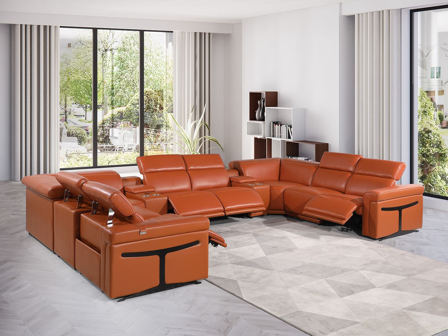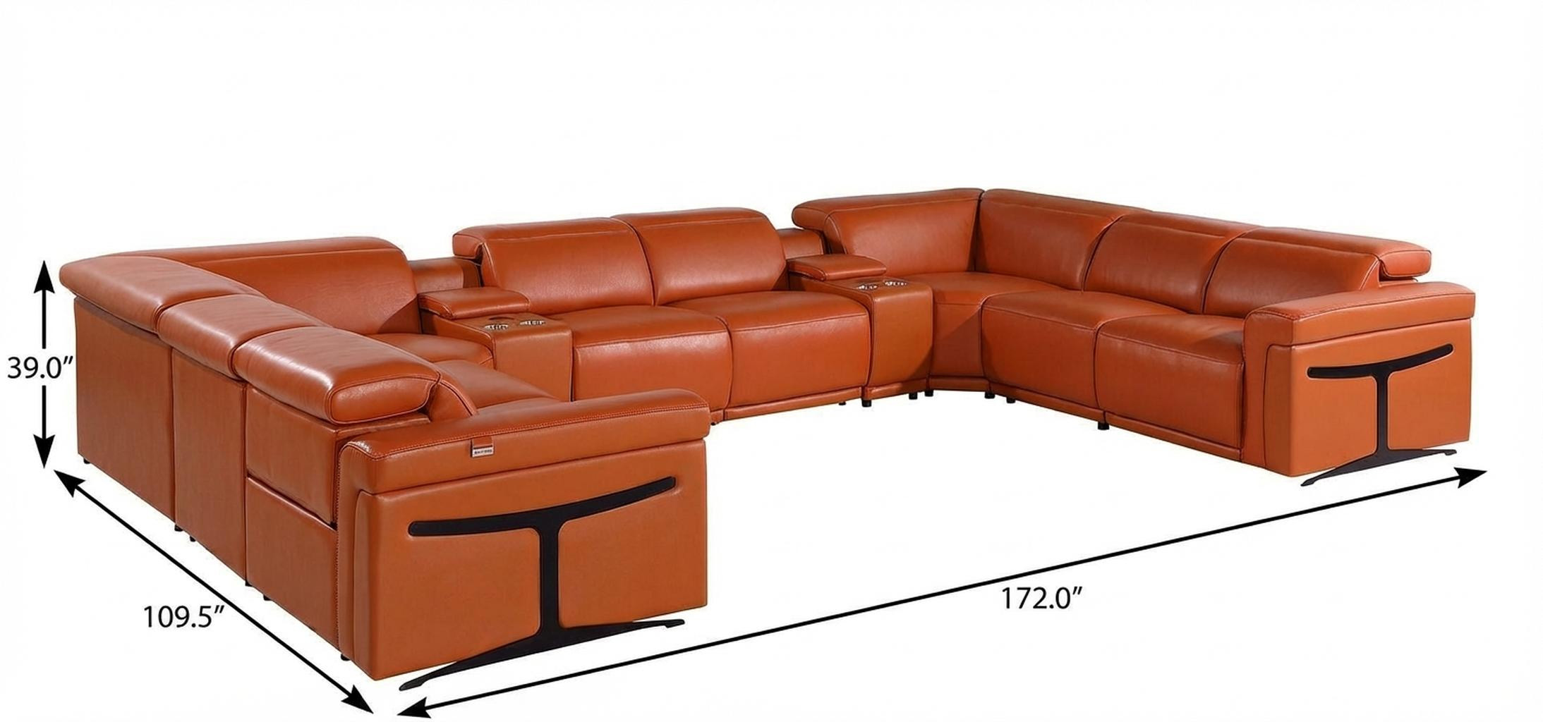 The camel Italian leather power reclining u shaped ten piece corner sectional with console is spacious design meticulously crafted with extraordinary cushion comfort and ultimate durability so everyone in your home can have the best seat in the house. The high-end premium leather used makes your lounging luxuriously comfortable and adds an elegant appeal to your space. Square arms offer a comfy place to rest. For the ultimate in relaxation, this sectional includes four push button power recliners that turn it into a comfy lounge for sleeping or resting. Black metal legs effortlessly elevate the room and add a touch of contemporary design. A great showpiece for your room, this sectional is a must have. 39.00-inch h x 172.00-inch w x 109.50-inch d.
