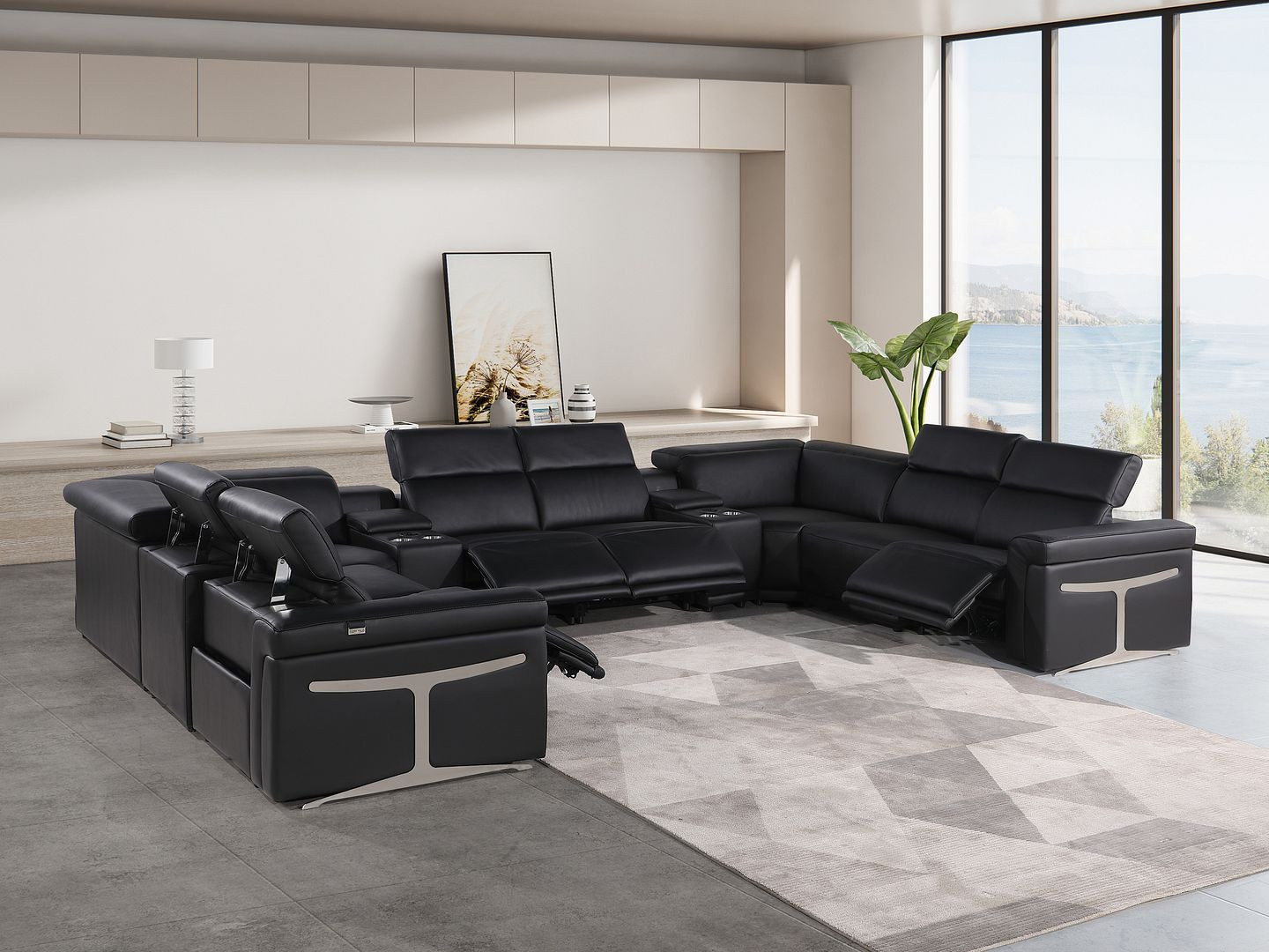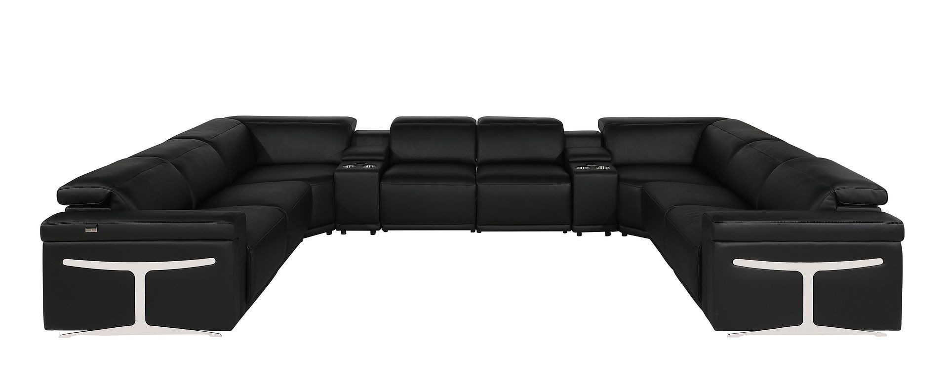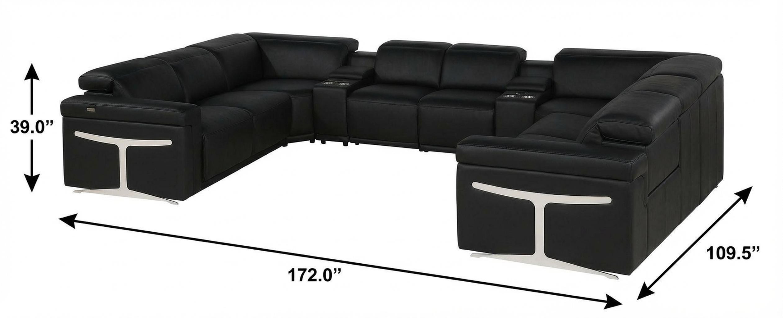 The black Italian leather power reclining u shaped ten piece corner sectional with console is spacious design meticulously crafted with extraordinary cushion comfort and ultimate durability so everyone in your home can have the best seat in the house. The high-end premium leather used makes your lounging luxuriously comfortable and adds an elegant appeal to your space. Square arms offer a comfy place to rest. For the ultimate in relaxation, this sectional includes four push button power recliners that turn it into a comfy lounge for sleeping or resting. Silver metal legs effortlessly elevate the room and add a touch of contemporary design. Great for everyday lounging and for entertaining, sectionals are an ideal way to seat multiple people. 39.00-inch h x 172.00-inch w x 109.50-inch d.