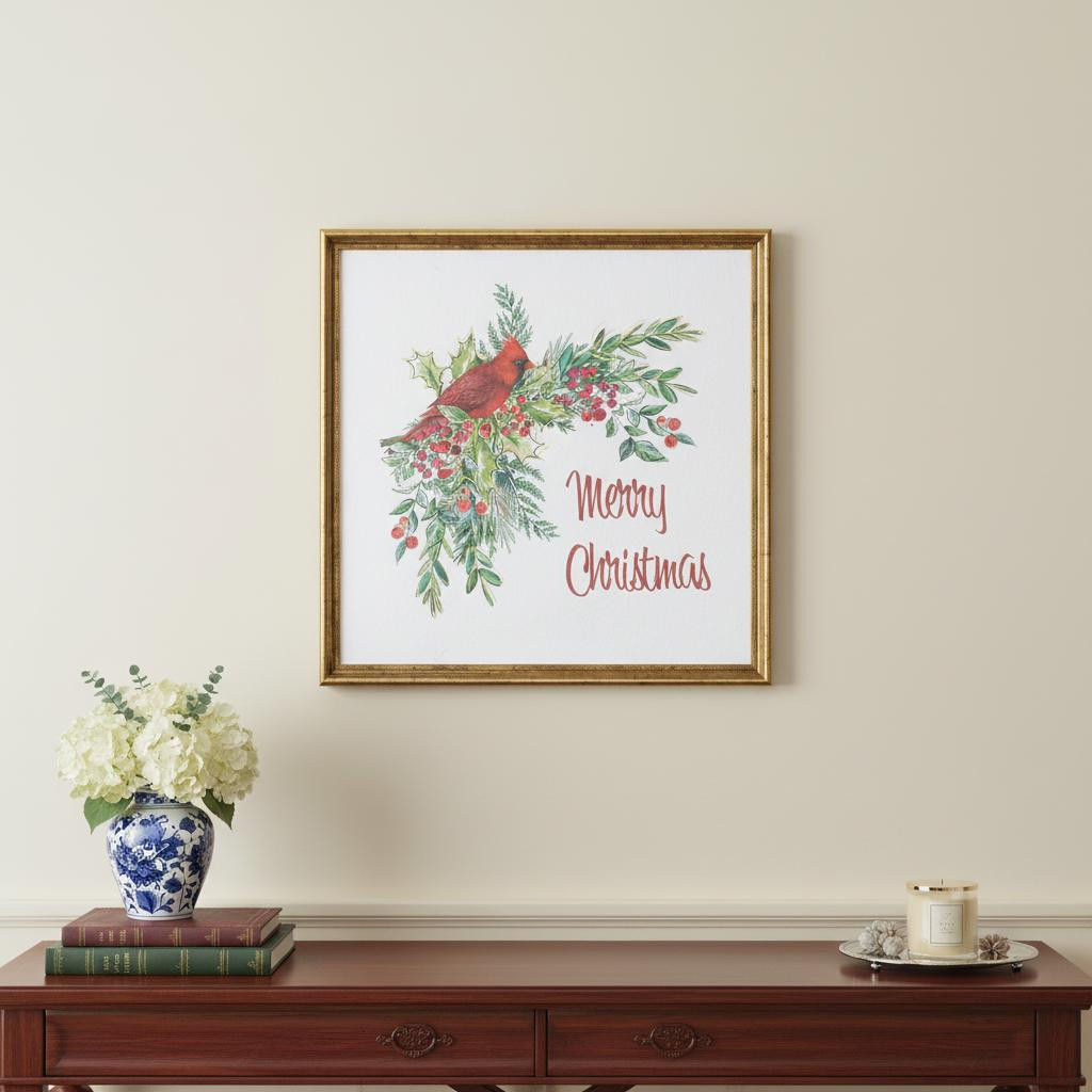 Add some christmas cheer to your space with this merry christmas cardinal gold framed wall art. This bird inspired art will be a great addition to your space. This watercolor painting is a way to express your artistic style and add some fashion to your walls. Reproduced for you on canvas, this hanging decorative accent will be a trendy and fashionable way to dress your walls. Hang on your wall to add some up to date fashion and decoration. Utilize this opportunity to create a focal point in the room with this fabulous wall decor option. 16.00-inch h x 16.00-inch w x 0.75-inch d.