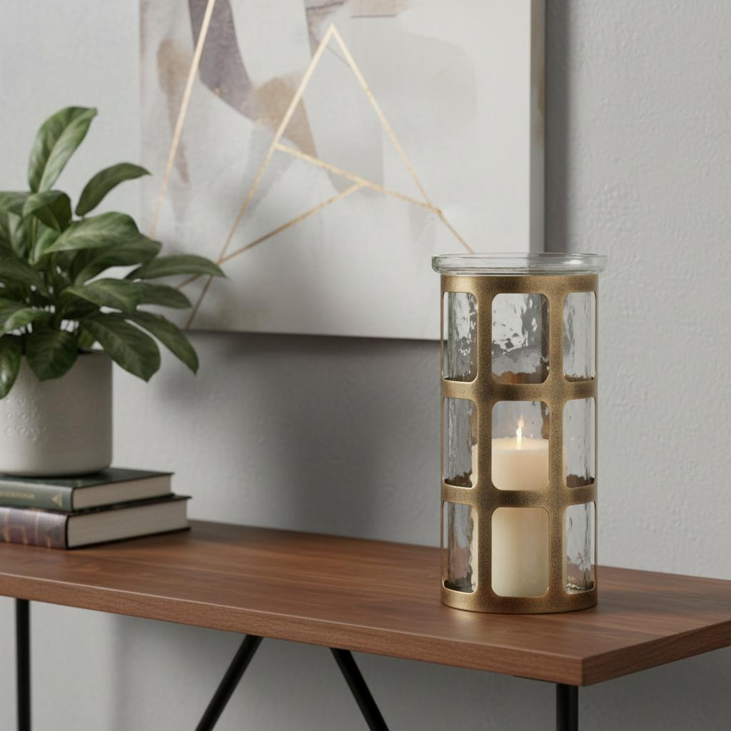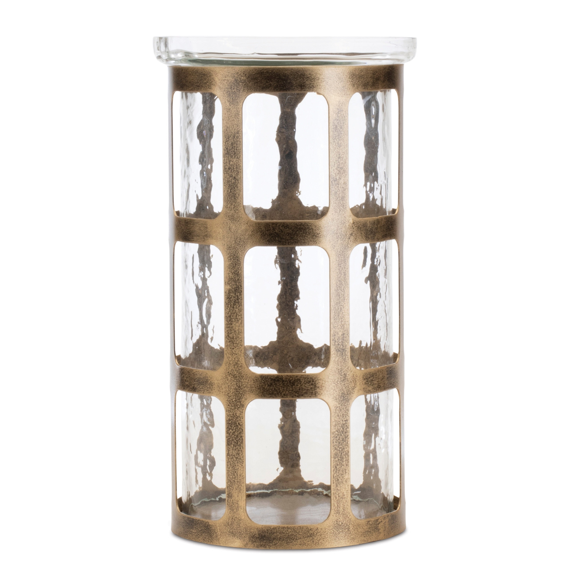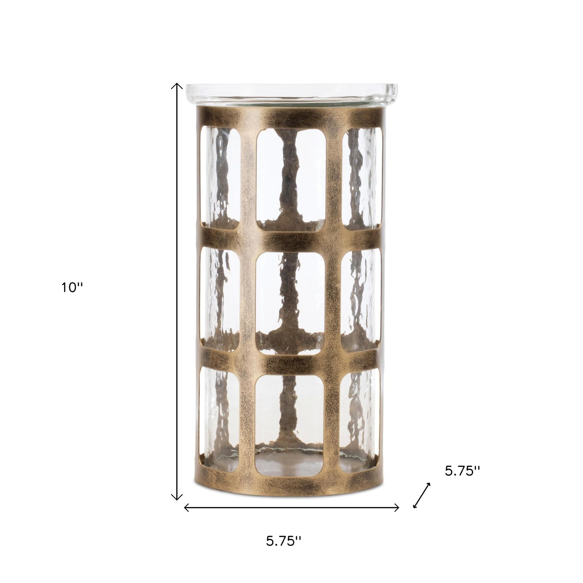 Create a warm and inviting environment in any space with this 10-inch gold lattice iron and glass tabletop pillar candle holder. Add an extra pop of personality to every corner of your home with this gorgeous candleholder candleholders are an attractive way to turn a simple candle into a piece of décor. This versatile piece is designed to accommodate pillar candles and features a stunning lattice pattern that enhances its visual appeal. Crafted from durable iron and glass, it combines elegance with functionality for a refined touch to your tabletop decor. Perfect for special occasions or everyday use, this candle holder elevates any ambiance with its sophisticated design. 10.00-inch h x 5.75-inch w x 5.75-inch d.