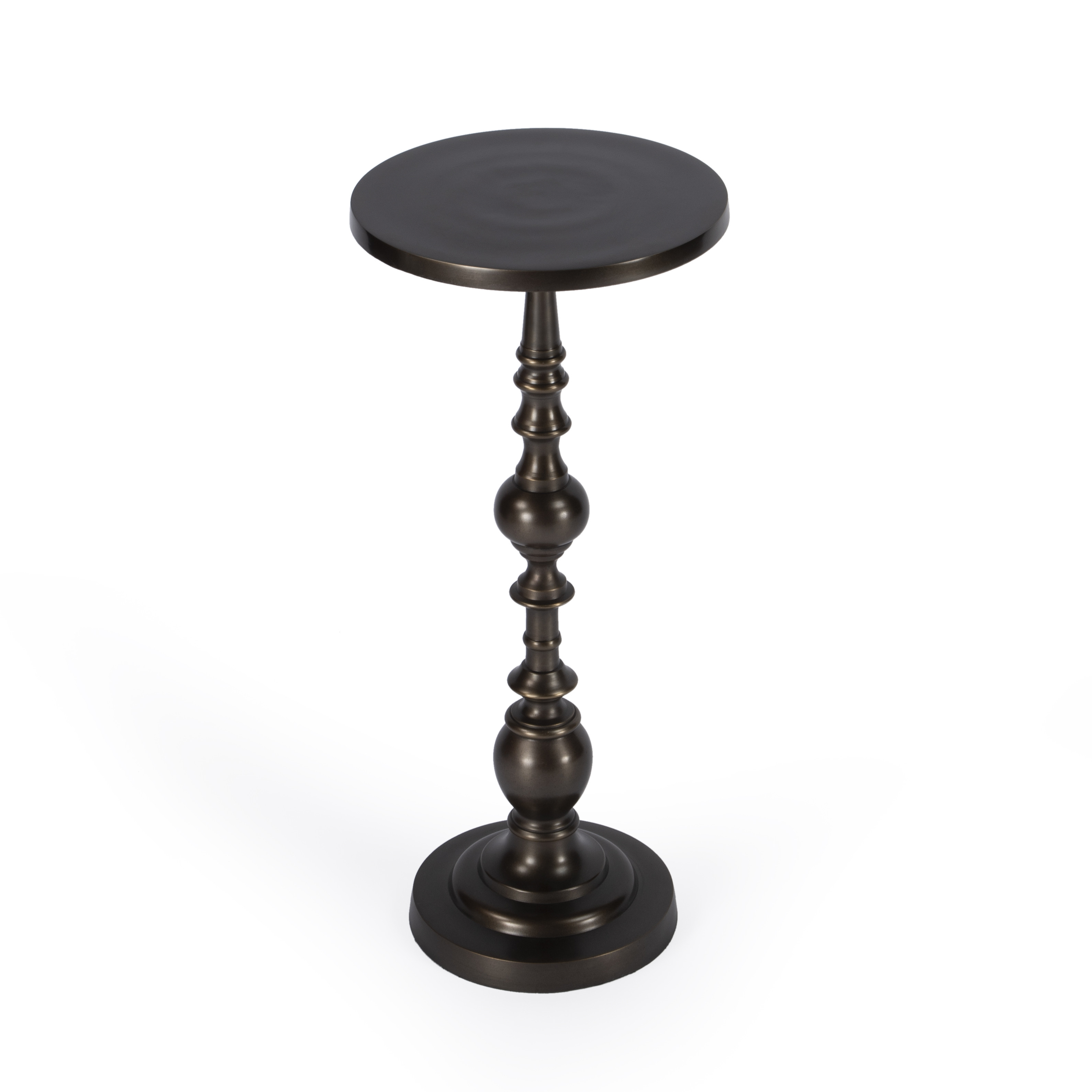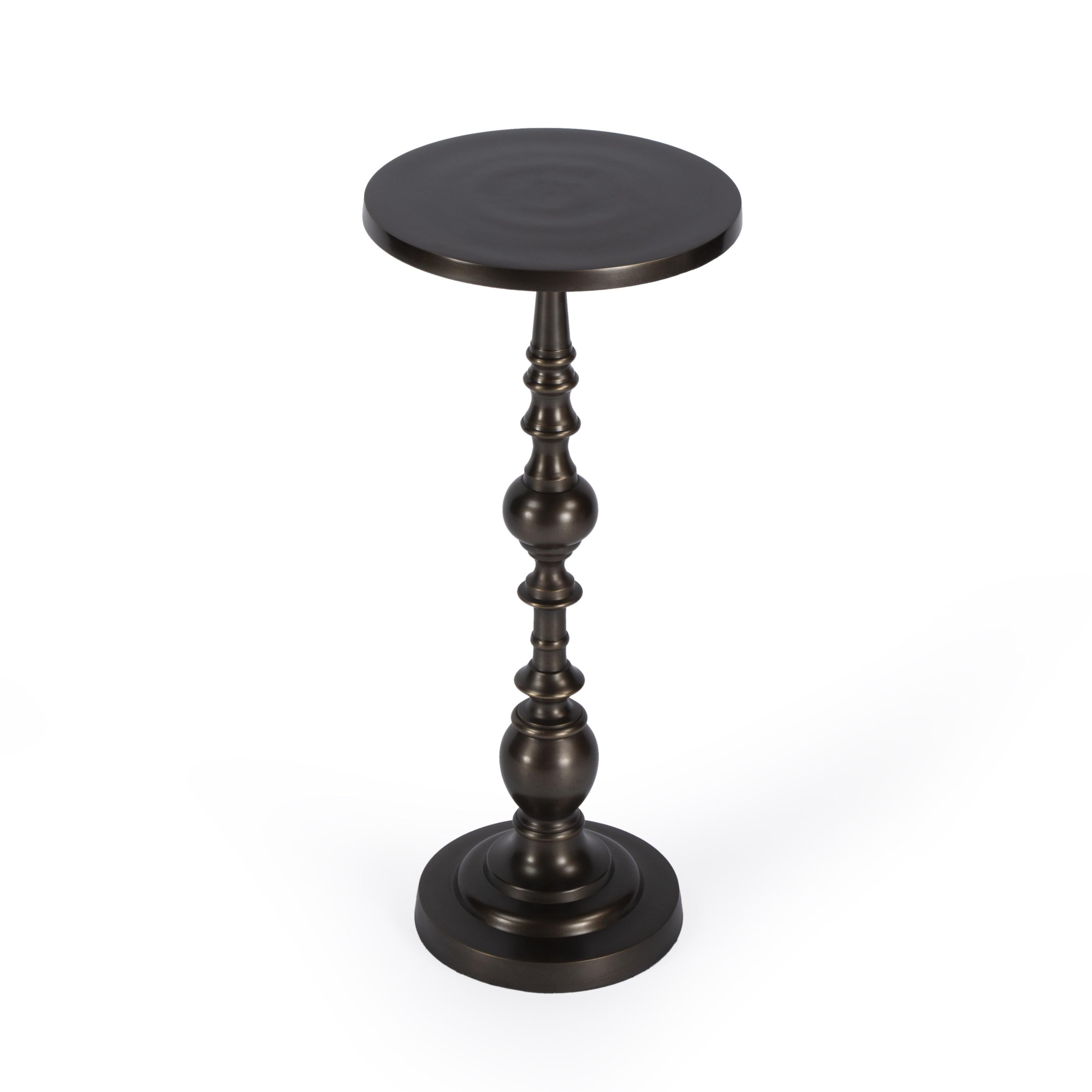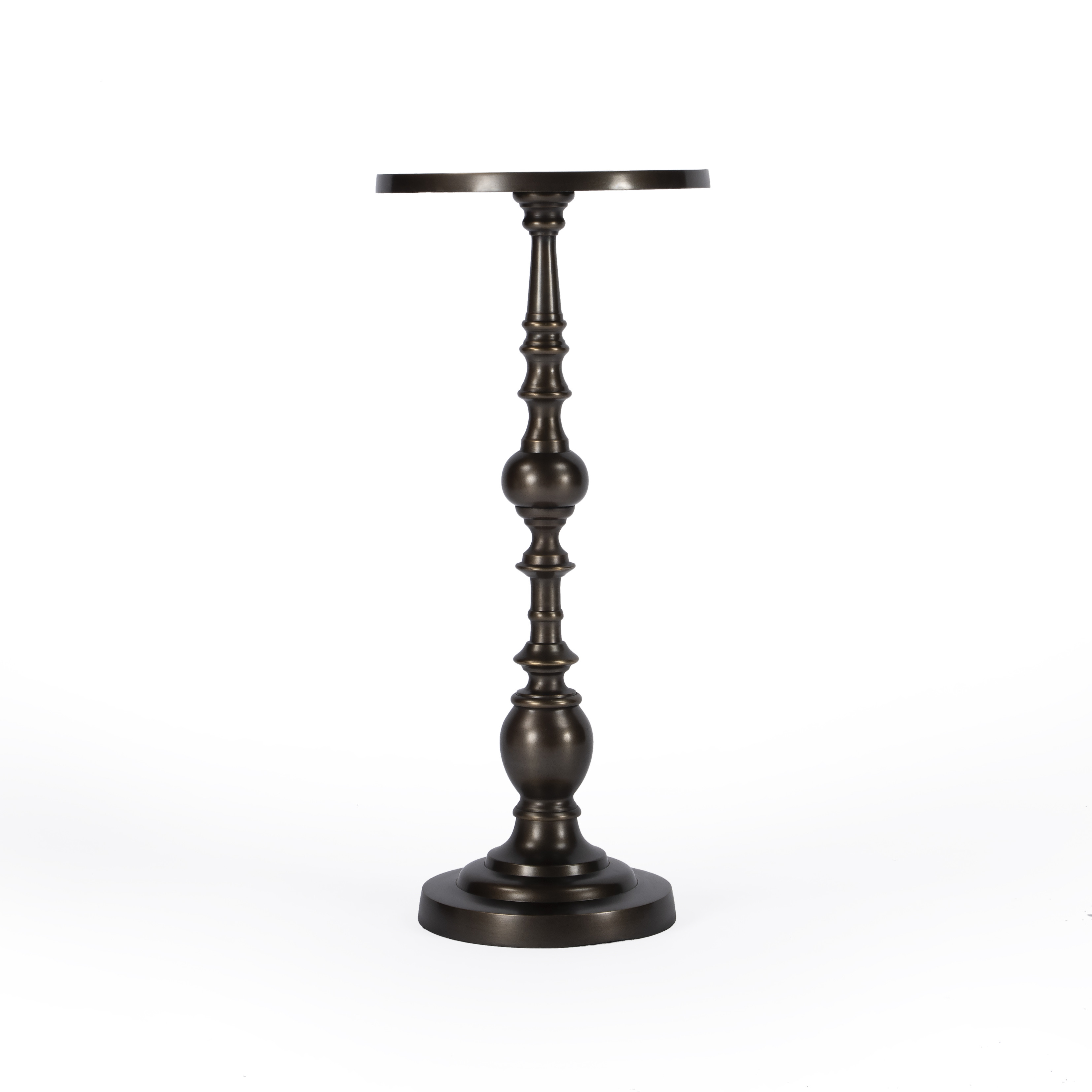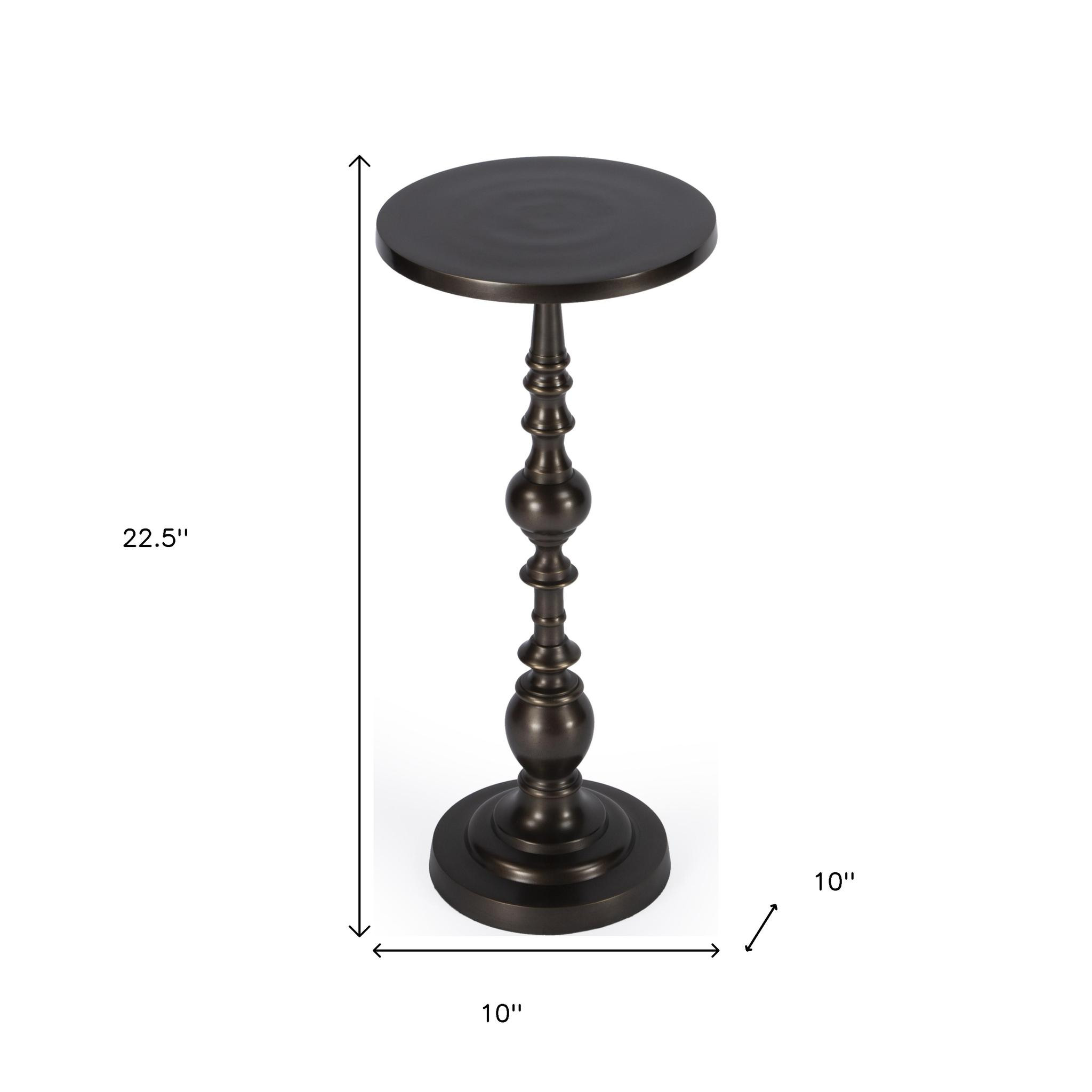 Distinctive in style the 23-inch bronze metal round pedestal end table radiates a versatile charm. This table is made from metal in a bronze color throughout the base and top. Side tables are a great way to flank your sofa, use as an accent next to your favorite chair, or can even be used bedside. You can match it with other pieces to get the ideal look for your place. 22.5-inch h x 10-inch w x 10-inch d.