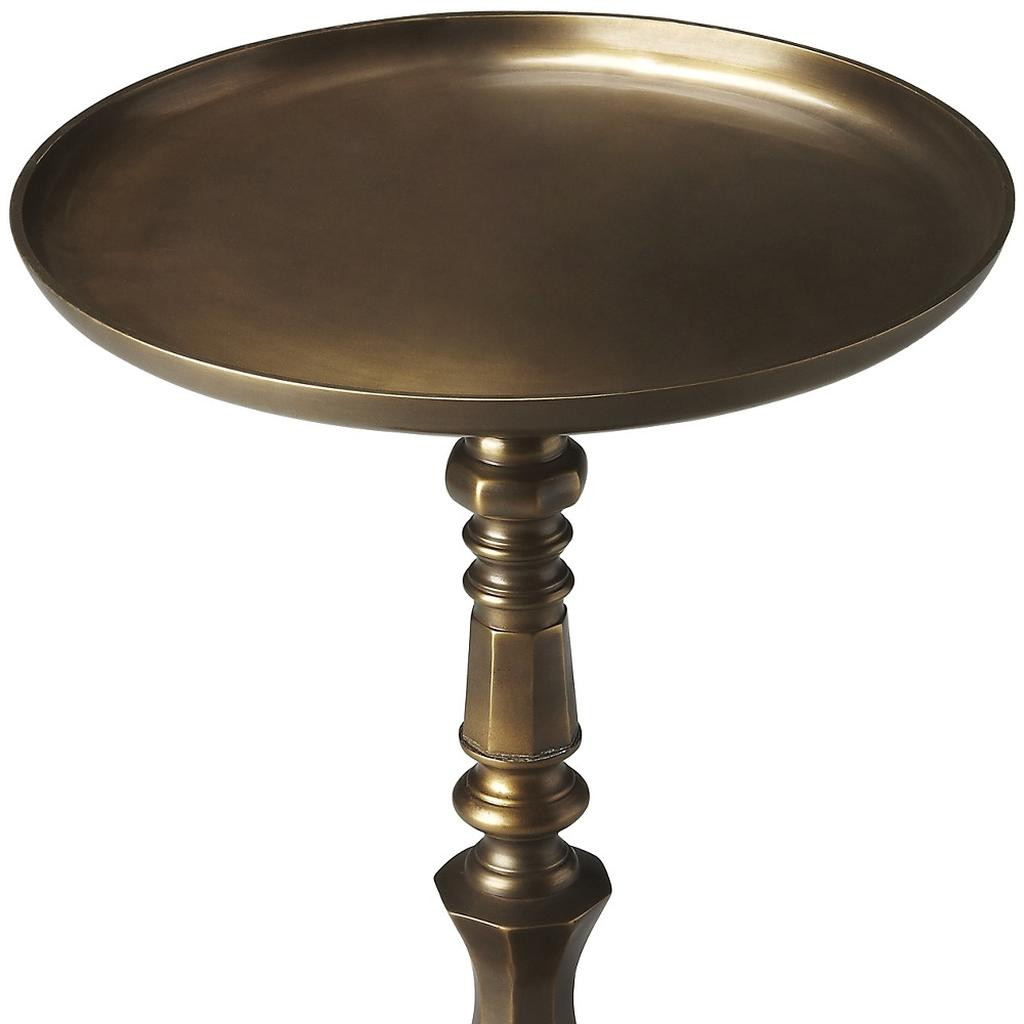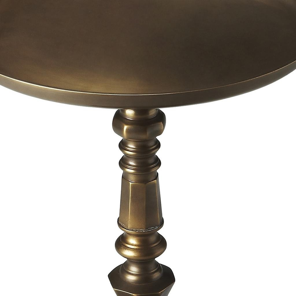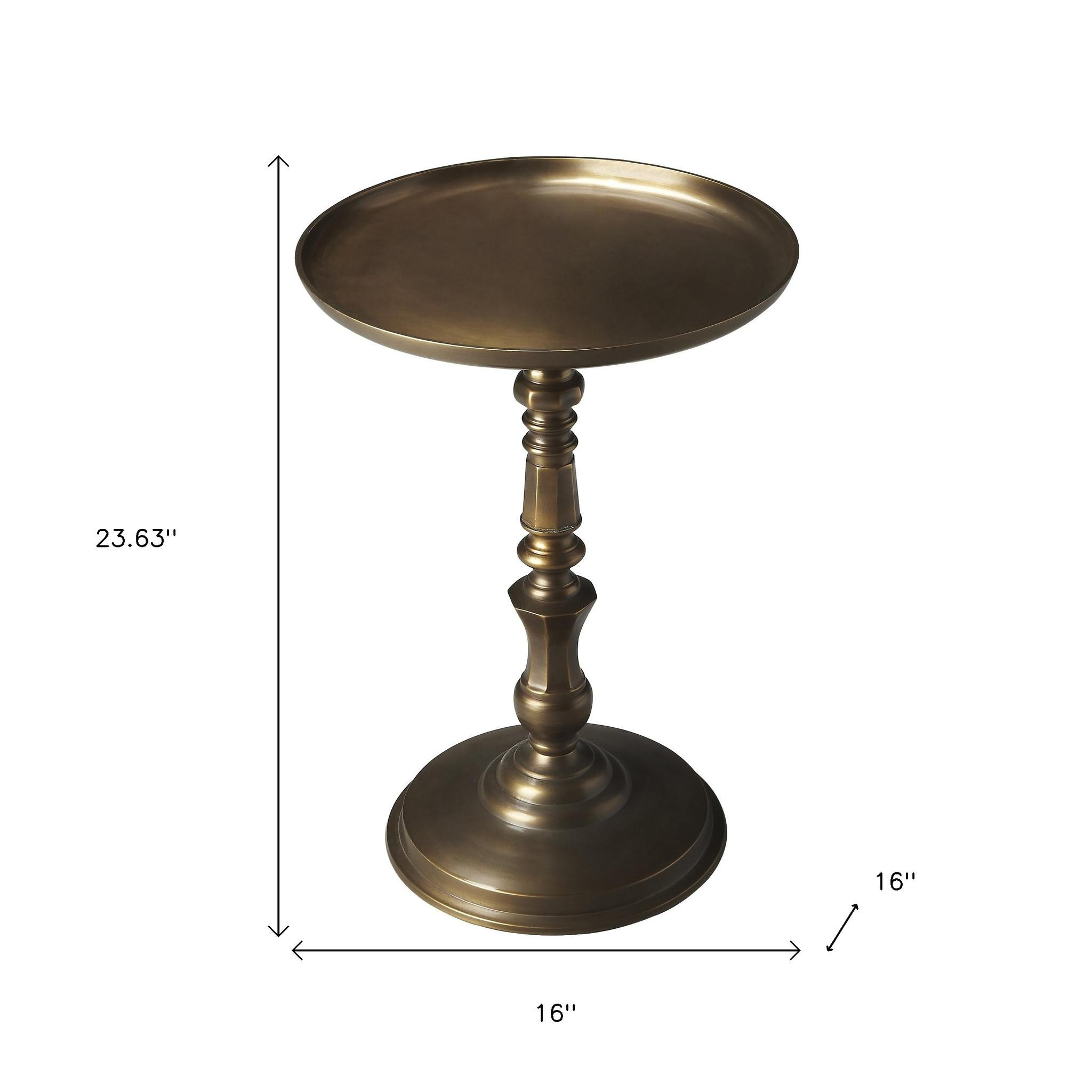 Distinctive in style the 24-inch bronze metal round pedestal end table radiates a versatile charm. This table features quality construction from metal and an updated monotone color scheme with bronze as the main color on both the top and the base. An ideal location for placing your snacks and drinks, and a place to keep your lamp, frames, or other accessories. This versatile table is a great accent for most any room. 23.63-inch h x 16-inch w x 16-inch d.