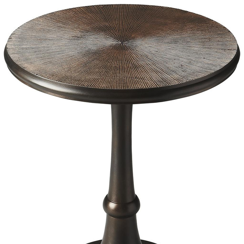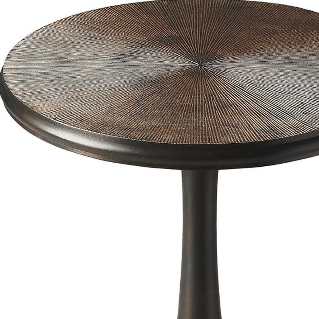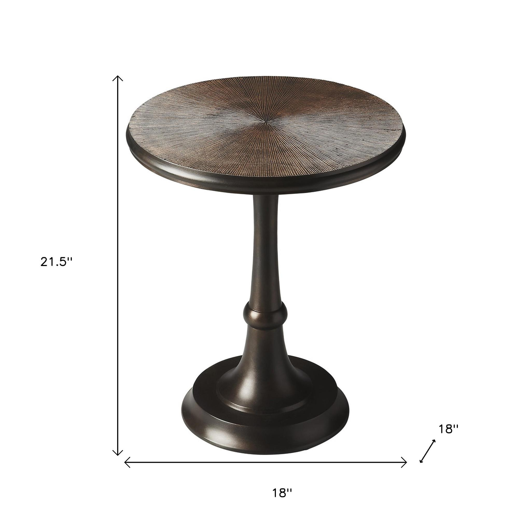 Show off your exquisite taste with this 22-inch bronze metal round pedestal end table. Made of metal, the bronze coloration throughout gives this piece an updated and refreshing look. Side tables are a great way to flank your sofa, use as an accent next to your favorite chair, or can even be used bedside. You can match it with other pieces to get the ideal look for your place. 21.5-inch h x 18-inch w x 18-inch d.