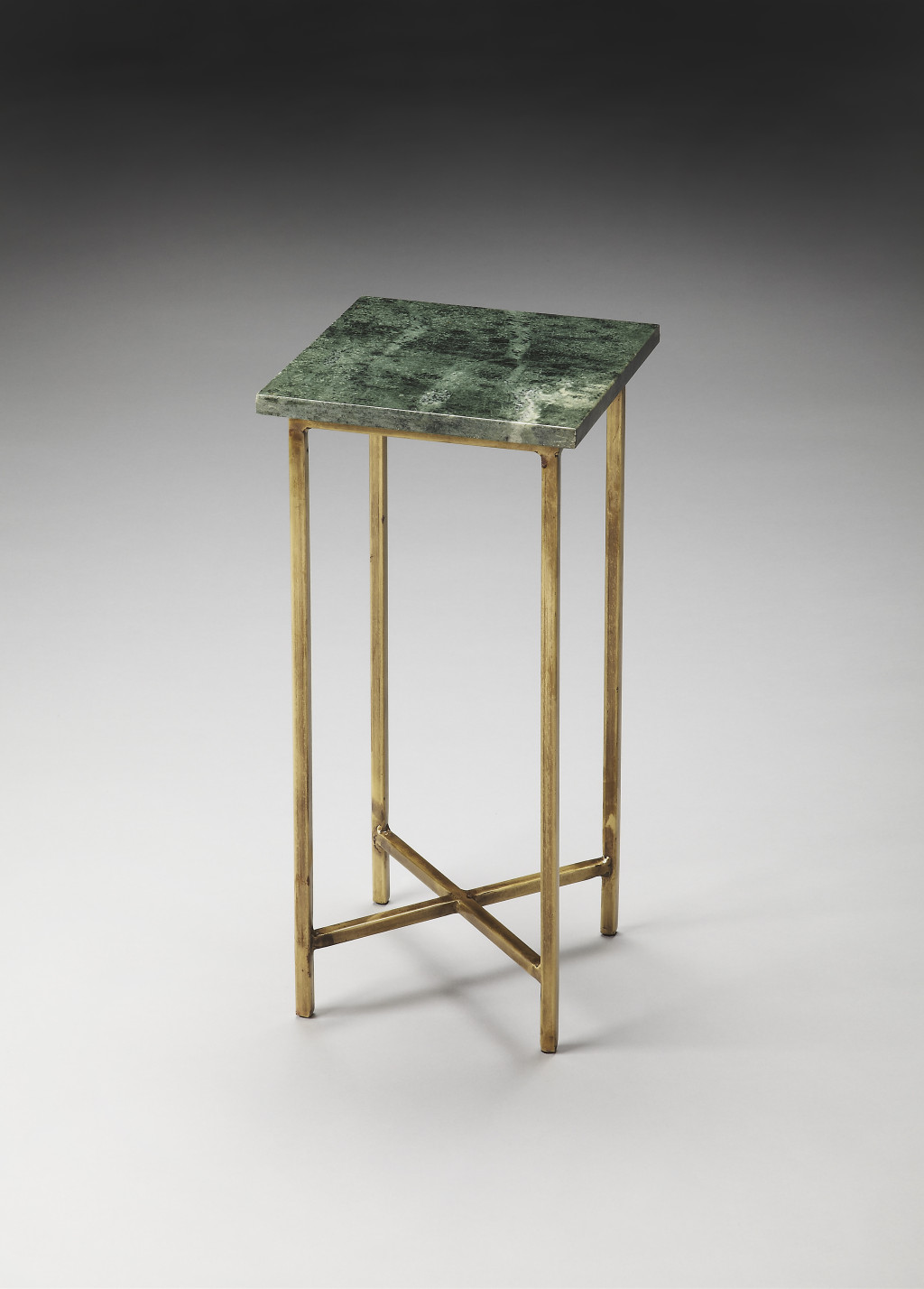 Show off your exquisite taste with this 21-inch green and gold marble square end table. The base of this table is made from iron in an open geometric gold color that is a nice contrast to the small square green marble tabletop. A great accent on either side of the sofa or next to your favorite chair, this table features a 9.5-inch tabletop surface that is a great place to hold your drinks, snacks, or small accents. You can also use it as an entryway table to hold your keys. 20.5-inch h x 9.5-inch w x 9.5-inch d.