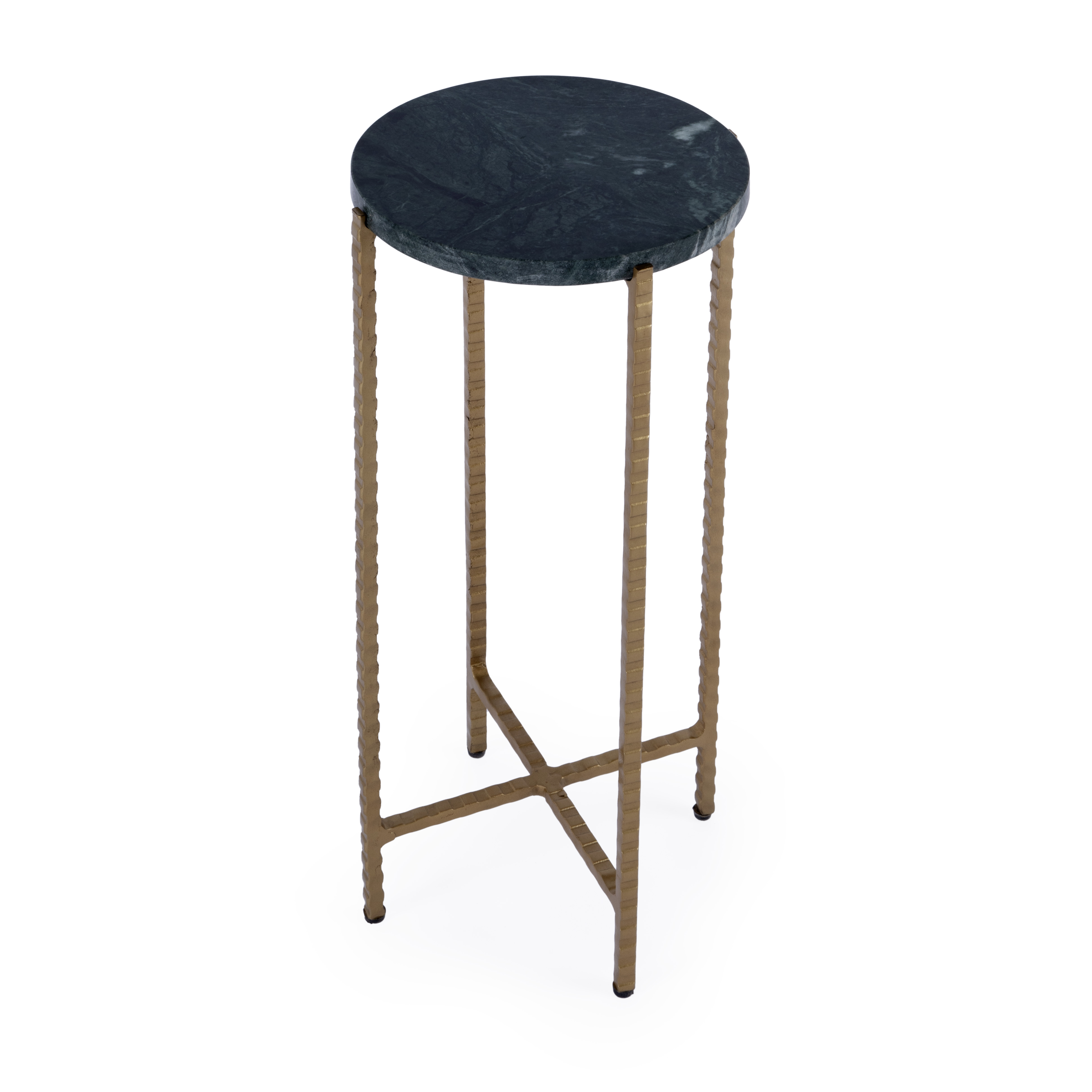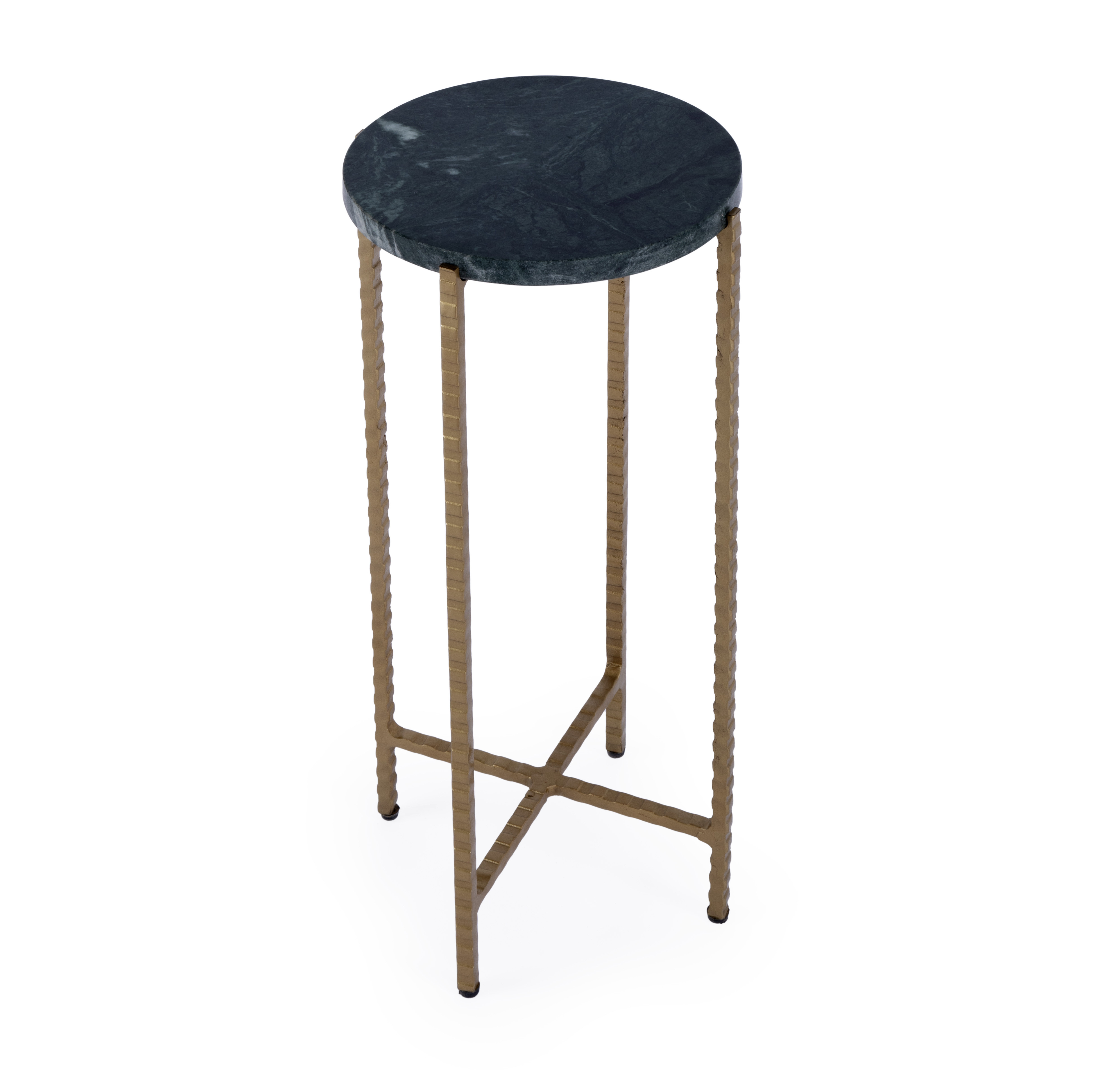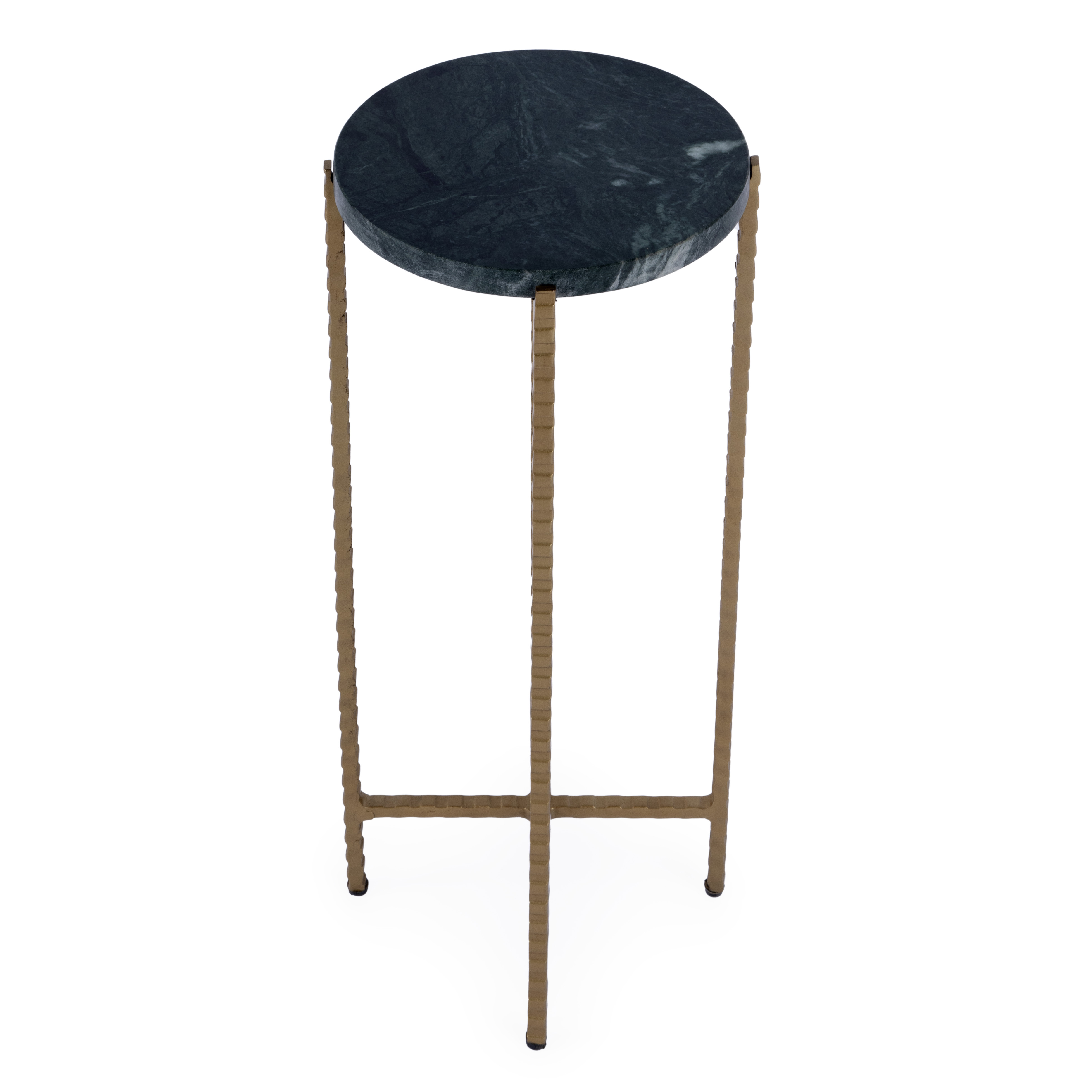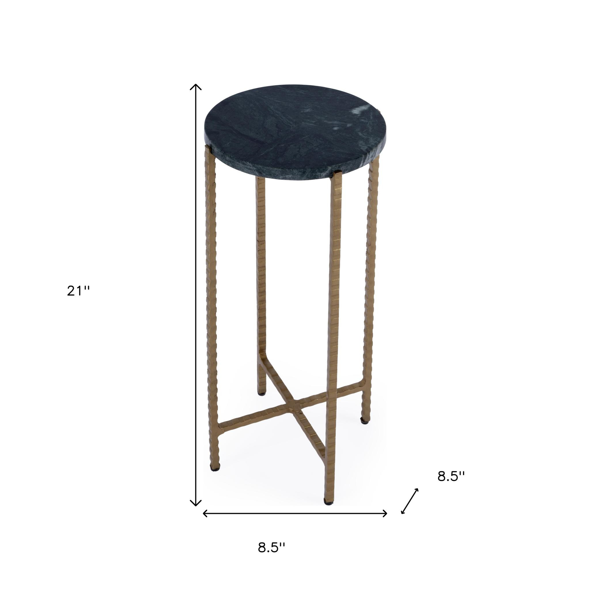 Show off your exquisite taste with this 21-inch green and gold marble and iron drink size round end table. The rustic antiqued gold coloration of the high quality iron base marries nicely with the round green marble top. A great accent on either side of the sofa or next to your favorite chair, this table features a 8.5-inch tabletop surface that is a great place to hold your drinks, snacks, or small accents. You can also use it as an entryway table to hold your keys. 21.00-inch h x 8.50-inch w x 8.50-inch d.