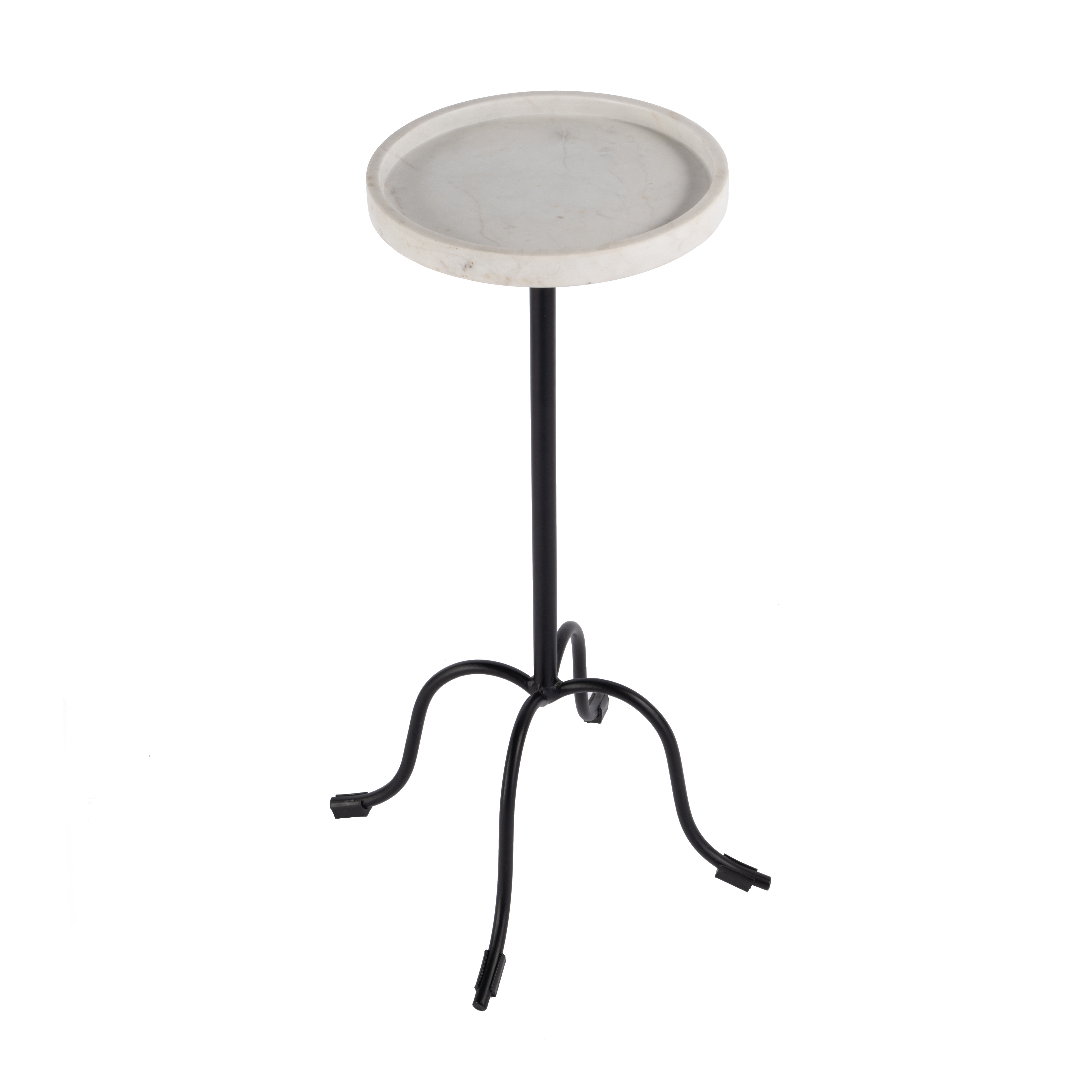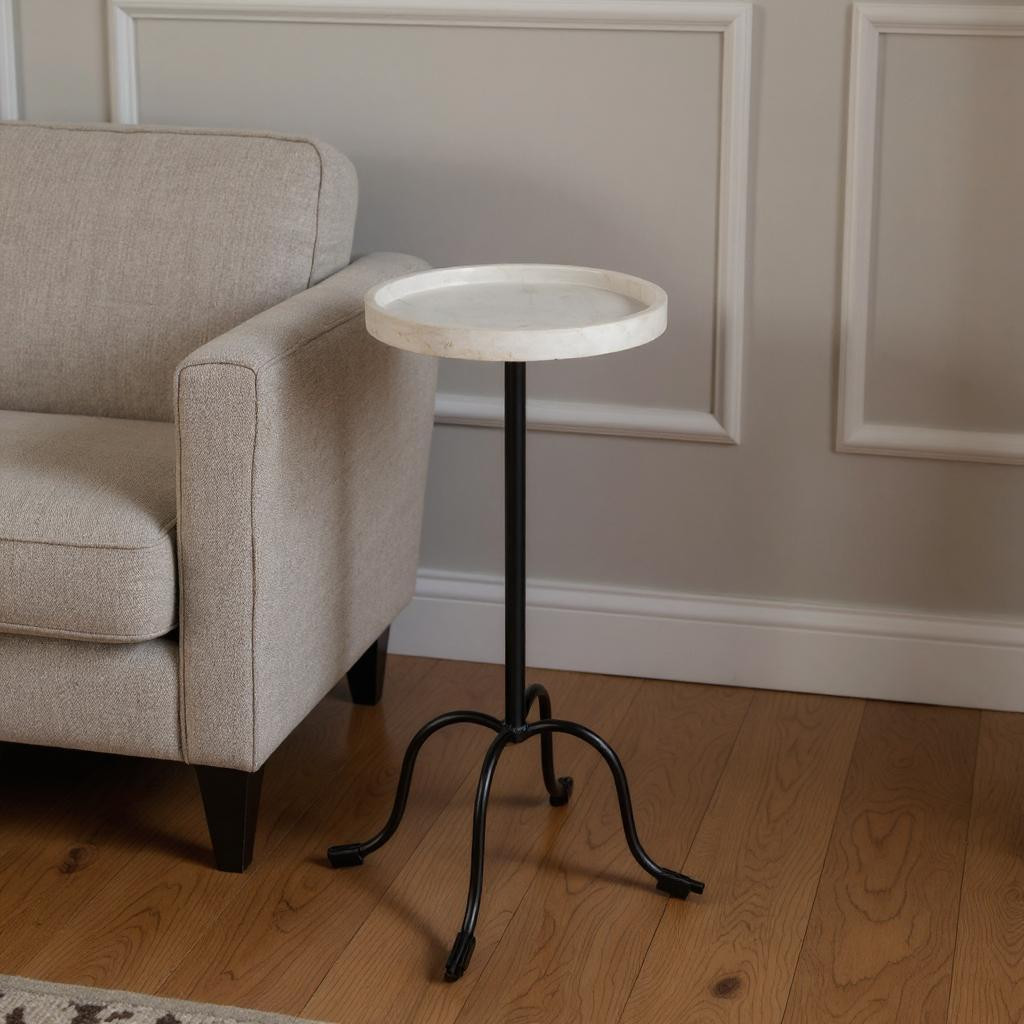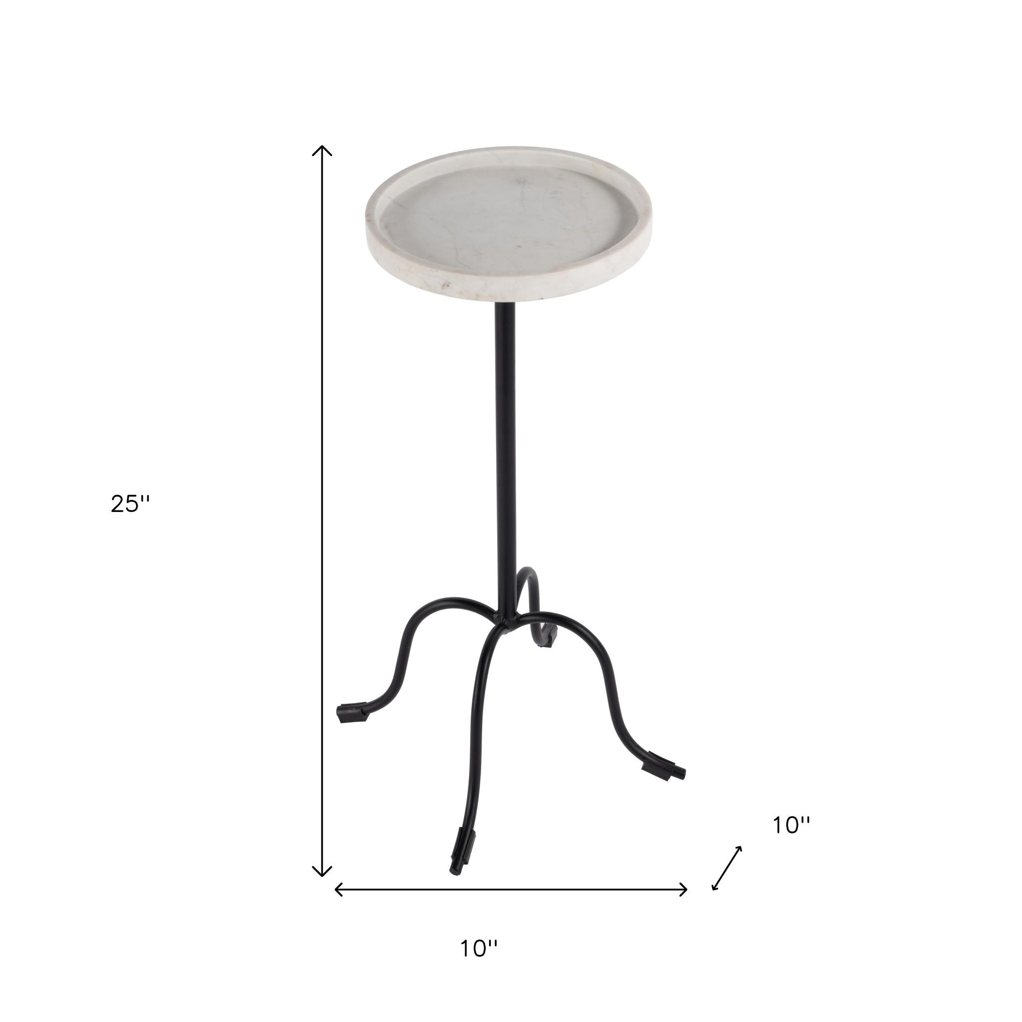 Distinctive in style the 25-inch white and black marble and iron round pedestal end table radiates a versatile charm. Quality construction from the black iron base combines with white marble of the top to give this table a fresh and updated look. Side tables are a great way to flank your sofa, use as an accent next to your favorite chair, or can even be used bedside. This versatile table is a great accent for most any room. 25-inch h x 10-inch w x 10-inch d.