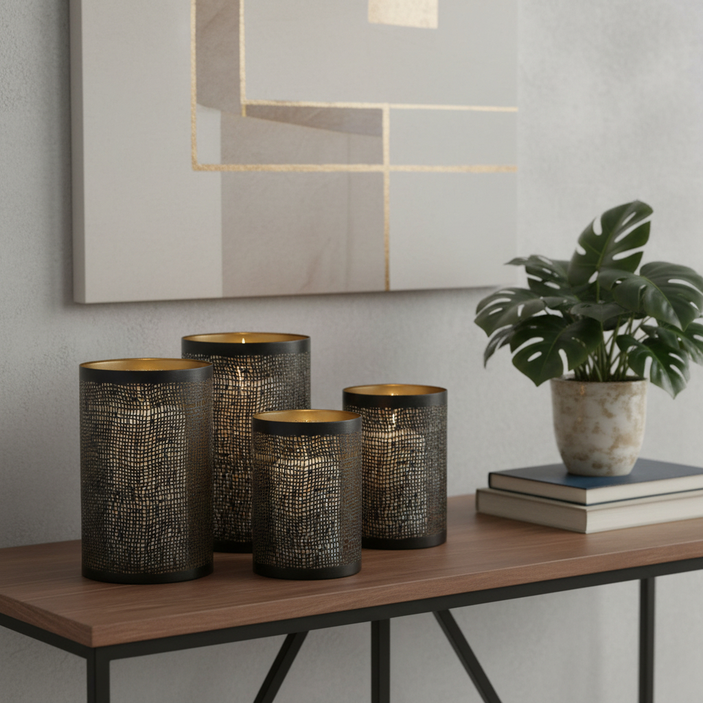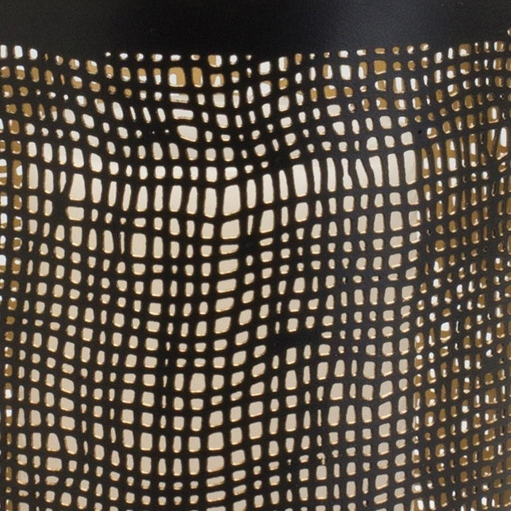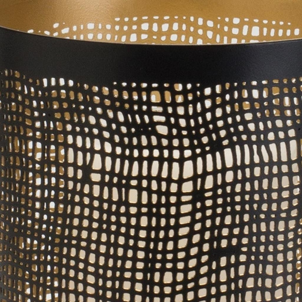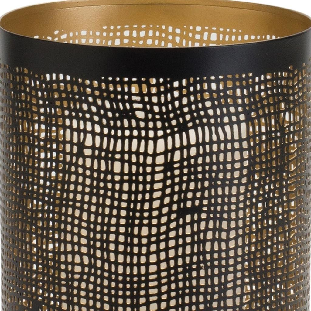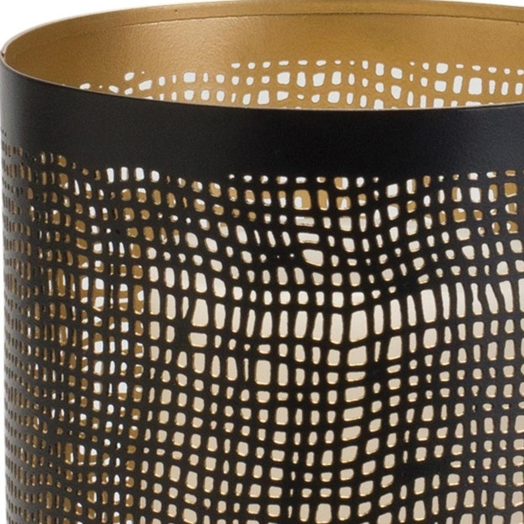 Create a warm and inviting environment in any space with this set of four black and gold distressed lattice metal tabletop hurricane candle holders. This holder arrives in a set of 4. this candleholder is the perfect illuminating design to accent your space in style. Candleholders are a decorative accent on their own. With our without candles. 8.00-inch h x 5.00-inch w x 5.00-inch d.