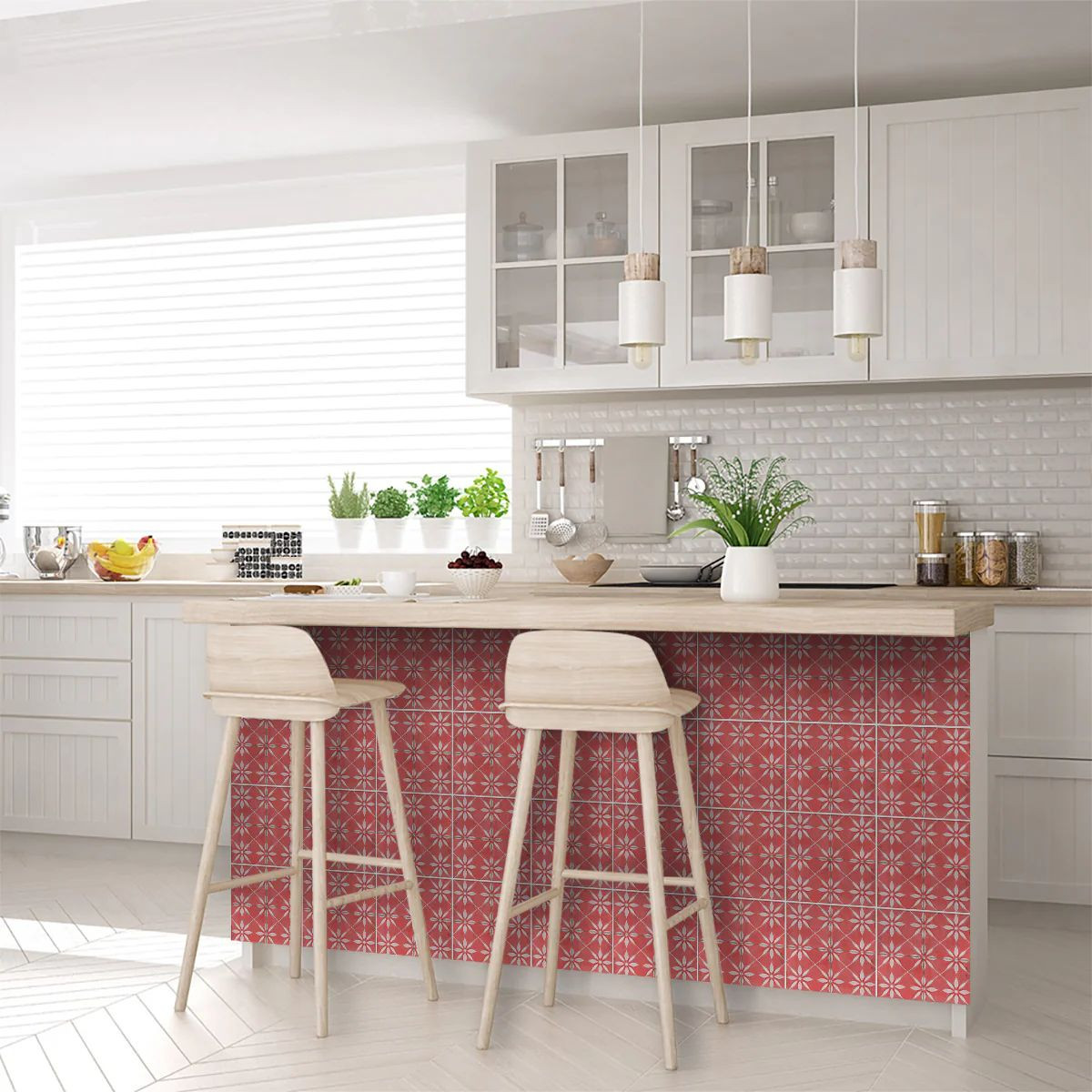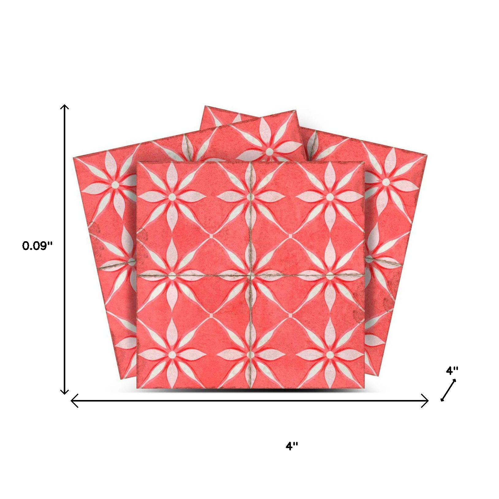 4-inch x 4-inch red vinyl arabesque peel and stick removable tiles offer a stunning and practical solution for your home decor needs. These square mosaic tiles feature an intricate arabesque pattern that adds a touch of elegance to any space. With a matte surface, they provide a sophisticated look while maintaining durability. The impervious water absorption ensures they are suitable for high-moisture areas, making them perfect for use in showers and around fireplace surrounds. Crafted from high-quality vinyl, these tiles are easy to install and can be removed without damaging the surface beneath. Their transitional style makes them versatile enough to complement various interior designs, allowing you to refresh your home effortlessly. 0.09-inch h x 4-inch w x 4-inch d.