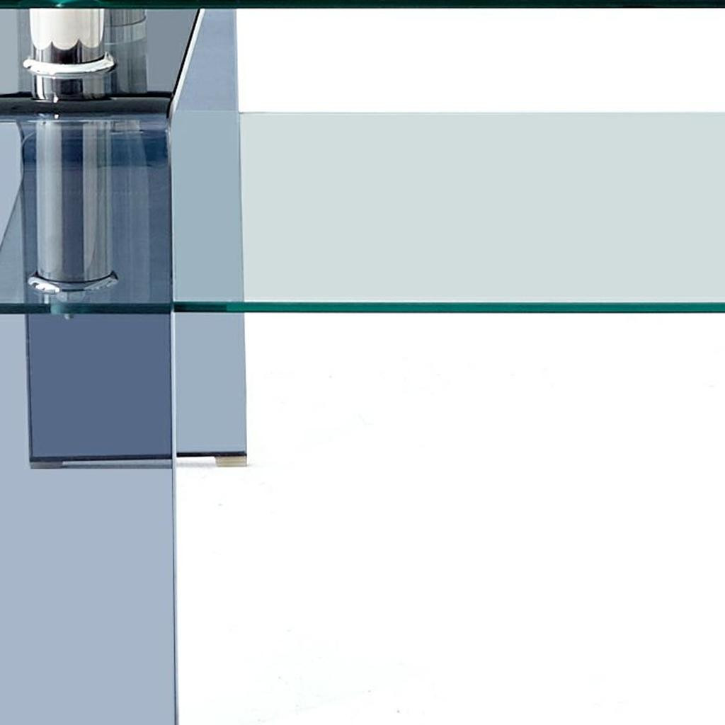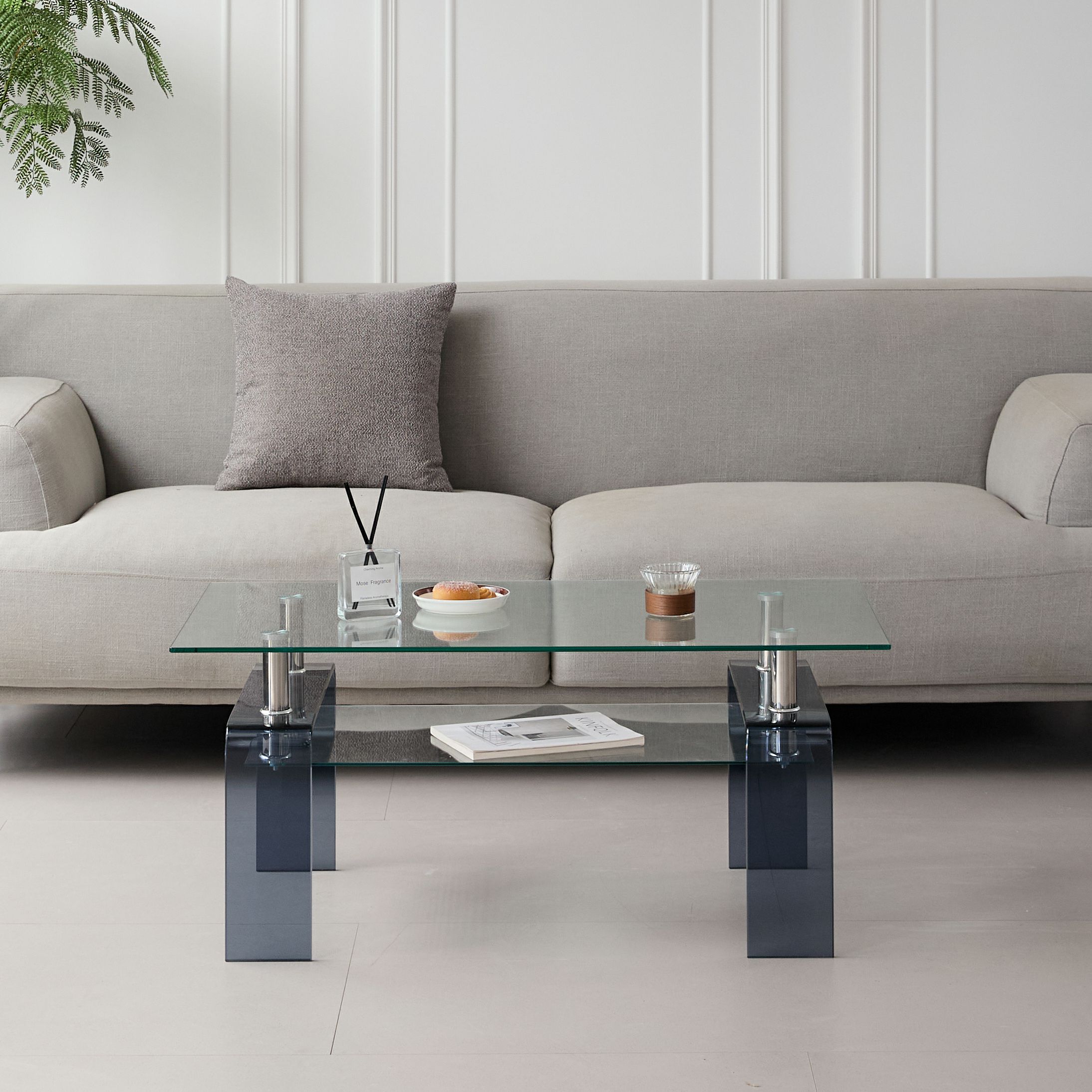 This stylish 39-inch clear and black glass coffee table with shelf is sure to inspire compliments no matter where it sits. The top of this glass table is clear, while the base is a nice compliment in black tint. Includes a single shelf for handy storage or display space. This modern rectangular table will be a great accent in any room it has an attractive design that will definitely breathe some fresh air into your interior. 17.70-inch h x 39.30-inch w x 21.60-inch d.