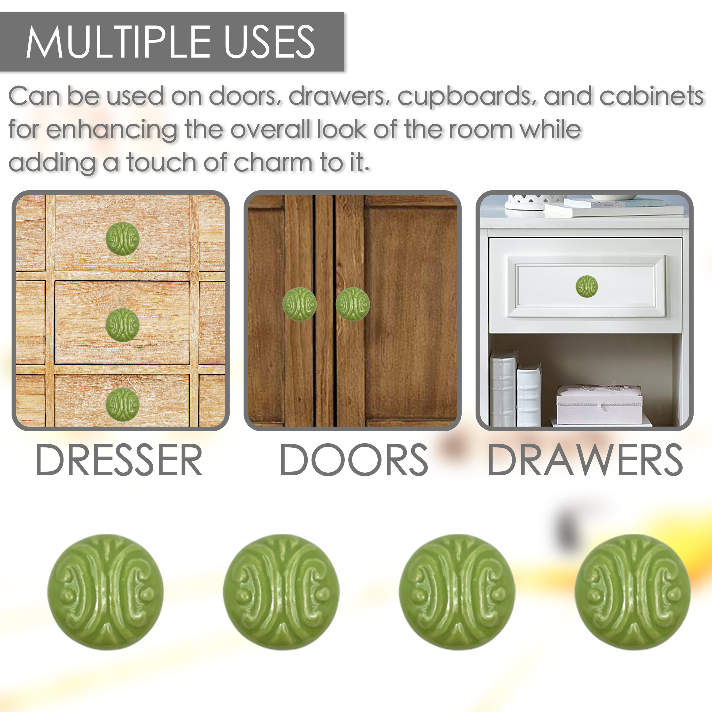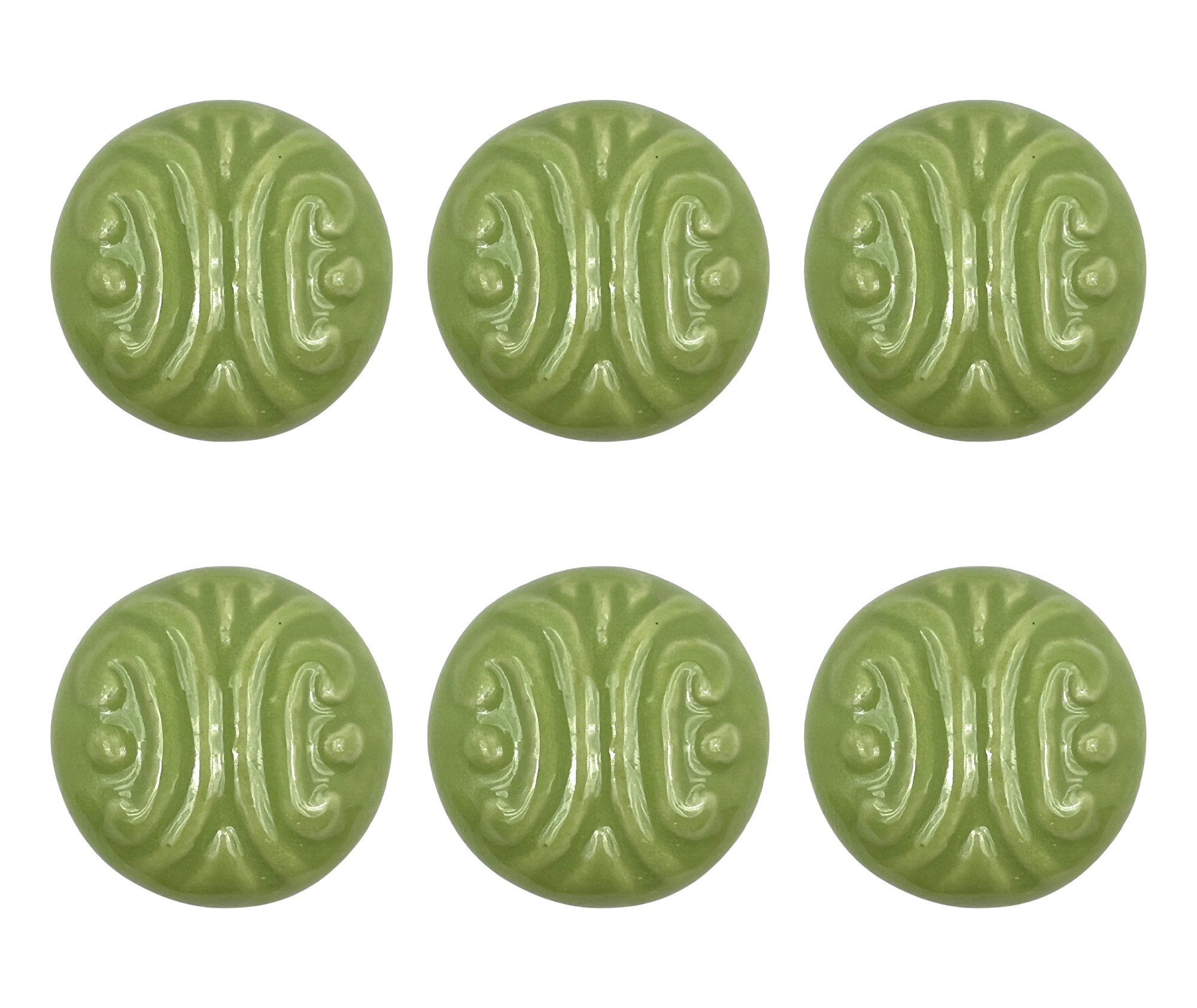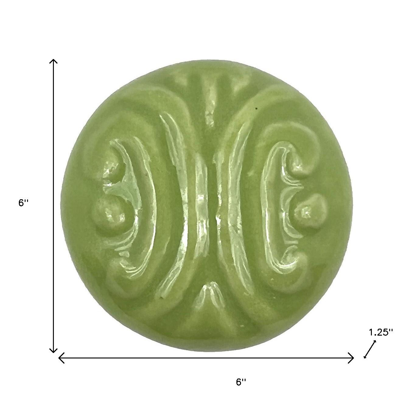 Transform your space quickly and easily with this set of six green embossed ceramic drawer pull knobs. Hand-painted by talented artisans, these knobs will add a touch of artisanal design. The solid color with embossed decoration complements various decor styles. Made from high-quality ceramic, these knobs ensure durability while enhancing the aesthetics of your furniture. Each knob comes with screws included for hassle-free installation. Elevate your cabinetry or furniture with this unique set, designed to bring a fresh and vibrant look into your home. 6-inch h x 6-inch w x 1.25-inch d.