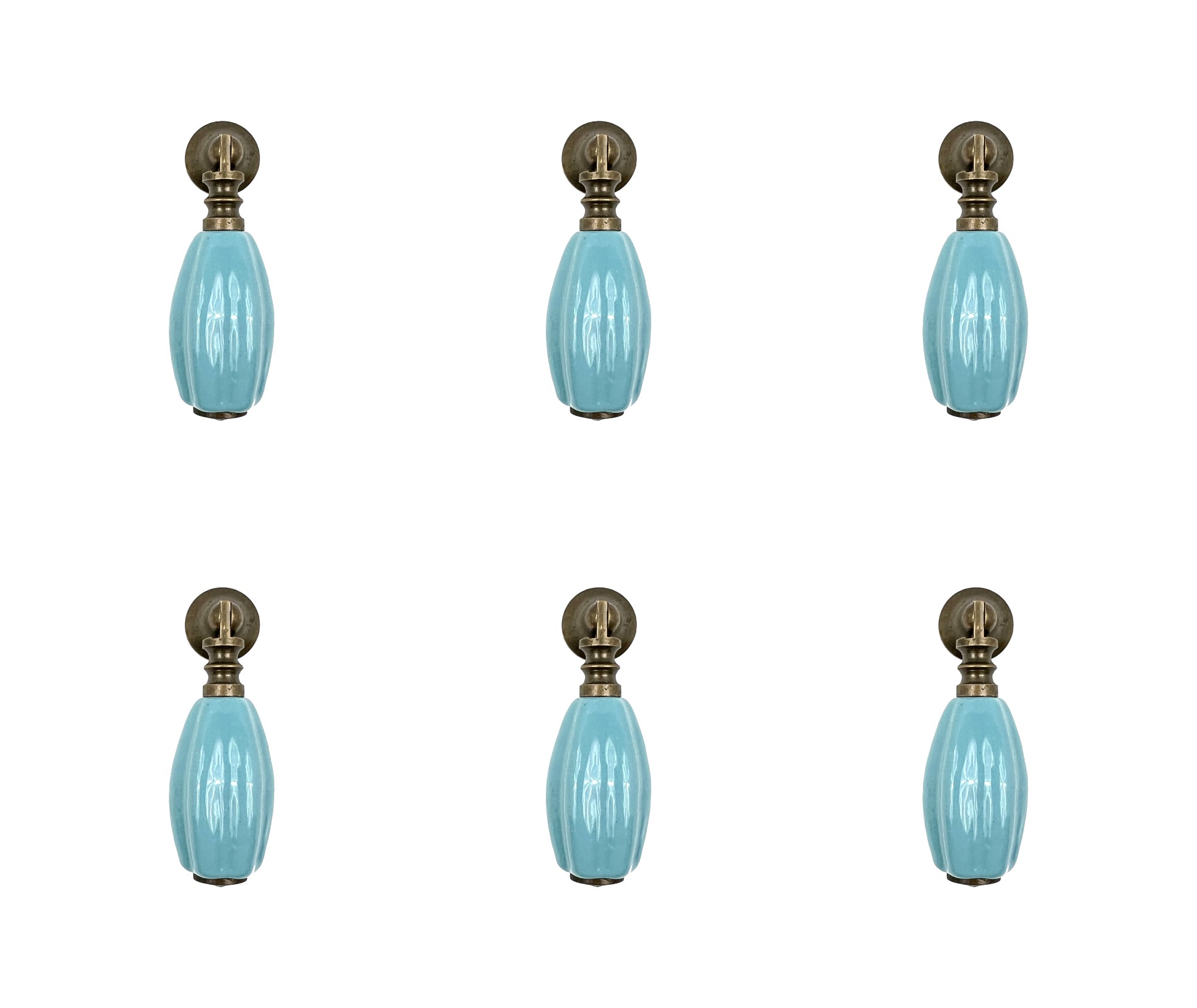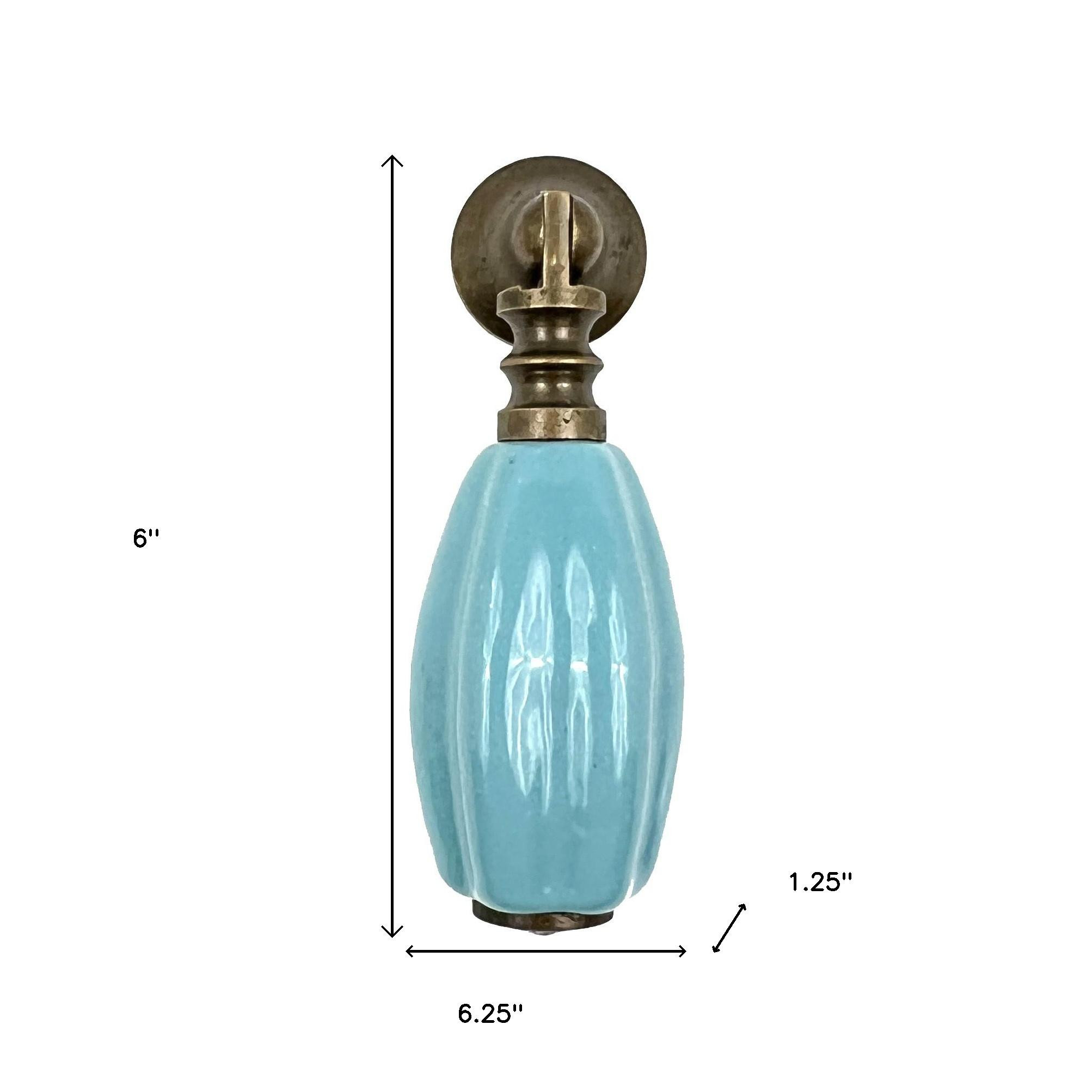 Transform your space quickly and easily with this set of six aqua and brown ribbed ceramic drawer pull knobs. Hand-painted by talented artisans, these knobs will add a touch of artisanal design. The oval shape and vertical hanging design offers a unique aesthetic that enhances both traditional and modern decor. Crafted from high-quality ceramic, these knobs ensure durability while maintaining their vibrant colors. Each set includes screws for effortless installation, making it simple to refresh your furniture. Elevate your cabinetry or furniture with this charming and practical accessory that combines style with functionality. 6-inch h x 6.25-inch w x 1.25-inch d.
