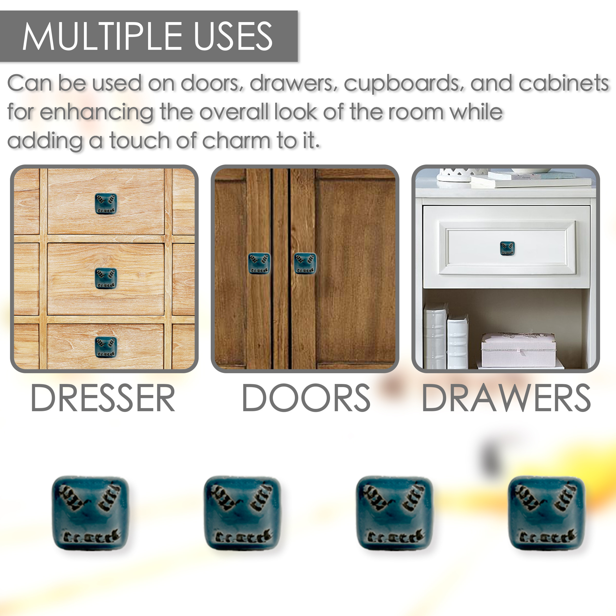 Transform your space quickly and easily with this set of six distressed teal ceramic square drawer pull knobs. Hand-painted by talented artisans, these knobs will add a touch of artisanal design. The square shape provides a modern flair that complements various decor styles. Crafted from durable ceramic, these knobs are built to last while enhancing your furniture's aesthetic. Each knob is thoughtfully designed and features a distressed finish, ensuring a unique character that stands out. Additionally, screws are included for your convenience, making installation a breeze and allowing you to refresh your home effortlessly. 6-inch h x 6.25-inch w x 1.5-inch d.