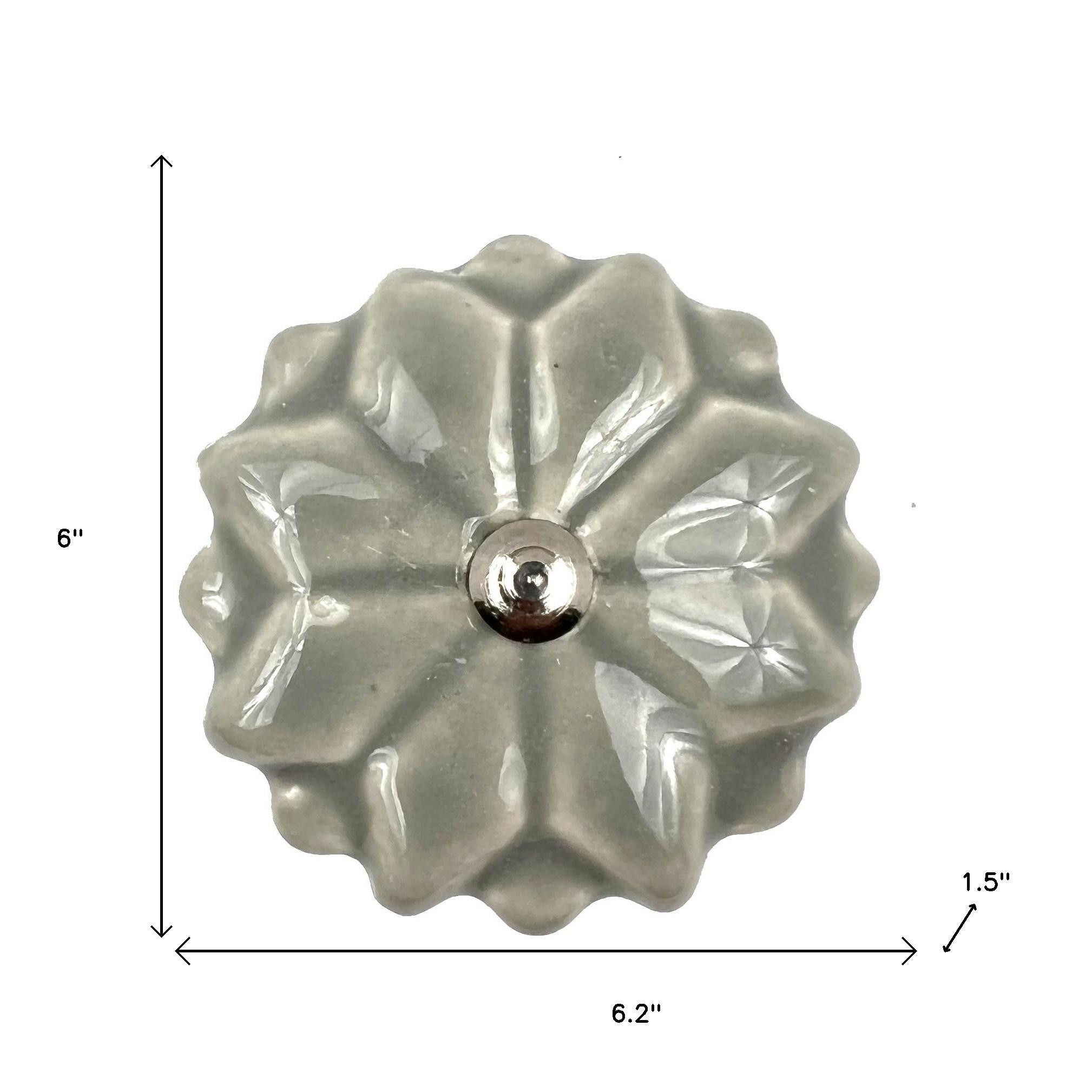 Transform your space quickly and easily with this set of six gray ceramic drawer pull knobs. Hand-painted by talented artisans, these knobs will add a touch of artisanal design. Their round embossed floral shape offers a classic aesthetic that complements various decor styles. Crafted from high-quality ceramic, each knob showcases unique patterns and textures, making them a perfect choice for enhancing any room. With screws included, installation is a breeze, allowing for a seamless update to your furniture. Enjoy the perfect balance of form and function as you refresh your cabinets and drawers with these exquisite knobs. 6-inch h x 6.2-inch w x 1.5-inch d.