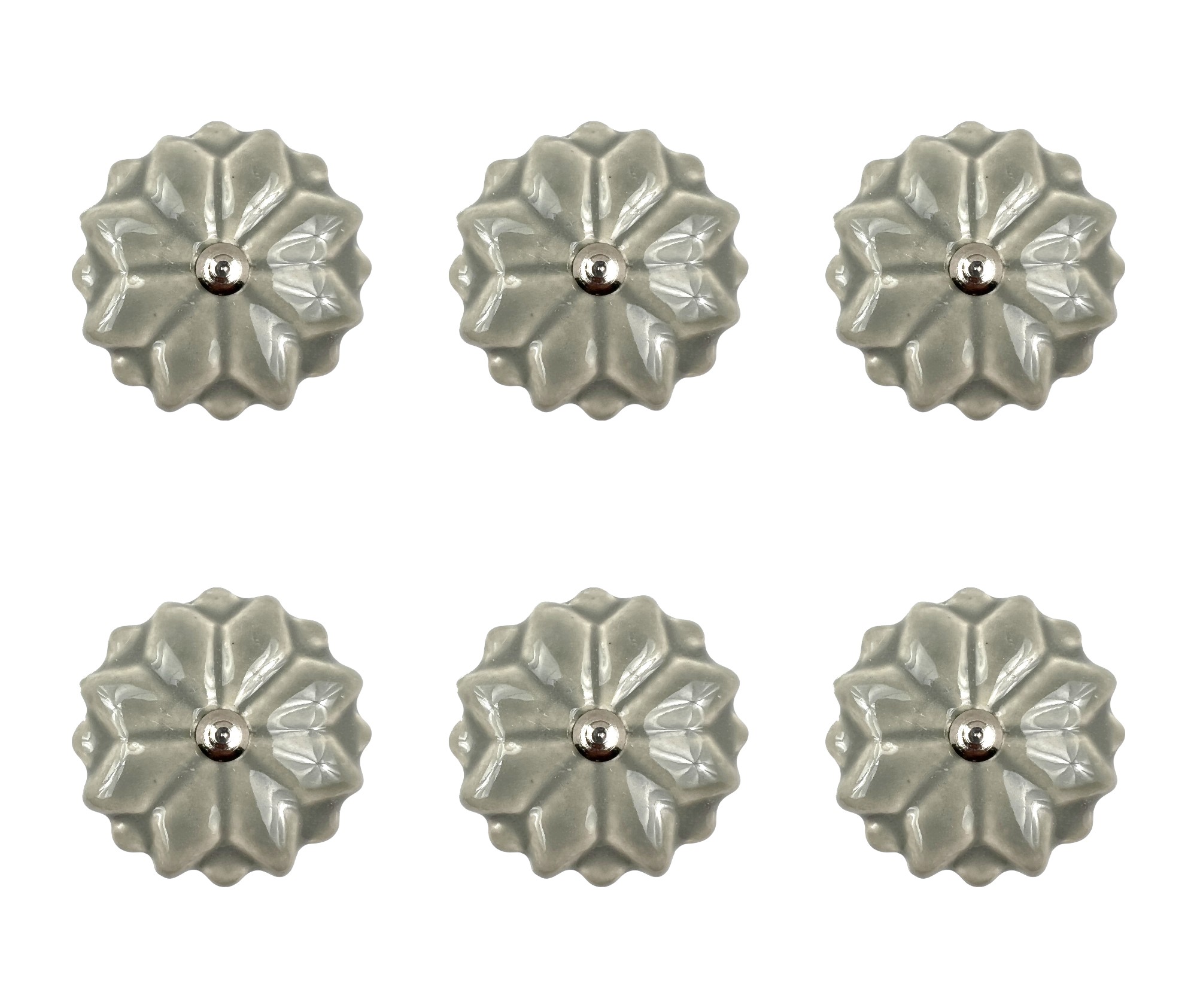 Upgrade your space with a high end look with this set of six gray ceramic drawer pull knobs. These round floral knobs are crafted from durable ceramic, ensuring both elegance and longevity in your home decor. Each piece is meticulously hand-painted, showcasing the skill and creativity of talented artisans. The included screws make installation a breeze, allowing you to effortlessly enhance your furniture. Perfect for dressers, cabinets, or any space that could use a stylish upgrade, these knobs will transform your interiors with their unique charm. 6-inch h x 6.25-inch w x 2-inch d.