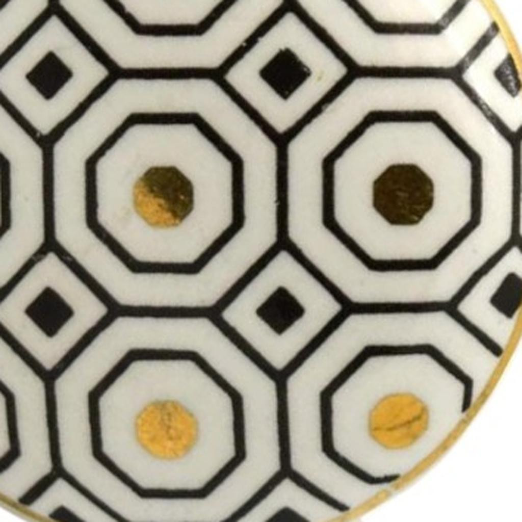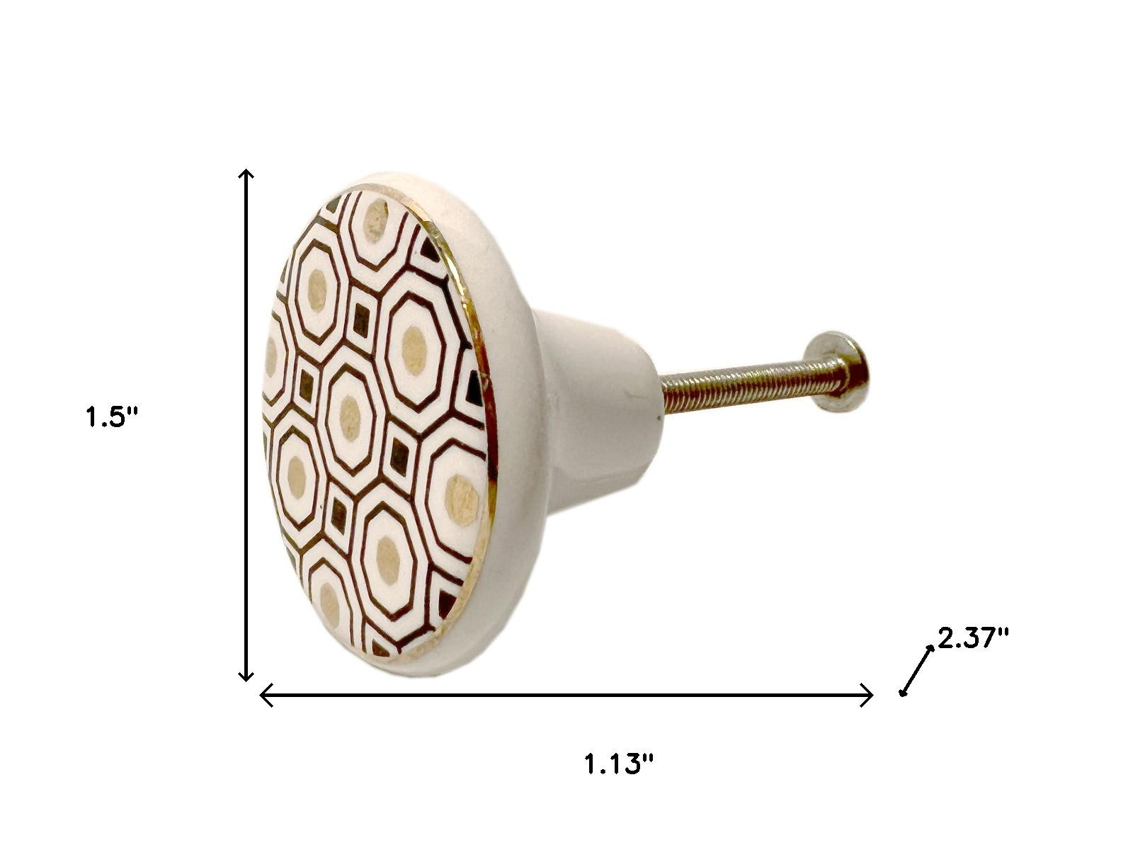 Upgrade your space with a high end look with this set of six gold silver and white geometric ceramic drawer pull knobs. Hand-painted by talented artisans, these knobs will add a touch of artisanal design. The round shape provides a contemporary flair, making them a stylish addition to any drawer or cabinet. Crafted from ceramic, each piece combines durability with elegance. Complete with screws included, installation is hassle-free and straightforward. Elevate your home decor effortlessly with these distinctive and beautifully crafted knobs. 1.50-inch h x 1.13-inch w x 2.37-inch d.