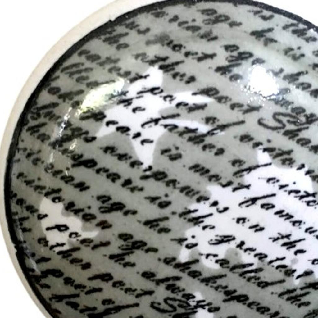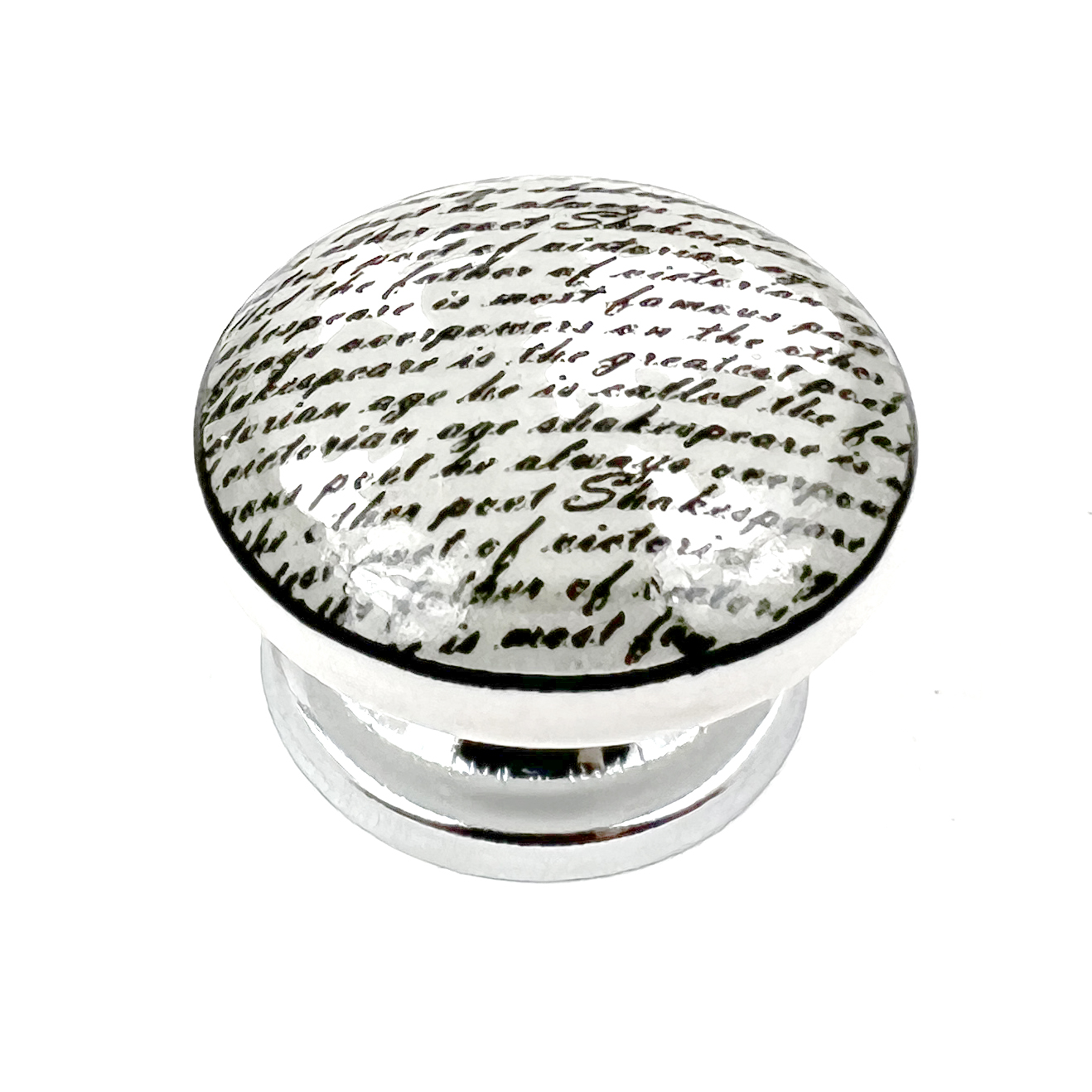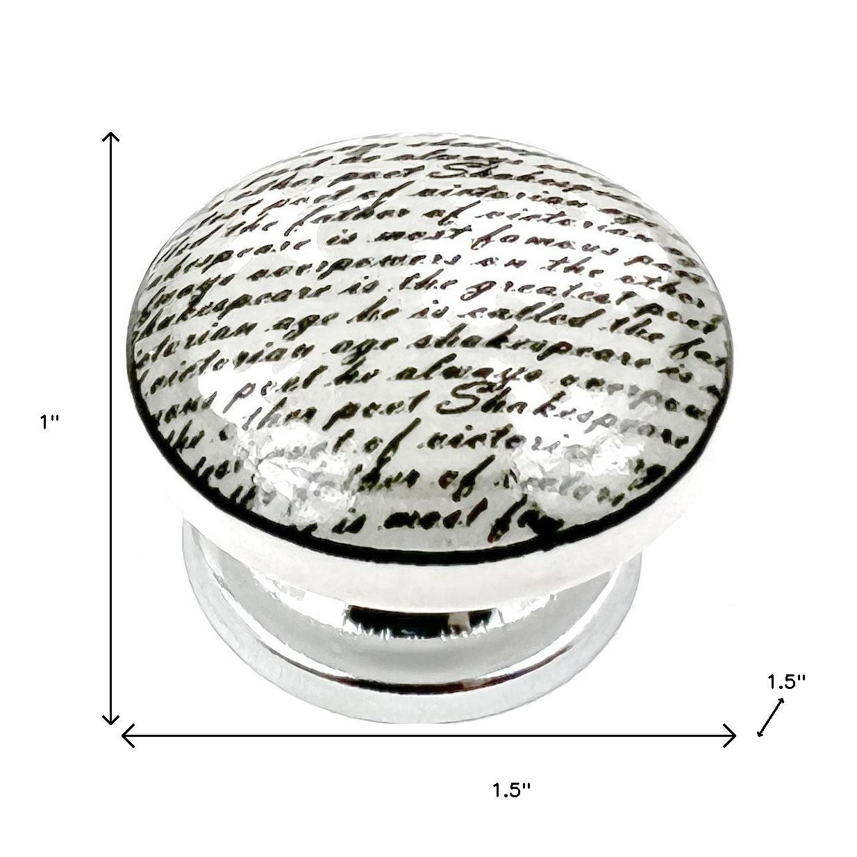 Upgrade your space with a high end look with this set of six white poetic script ceramic drawer pull knobs. The round knob shape offers a comfortable grip, enhancing functionality while maintaining elegance. Crafted from durable ceramic, these knobs combine both aesthetic appeal and longevity. Each knob features distressed poetic script that will bring a touch of creativity and unique style to your furniture and room. With screws included, installation is effortless, allowing you to transform your cabinets or drawers in no time. 1.00-inch h x 1.50-inch w x 1.50-inch d.