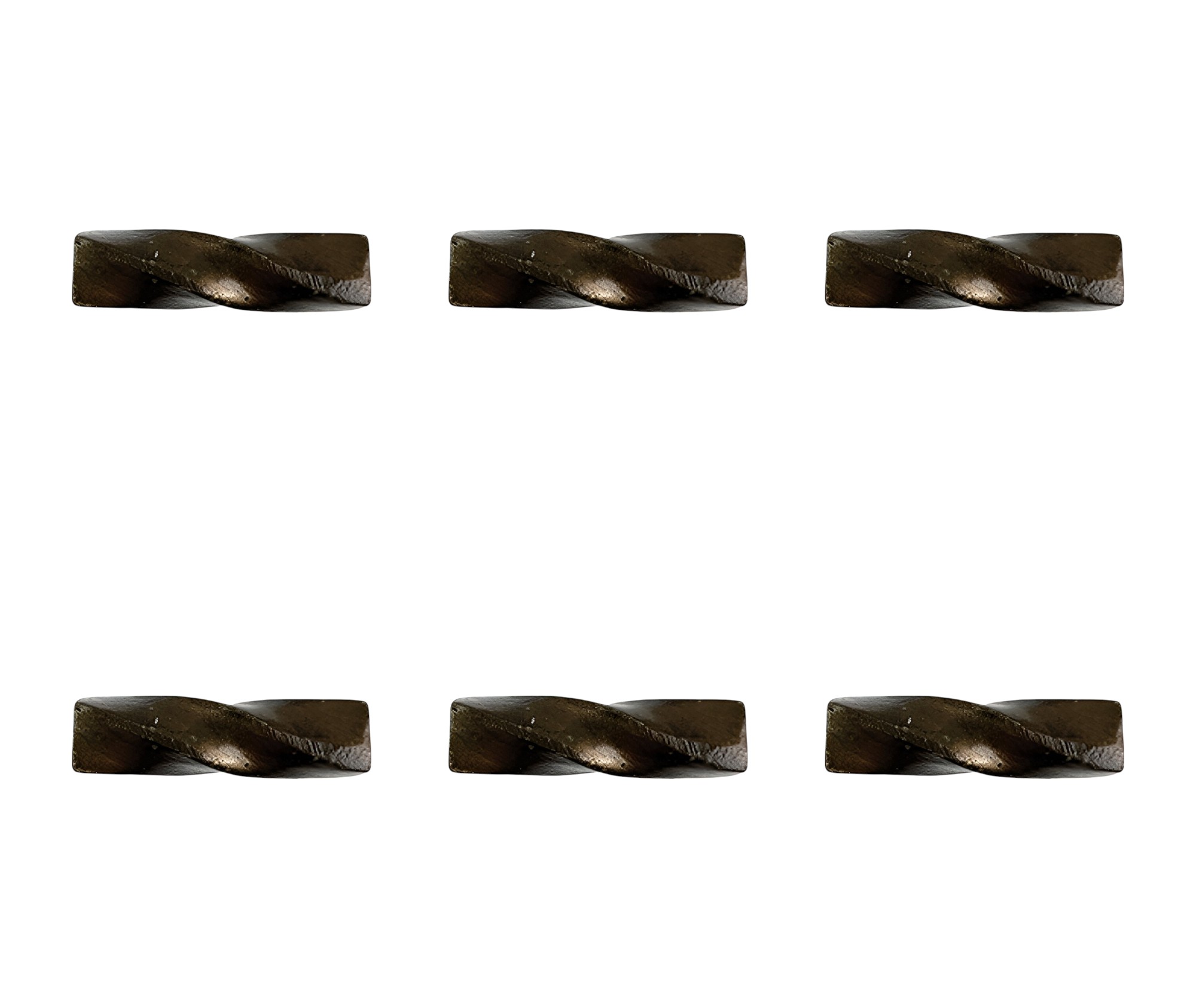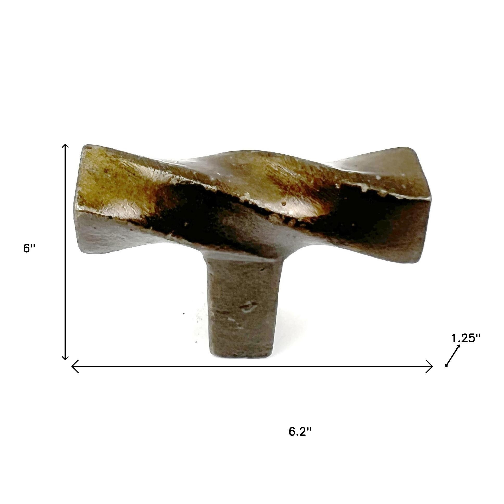 Give your drawers or cabinets a facelift with this set of six distressed bronze twisted geometric metal drawer pull knobs. Crafted from durable cast aluminum, these unique handles feature a purposeful distressing and twisted shape that adds a unique vintage touch that complements various decor styles. Each knob features exquisite hand-crafted detailing, showcasing the talent of skilled artisans. With screws included, installation is simple and hassle-free, allowing you to effortlessly enhance the look of your furniture. Transform any space with this stylish and functional addition. 6-inch h x 6.2-inch w x 1.25-inch d.