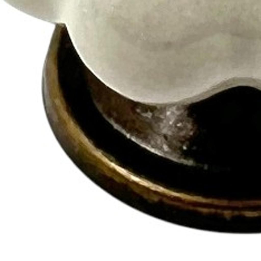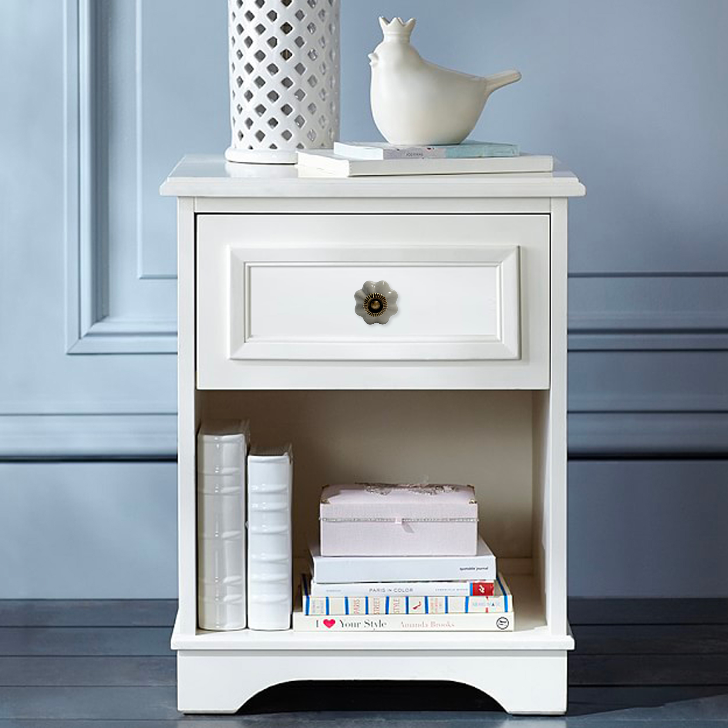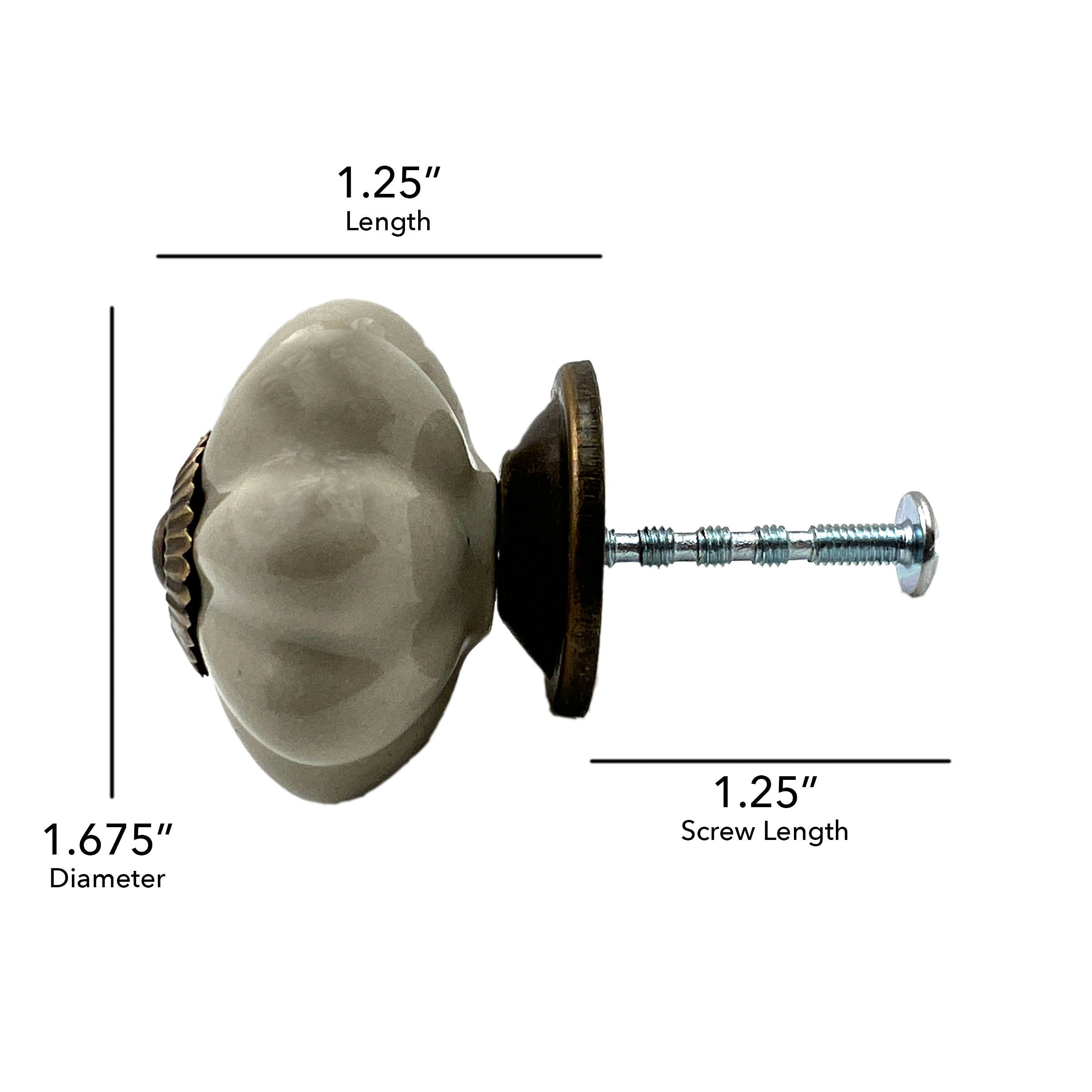 Upgrade your space with a high end look with this set of six gray ceramic floral shape drawer pull knobs. Featuring a fun scalloped floral shape, these knobs infuse a botanical theme into your decor. The reactive glaze with distressing and antiqued bronze center accents adds a touch of vintage charm, making each piece uniquely beautiful. With screws included for easy installation, you can effortlessly enhance your cabinets or drawers. Each knob combines functionality and elegance, creating a delightful accent for any room. 1.00-inch h x 1.50-inch w x 1.50-inch d.