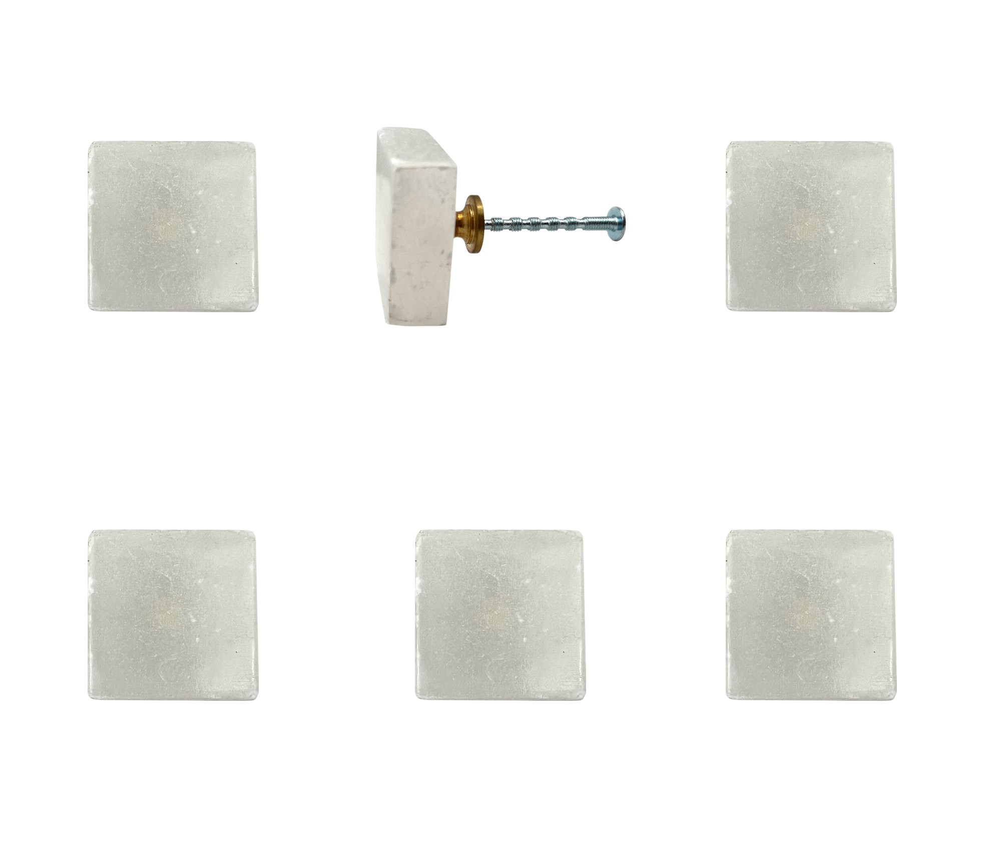 Give your drawers or cabinets a facelift with this set of six white stone square drawer pull knobs. These knobs feature a modern square shape that perfectly complements any contemporary decor. Crafted from durable stone, they offer a robust solution for both functionality and style. The set includes screws for easy installation, making it simple to upgrade your furniture. With a total of six knobs, you have enough to enhance multiple cabinets or drawers throughout your home. 6.00-inch h x 5.00-inch w x 1.50-inch d.