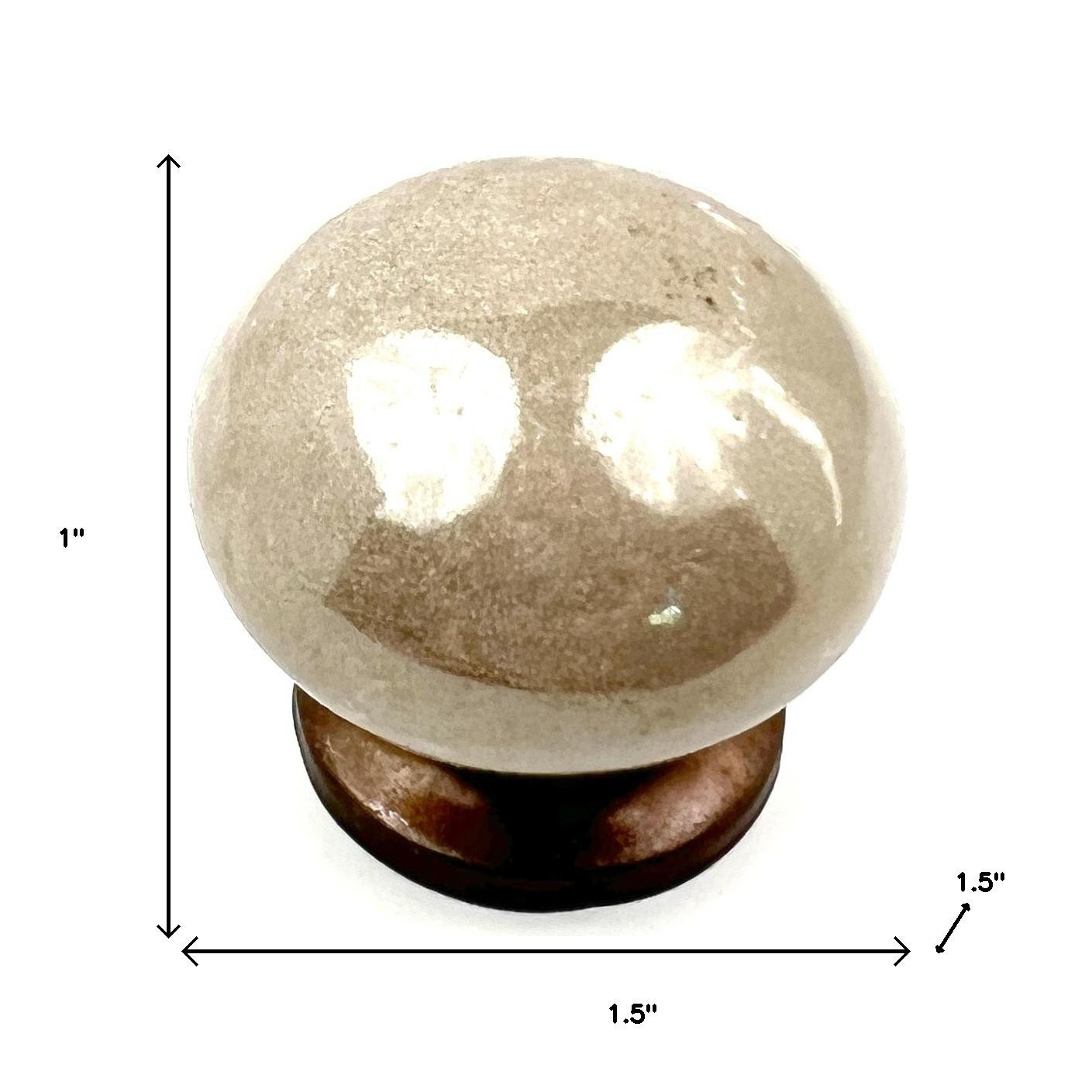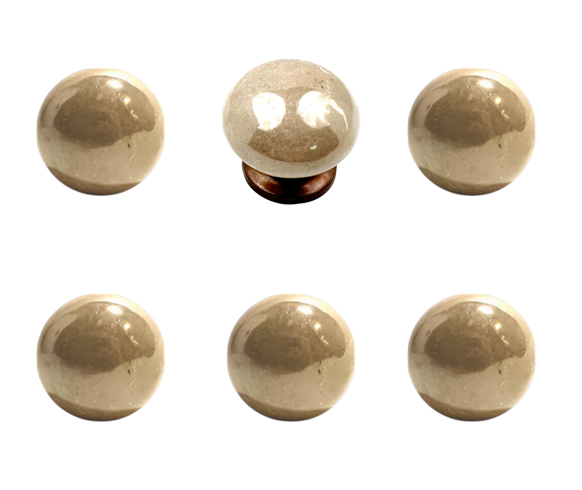 Give your drawers or cabinets a facelift with this set of six tan ceramic mushroom shape drawer pull knobs. These charming mushroom shaped knobs are crafted from high-quality ceramic, ensuring durability and a stylish finish. Featuring a glossy ceramic glaze that gives a slightly metallic look, these hand painted knobs will breath new life to your space. With screws included, installation is quick and straightforward, allowing you to transform your space effortlessly. This set of six allows for ample use throughout your home, making them a practical choice for enhancing décor in multiple areas. 1.00-inch h x 1.50-inch w x 1.50-inch d.