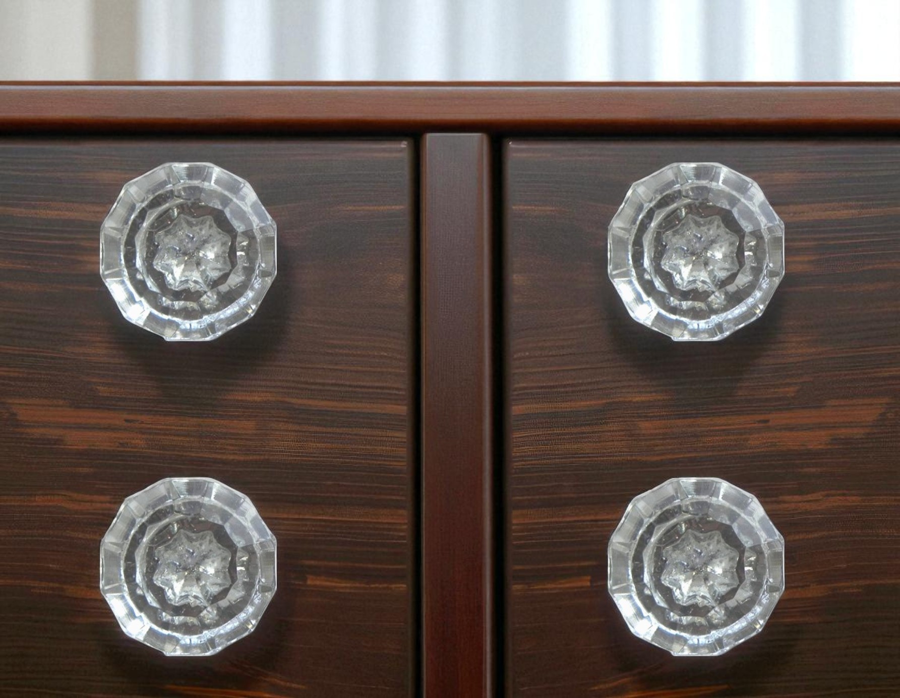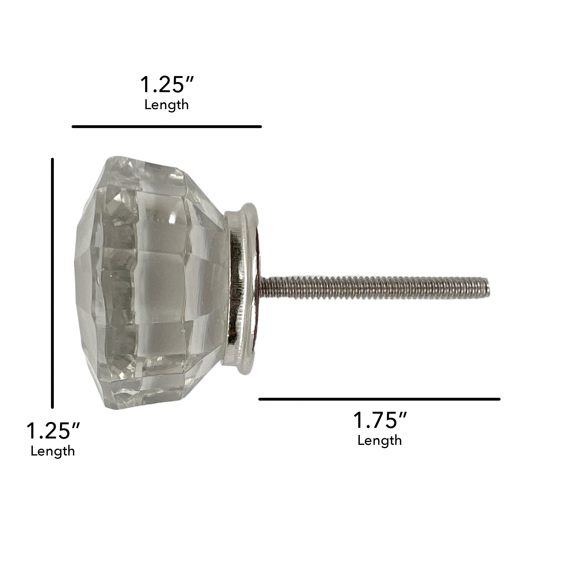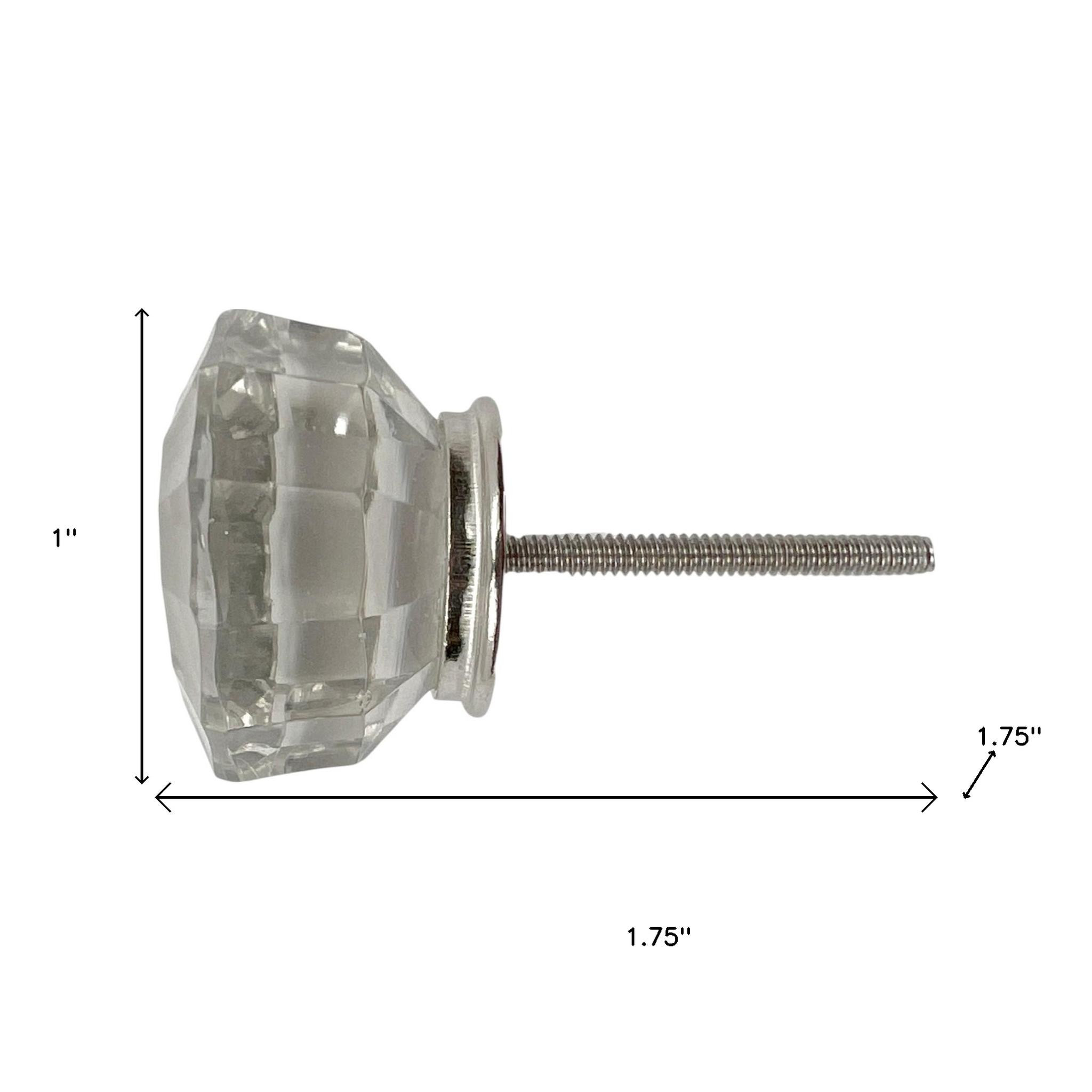 Give your drawers or cabinets a facelift with this set of six clear faceted glass drawer pull knobs. Improve the look of your old boring or builder grade furniture and cabinetry with these high quality geometric faceted knobs. With a total of six knobs in this set, you can seamlessly enhance multiple drawers or cabinets, allowing for a cohesive look throughout your home. Embrace elegance and functionality with this stylish addition to your decor.1-inch h x 1.75-inch w x 1.75-inch d.