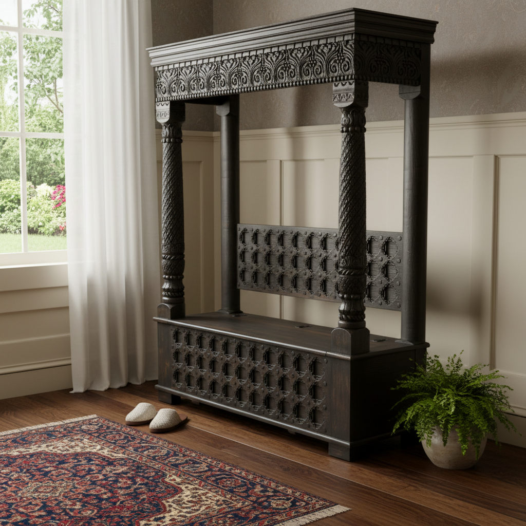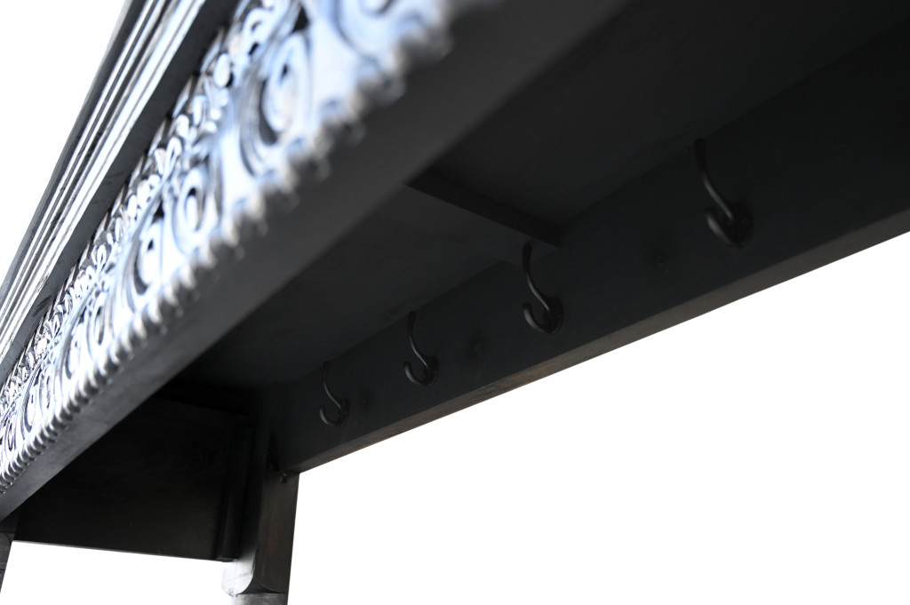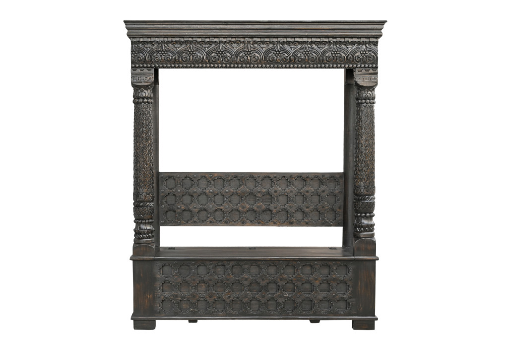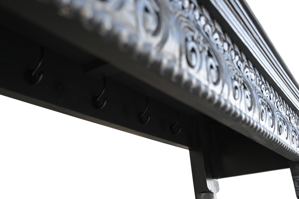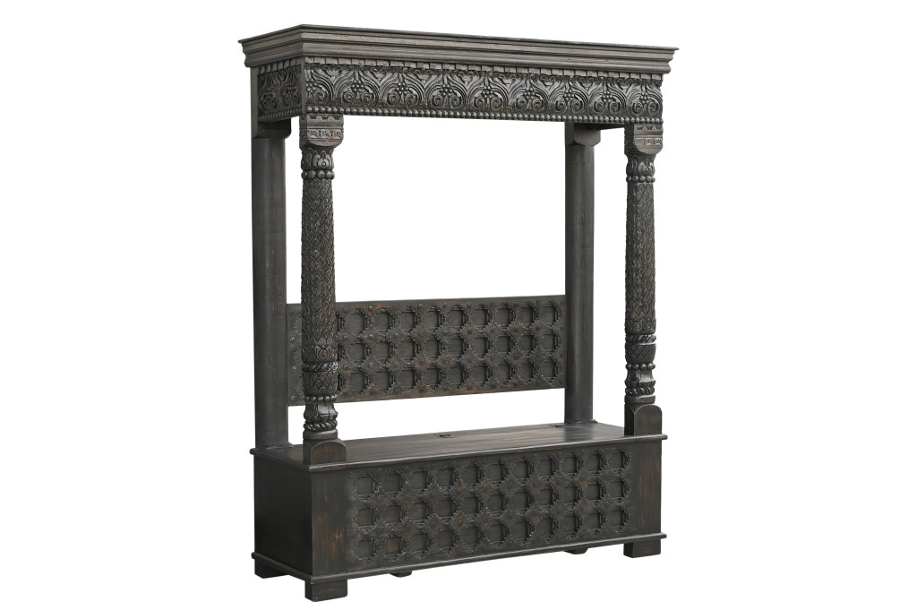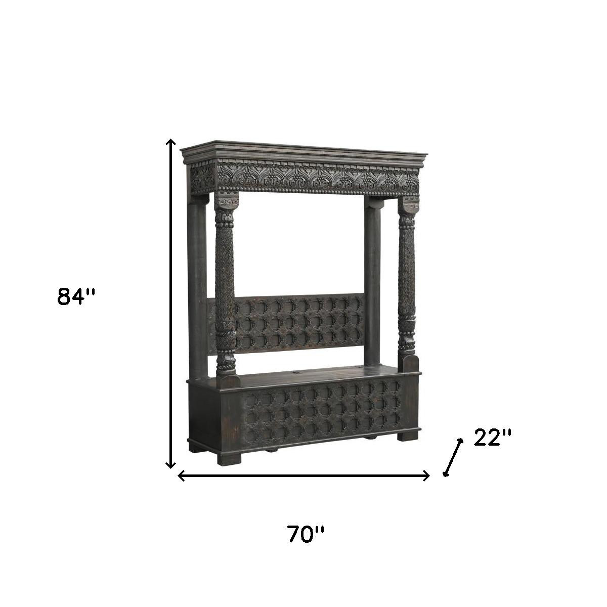 Distinctive in style the 70-inch black floral solid wood solid wood storage bench with flip top radiates a versatile charm. This bench is made from high quality solid wood in a black color throughout the base and top. A convenient flip top gives this bench multi-functionality to house hidden storage to help keep your space neat and tidy. An included back gives this bench an extra opportunity to keep you supported and comfortable. Ideal for entrance foyer, hallway, or laundry room. This bench is a great place store your keys, put on your shoes, or be a catchall on your way in or out. Easy to blend into most any room, a bench is a way to add a good looking accent to your space that can also be practical and useful. 84-inch h x 70-inch w x 22-inch d.